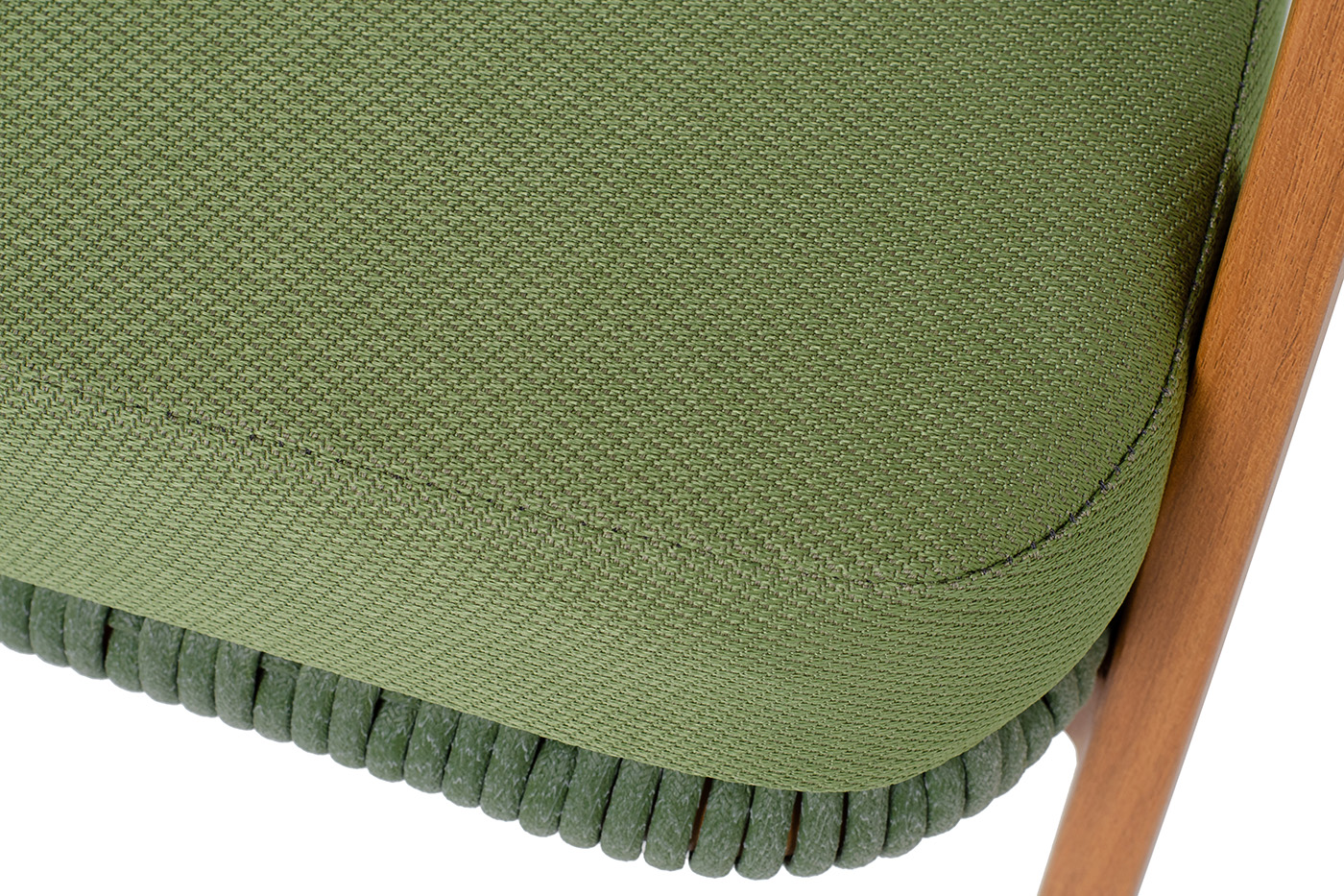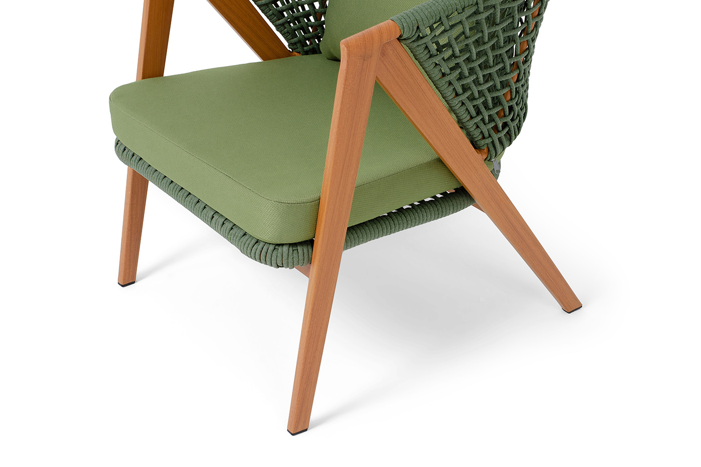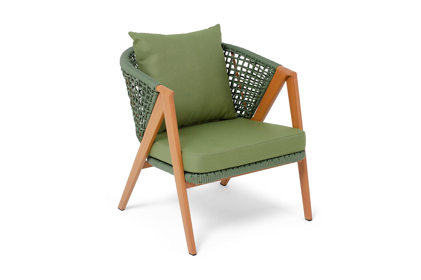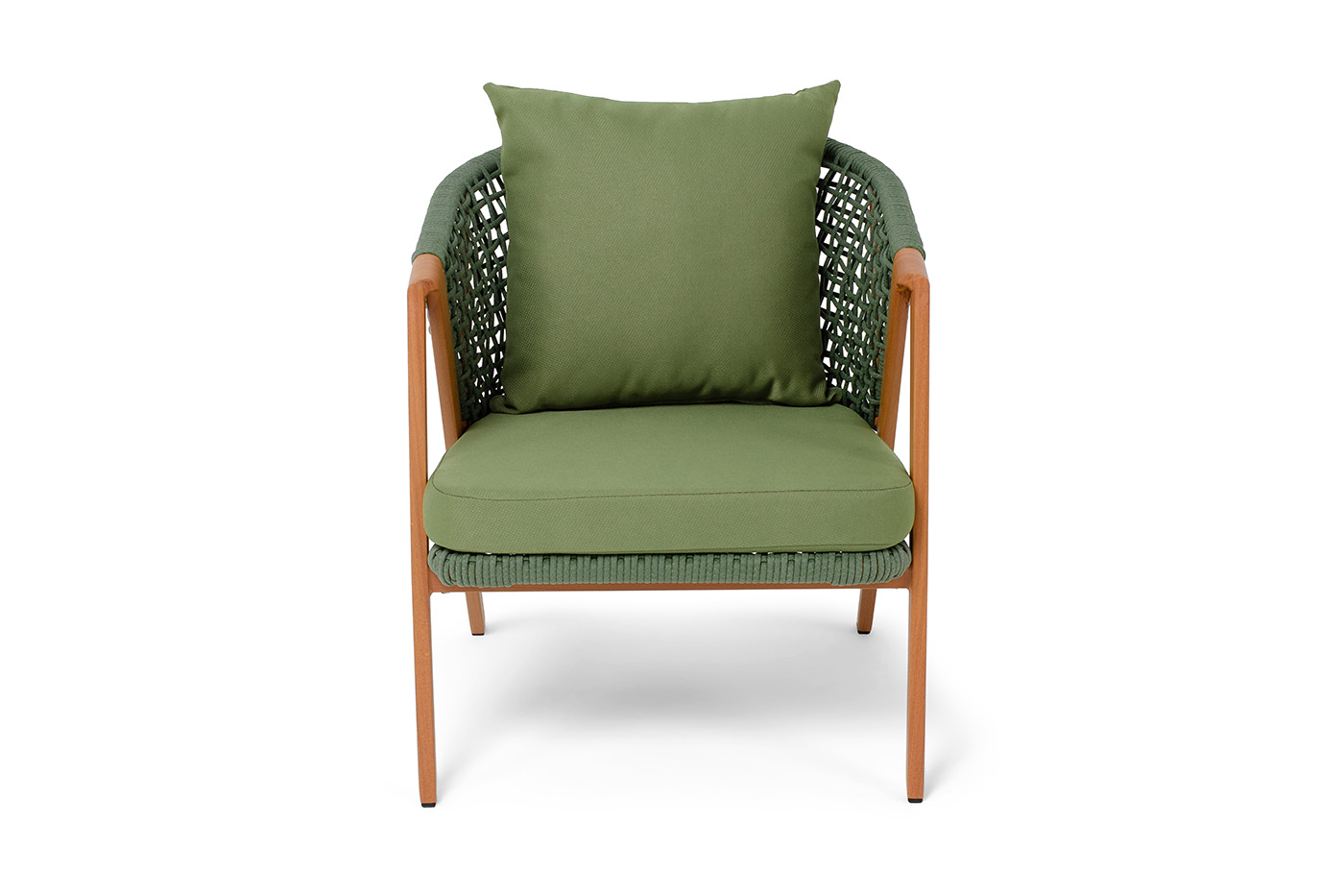 Плетеное кресло «Амстердам» для обустройства обеденной или лаунж-зоны. Изготовлен из алюминиевого каркаса, оплетенного вручную эластичными синтетическими лентами из высокопрочных полиэфирных волокон. Роуп является гипоаллергенным, прочным, износостойким и устойчивым к ультрафиолету. Приятный на ощупь и напоминает шерстяное плетение. Цвет каркаса – «под дерево», оплетки - зеленый. На ножках стула идут черные пластиковые наконечники (заглушки). Подушки состоят из наполнителя и съёмных чехлов, которые обработаны влагоотталкивающей пропиткой зеленого цвета. Чехол можно стирать в стиральной машине с использованием порошков. Размеры плетеного кресла: 640×770×735 мм.