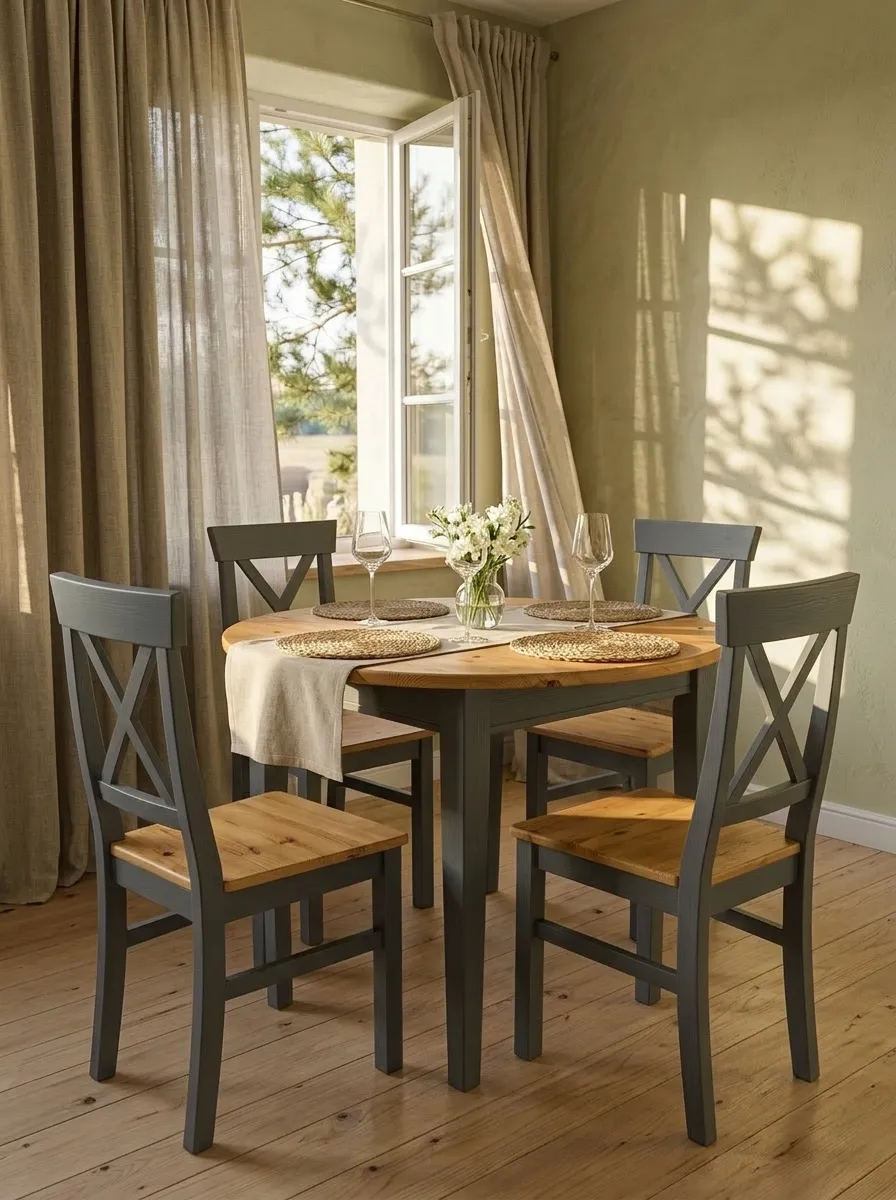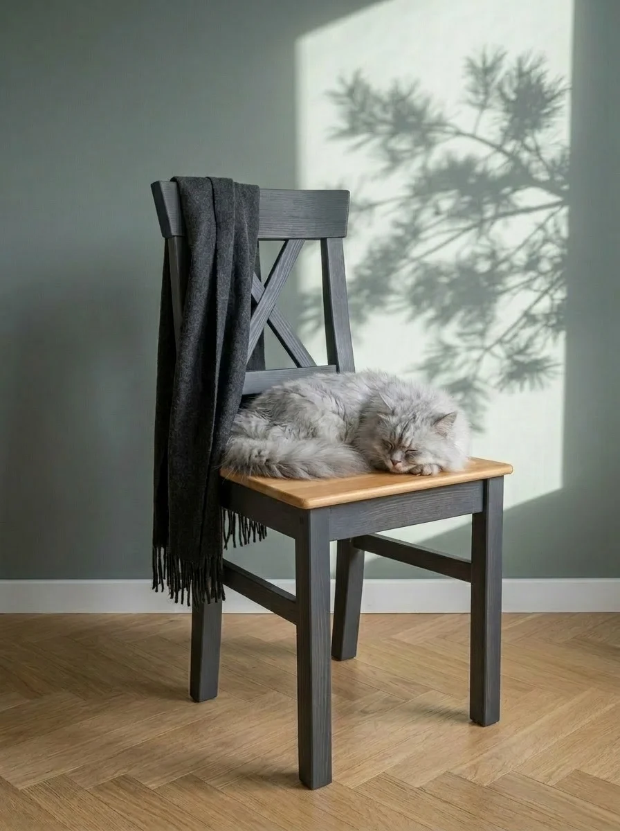 Высота сиденья 45 см. Покрытие - укрывистый серый воск 7012, сиденье бейц/масло, структура древесины почти не просматривается.