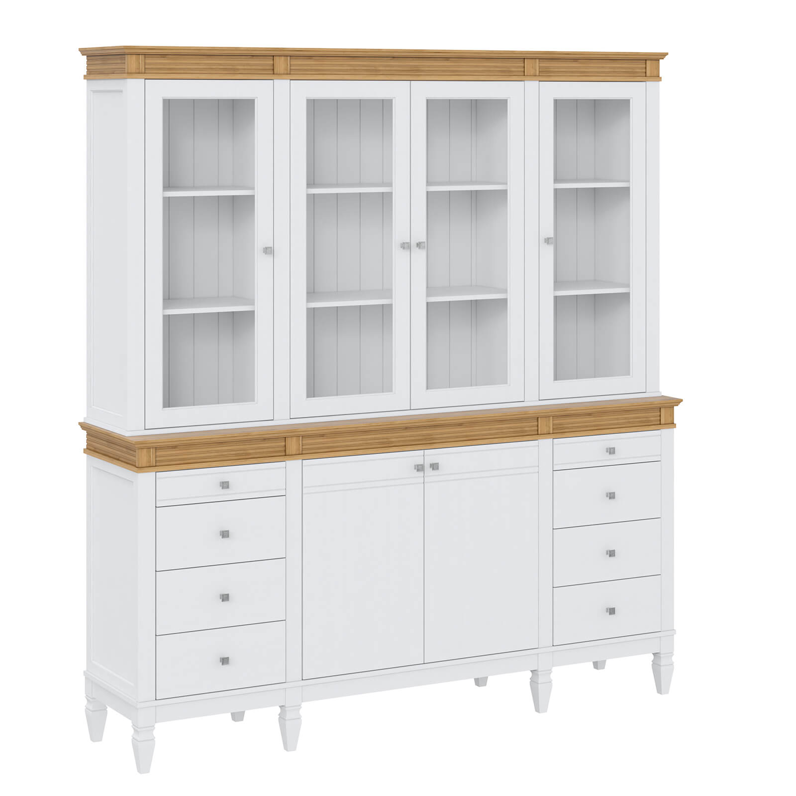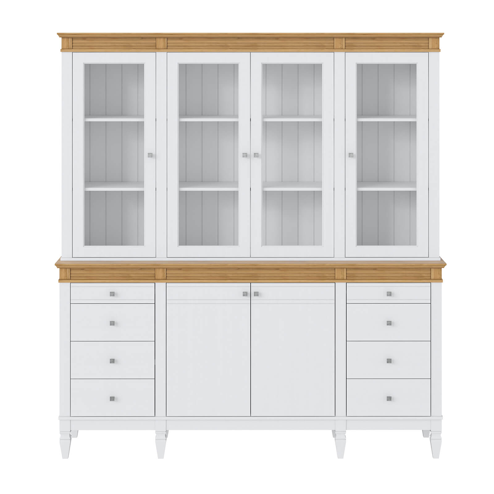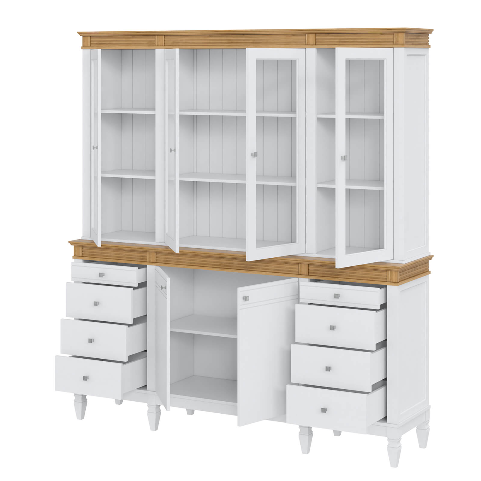 Буфет визуально разделен на 3 секции, которые укомплектованы шестью полками сверху за четырьмя стеклянными распашными дверями, одной широкой полкой снизу за двумя распашными дверями и восемь ящиков.