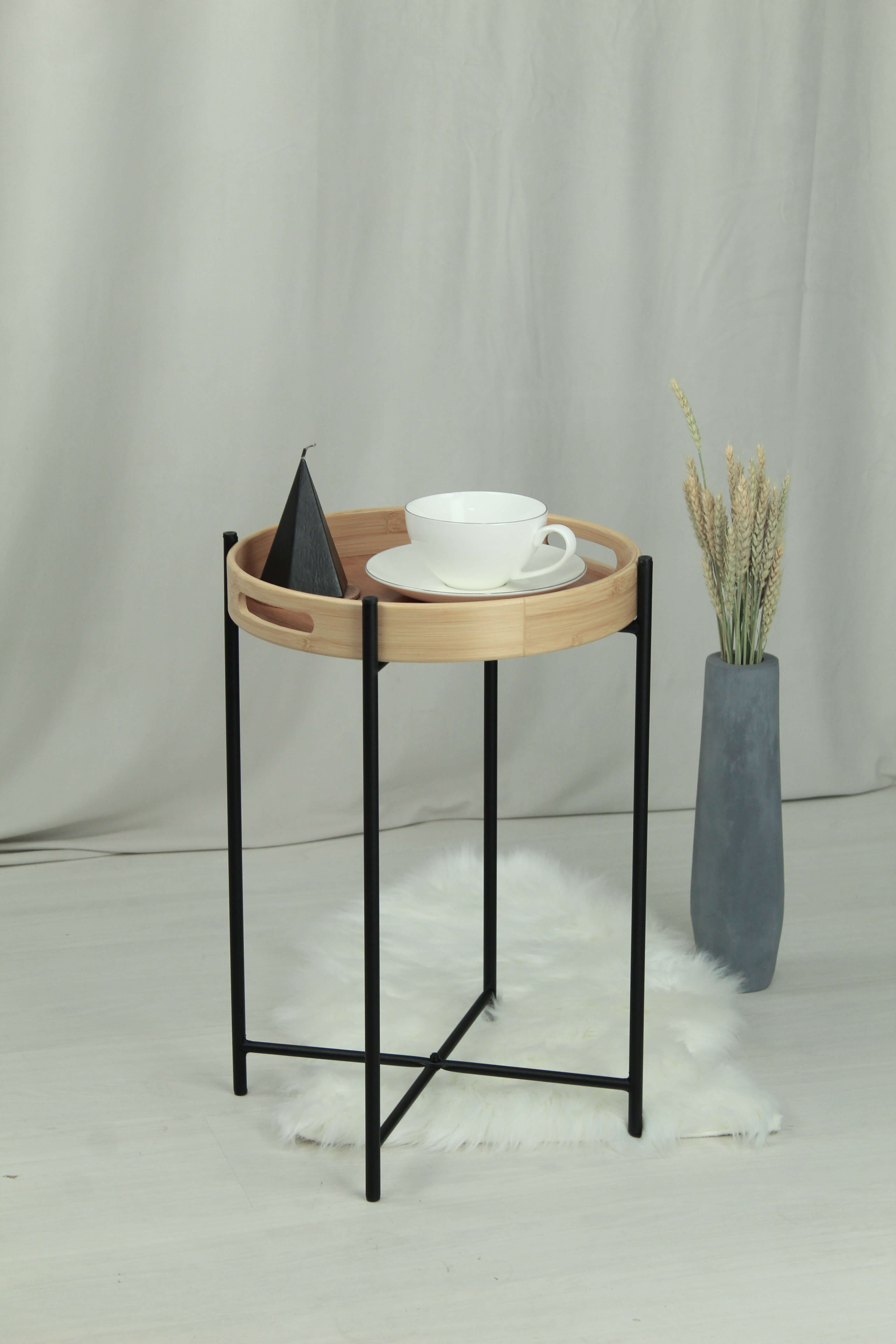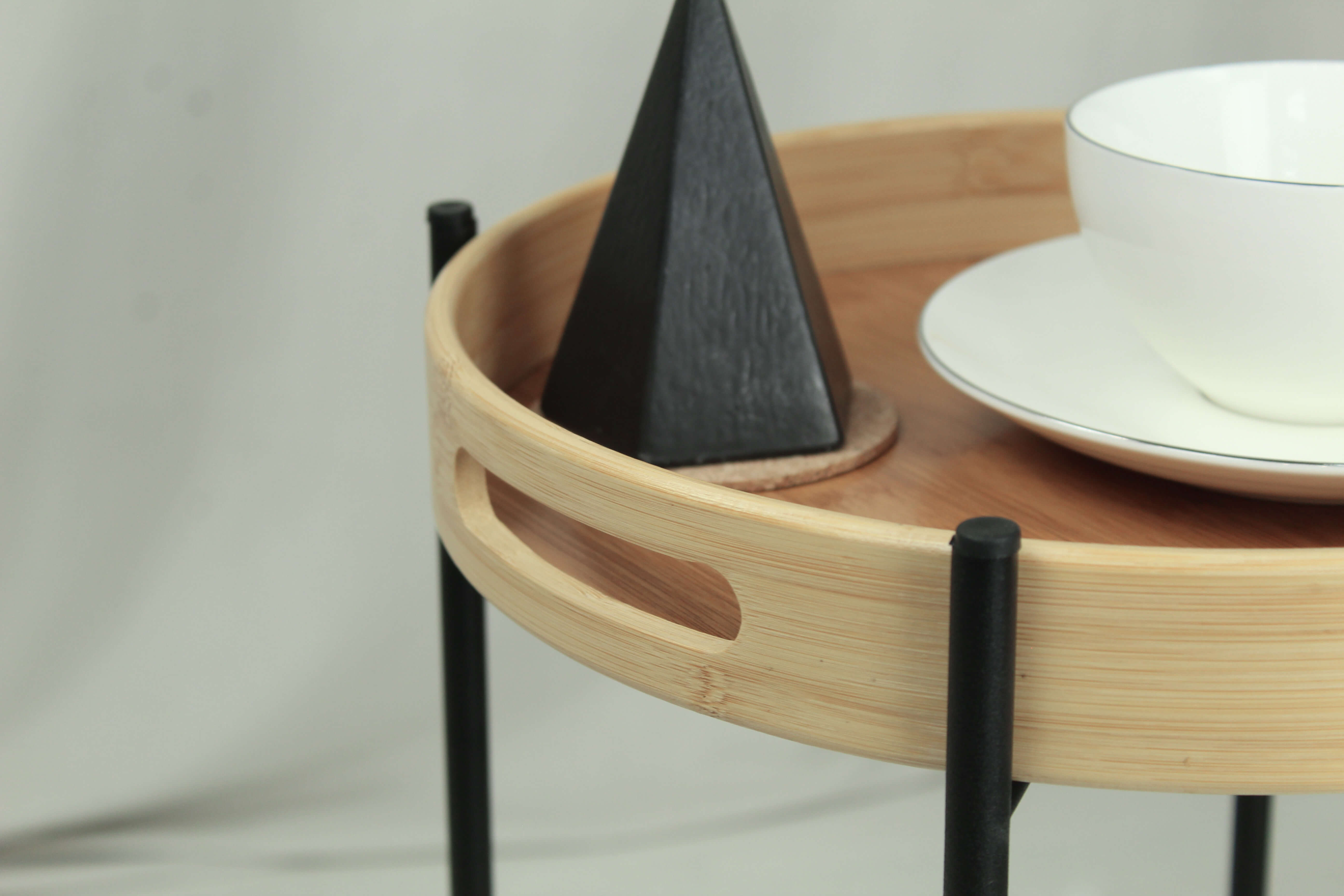 металлический каркас и столешница окрашены порошковой краской, устойчивой к механическому воздействию. Выполнен из трубы 12 мм. Столешница-поднос (диаметр 350 мм) выполнена из натурального бамбука. Толщина основания столешницы - 3 мм.