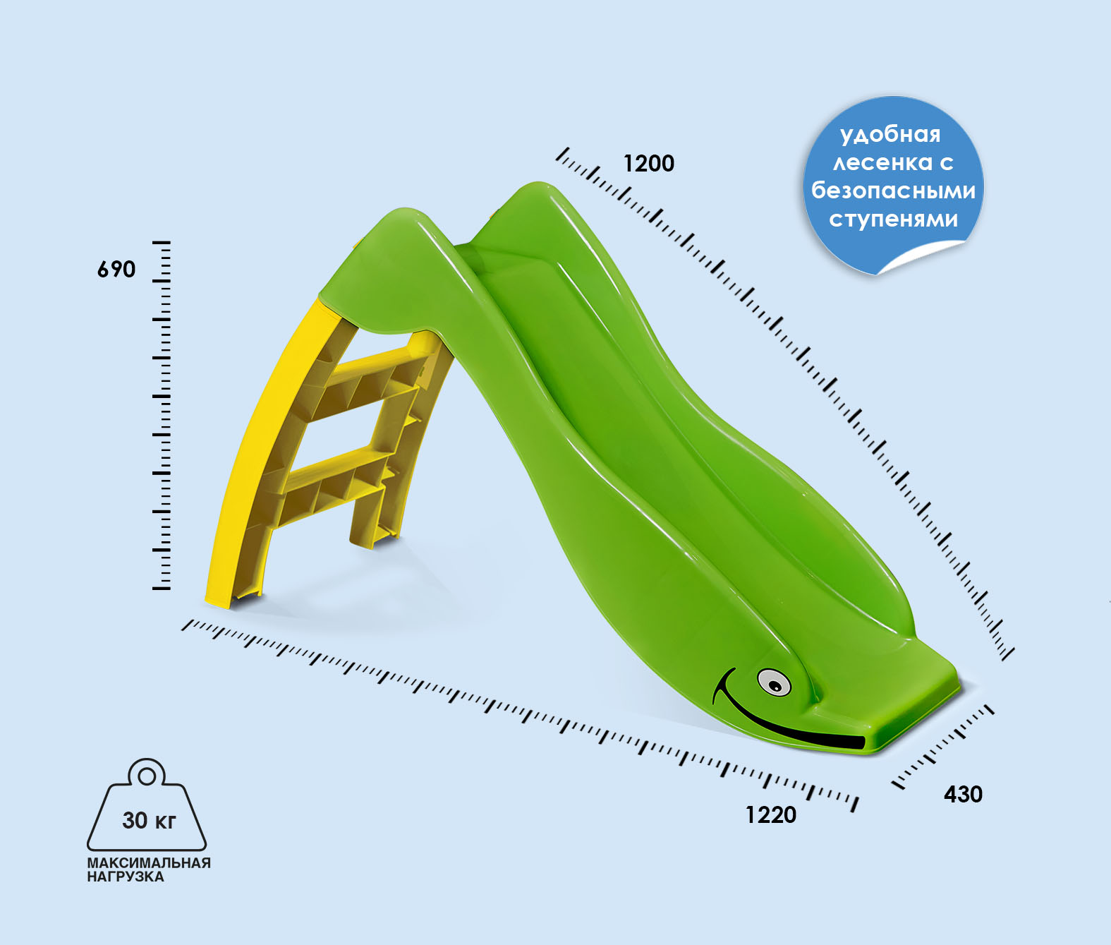 Горка оснащена удобной лесенкой с безопасными ступенями, устойчива и надежна. А когда ребенок будет скатываться, установленные по бокам бортики, не позволят упасть.