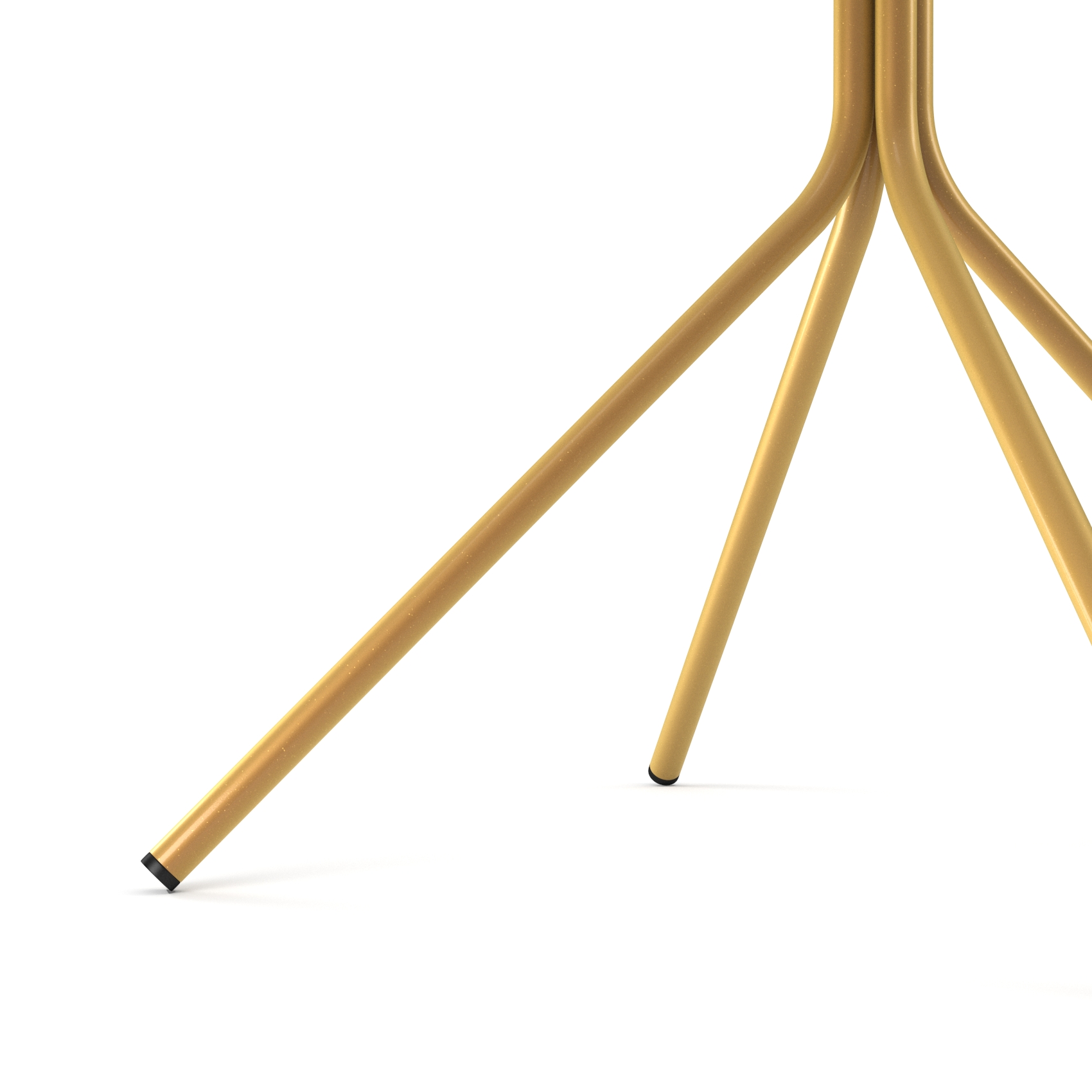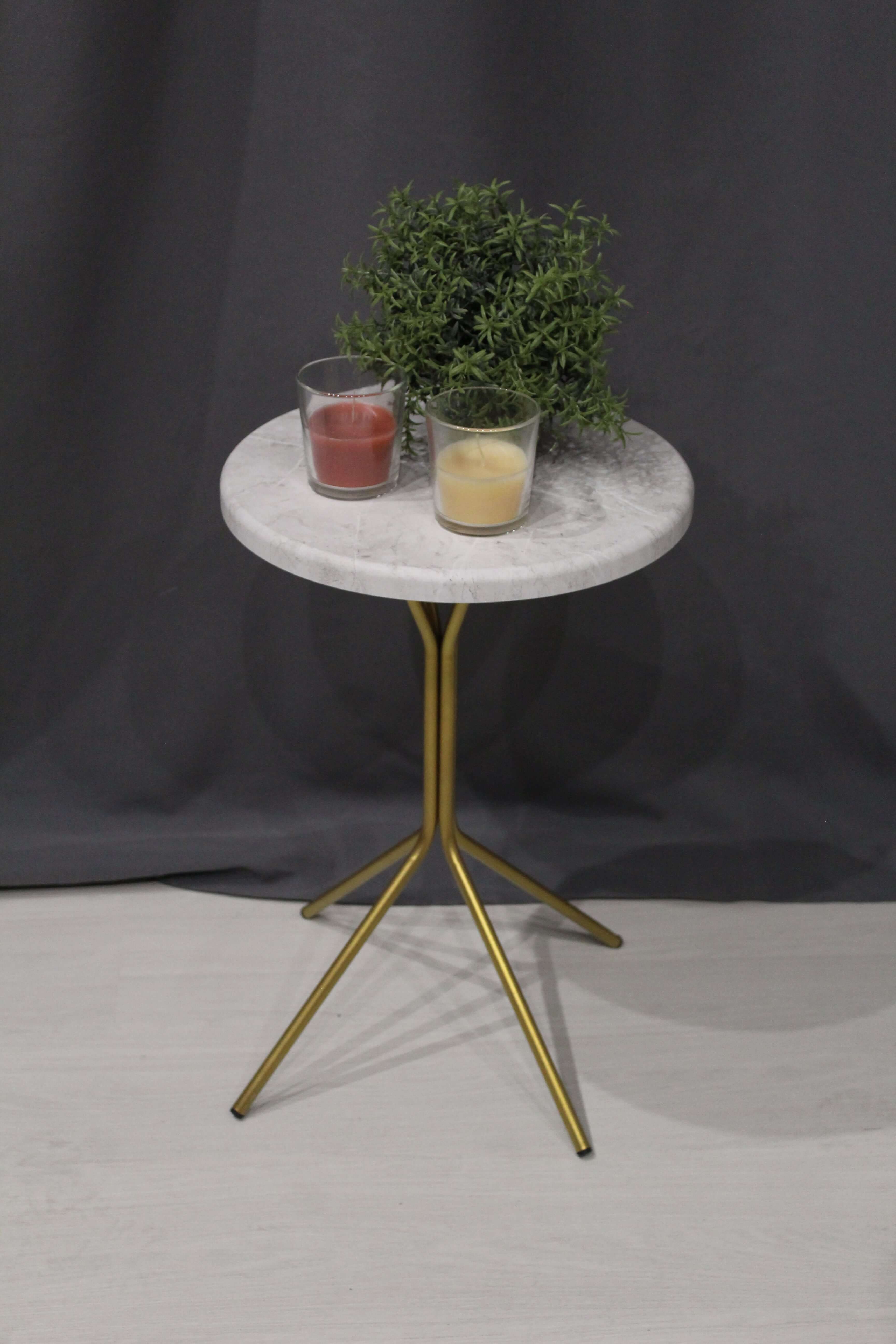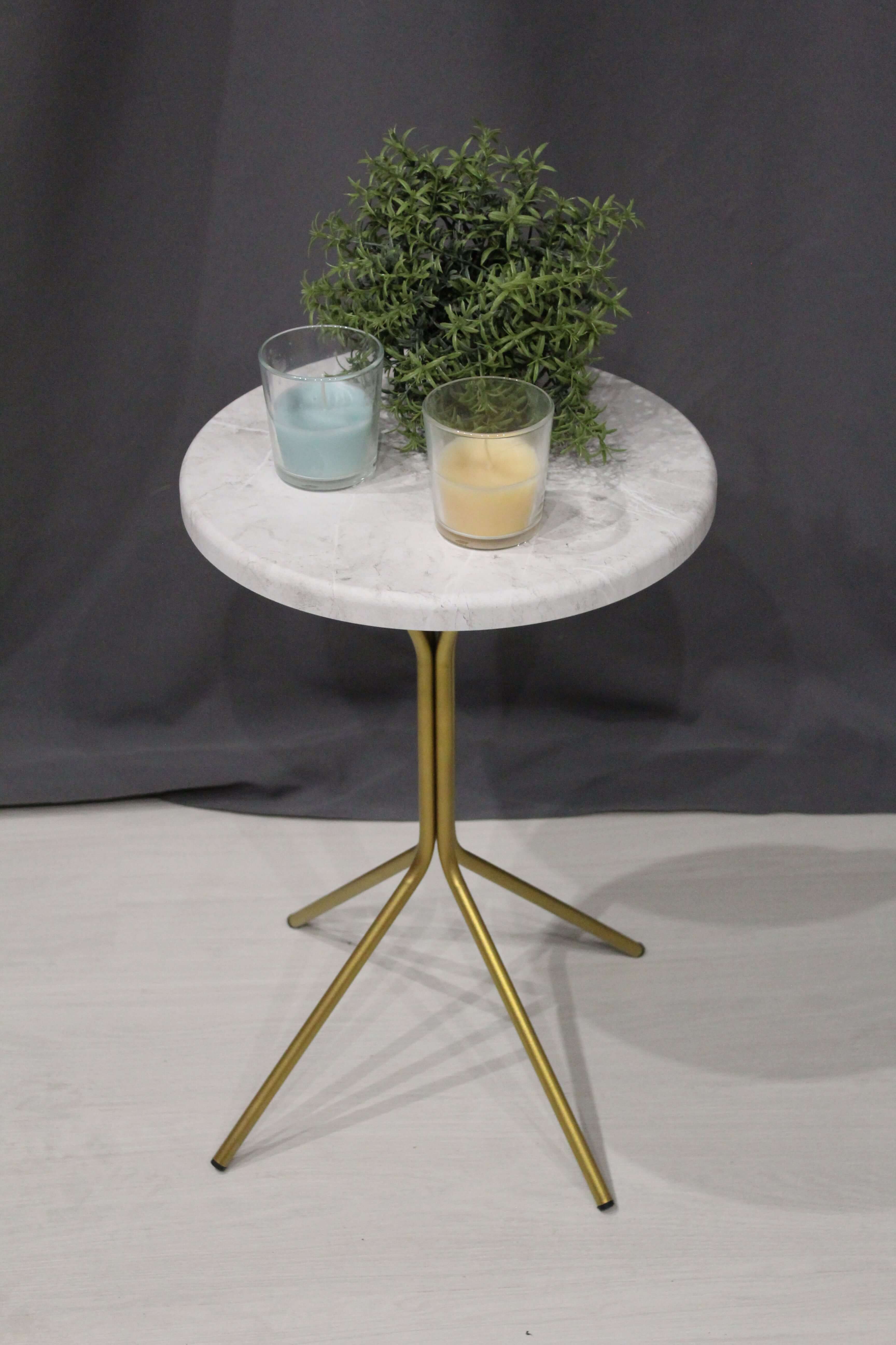 В качестве дизайнерского хода основание столика покрашено в благородный золотой цвет. Столешница из МДФ смотрится аккуратно и привлекательно, поскольку имеет плавный закругленный переход от лицевой поверхности к боковым кромкам. Рисунок под натуральный мрамор добавит нотку естественности.