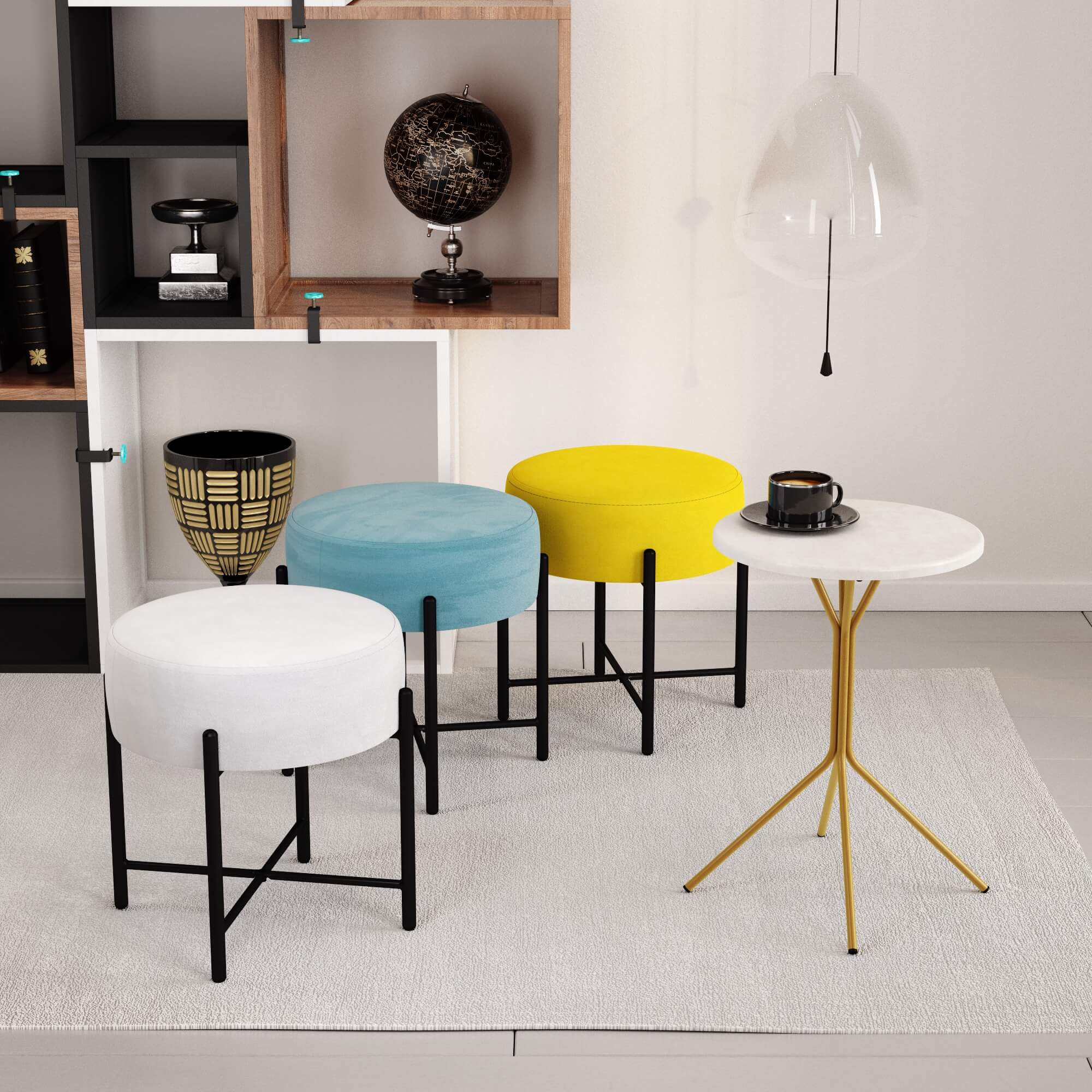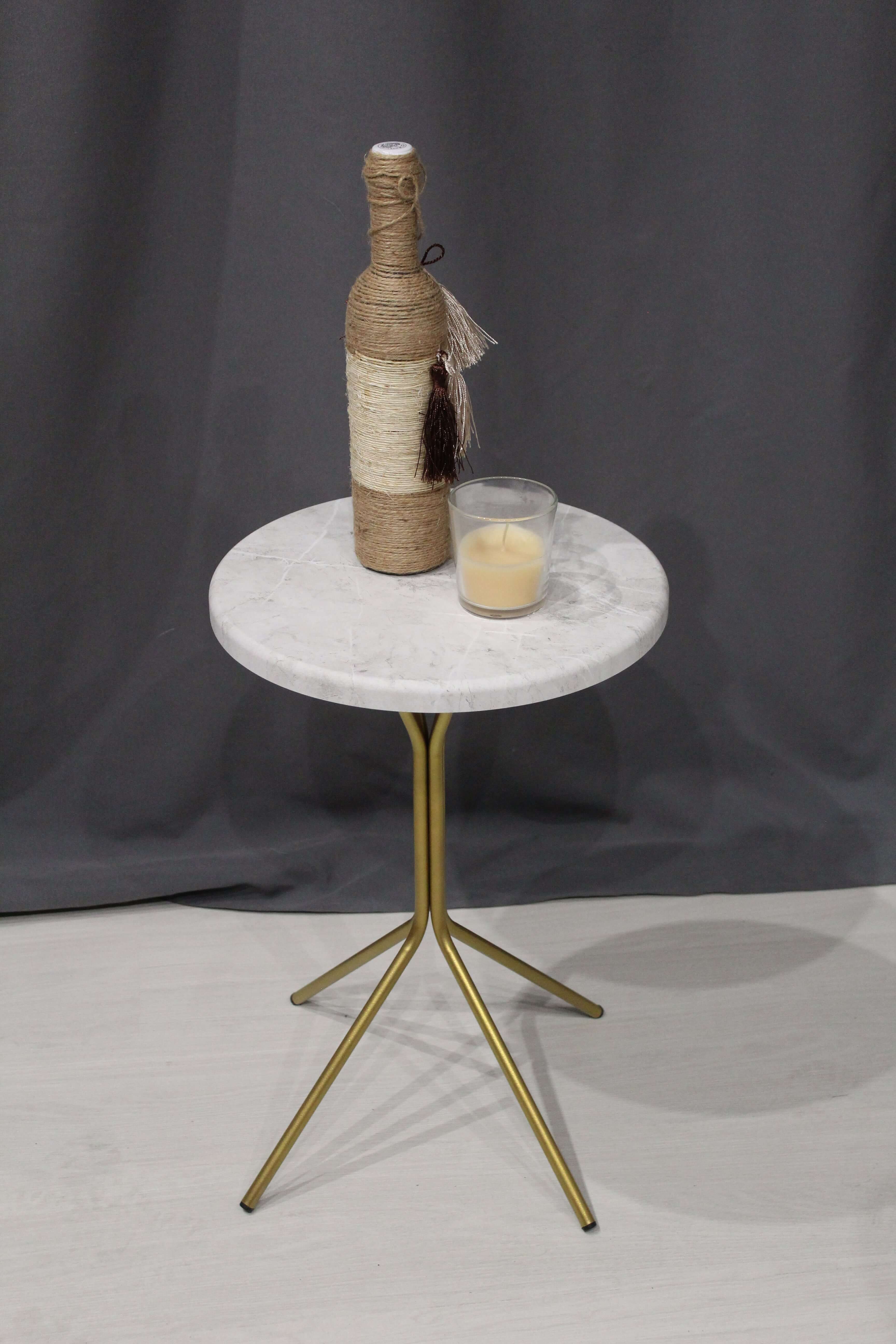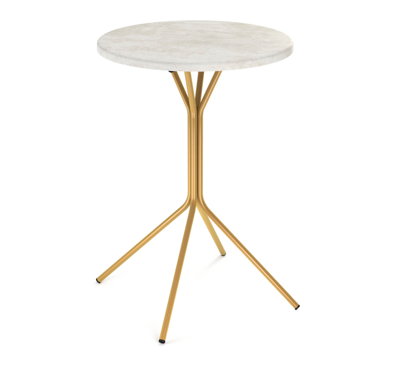 В качестве дизайнерского хода основание столика покрашено в благородный золотой цвет. Столешница из МДФ смотрится аккуратно и привлекательно, поскольку имеет плавный закругленный переход от лицевой поверхности к боковым кромкам. Рисунок под натуральный мрамор добавит нотку естественности.