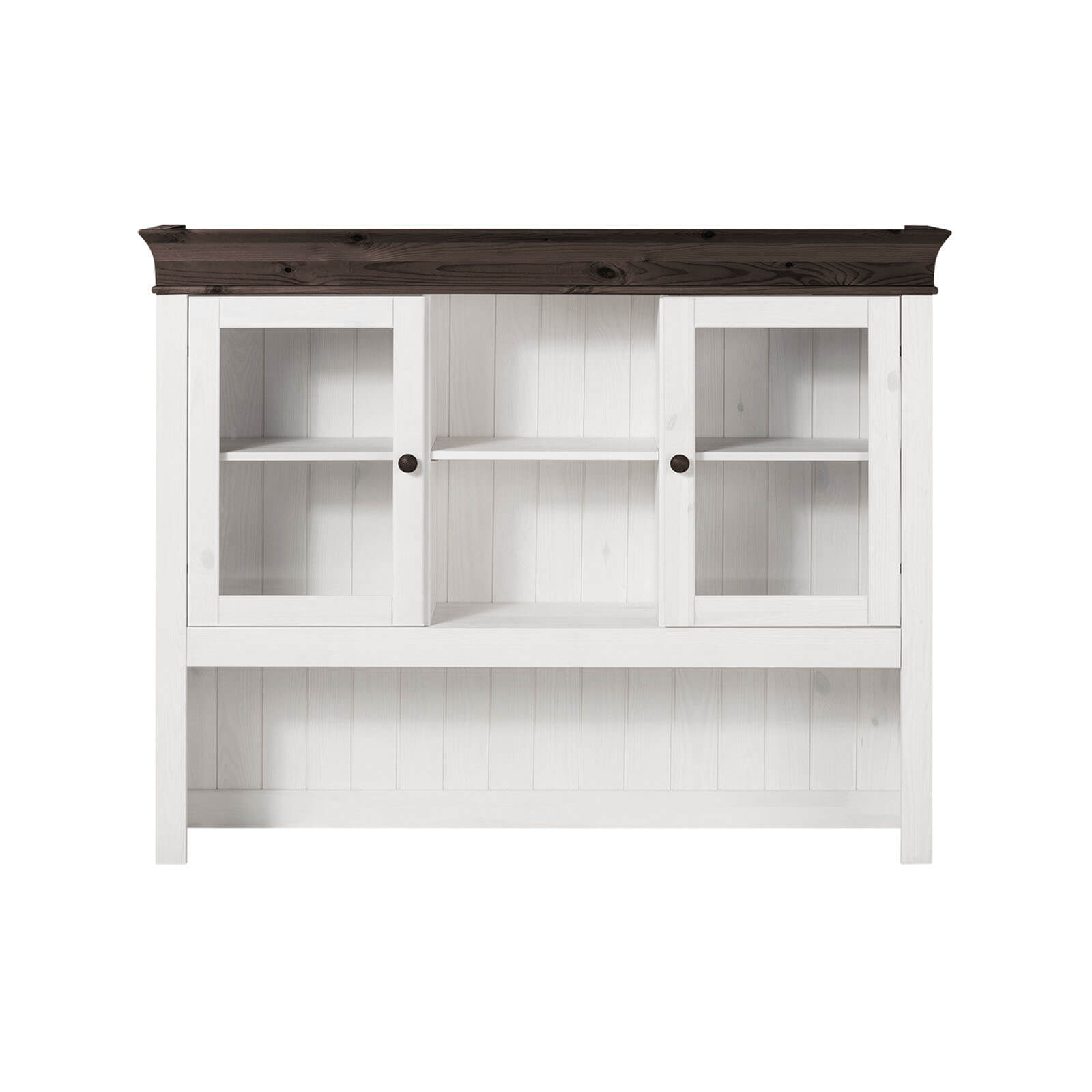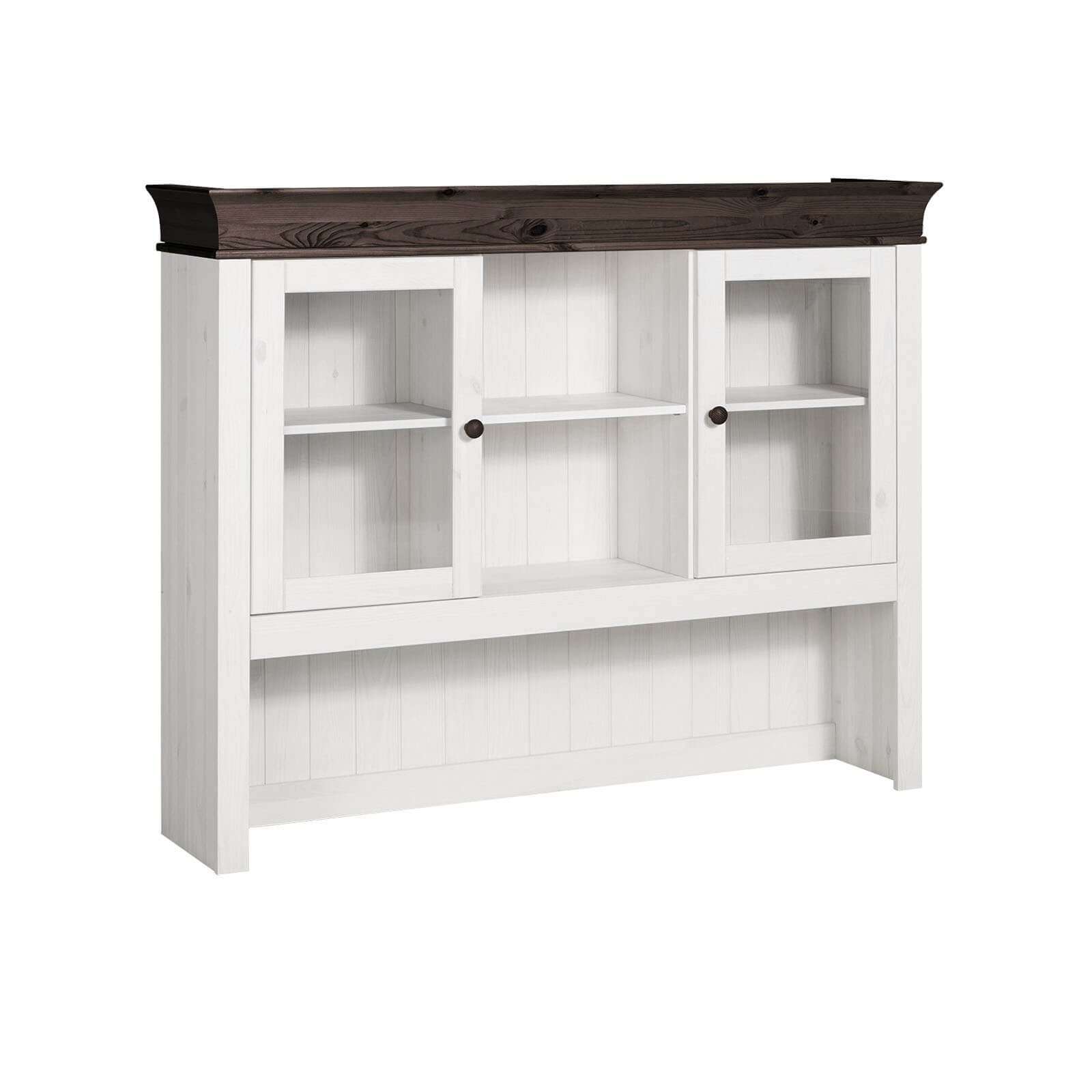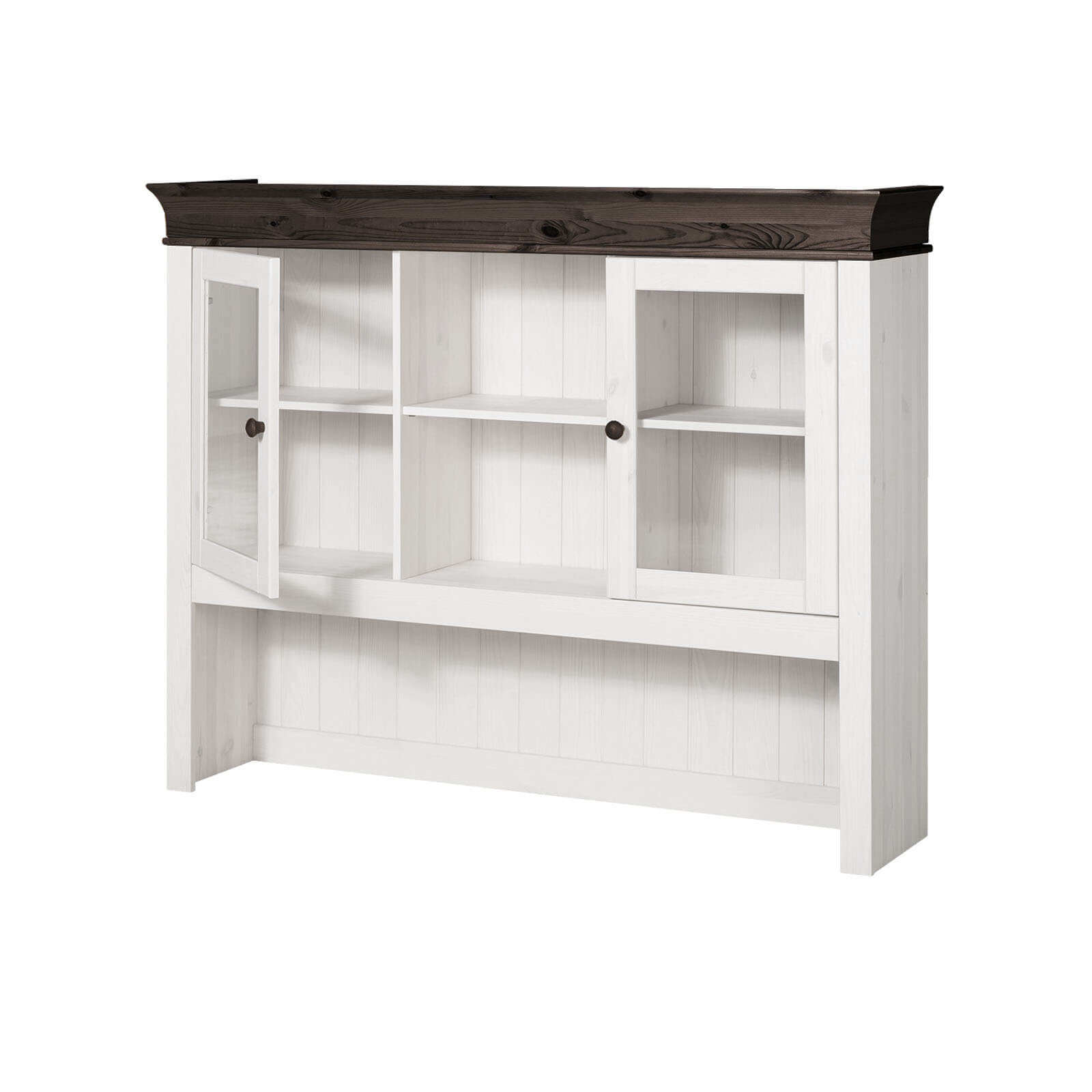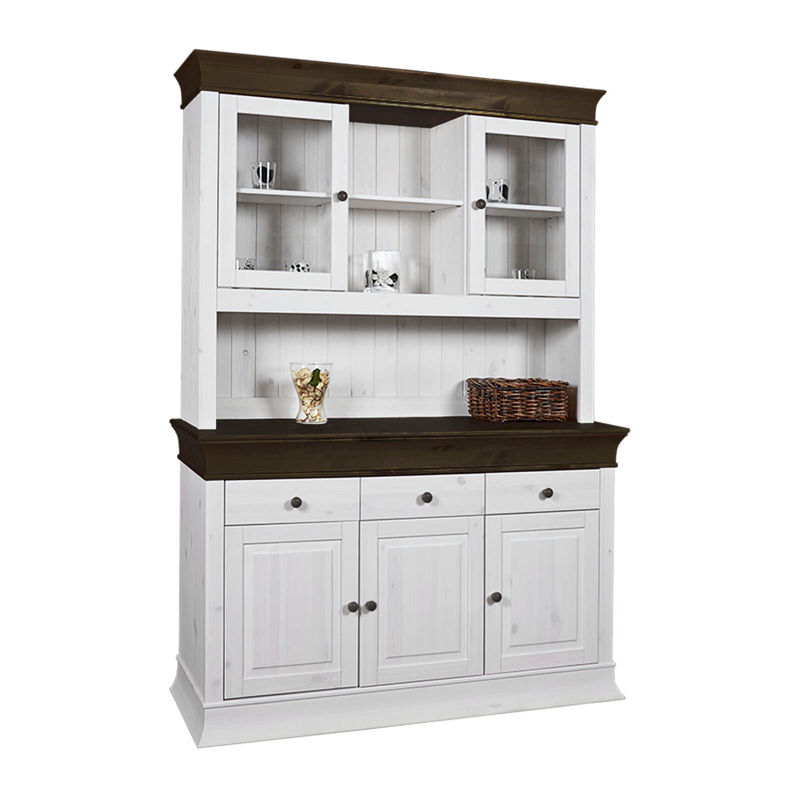 Классический дизайн с современными элементами. Нижняя часть представляет собой трехстворчатый шкаф с удобной столешницей, верхняя имеет открытые и закрытые стеклянными дверцами отделения для посуды.