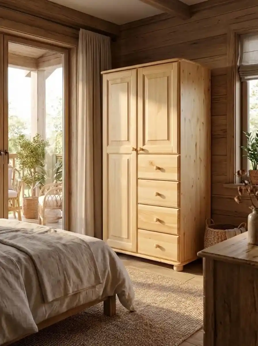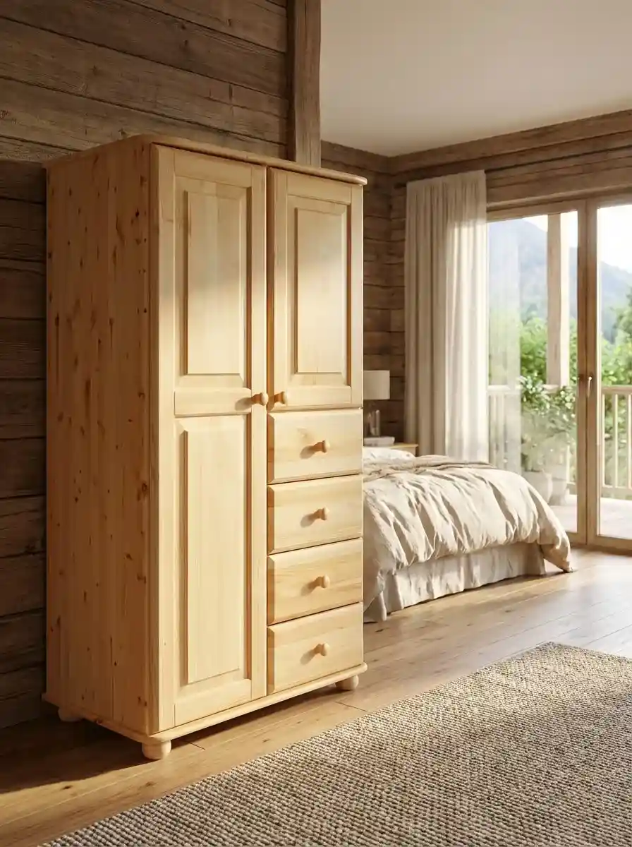 При изготовлении шкафа, кроме натурального дерева, не применяется никакие другие материалы, наподобие дсп, мдф, которые могли бы поставить под сомнение экологичность изделия. Кроме того, сосна также отличается и привлекательным внешним видом. Кому-то может показаться, что сосновая древесина недостаточно прочная и долговечная, однако эта проблема давно осталась в прошлом, поскольку современные технологии обработки дерева позволяют любой материал сделать удивительно износостойким и защитить его практически от любых внешних воздействий, которые могут разрушить необработанное дерево.