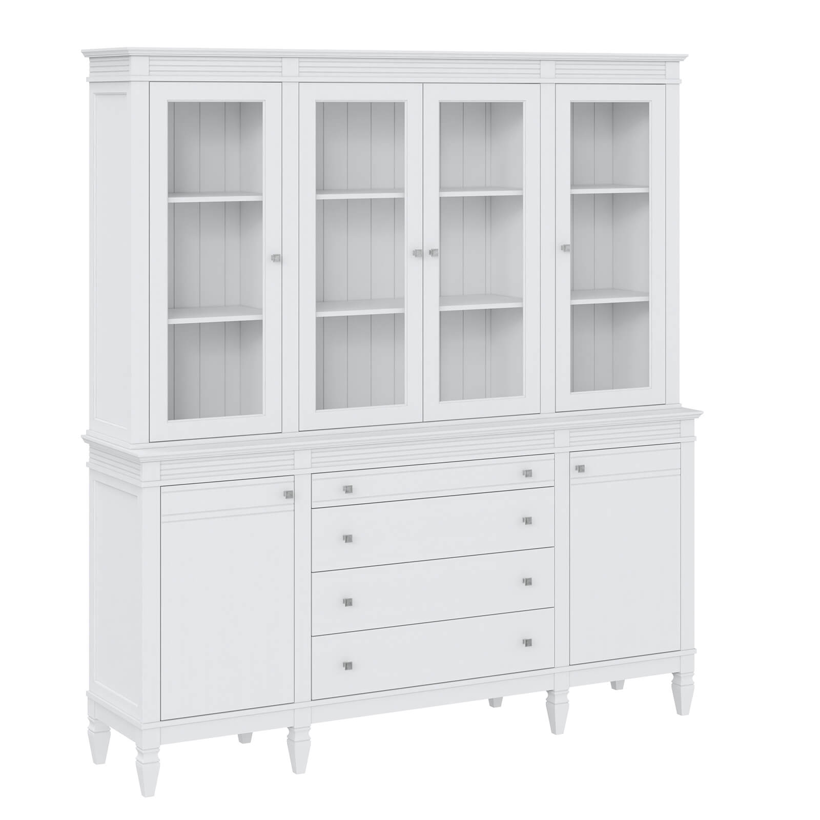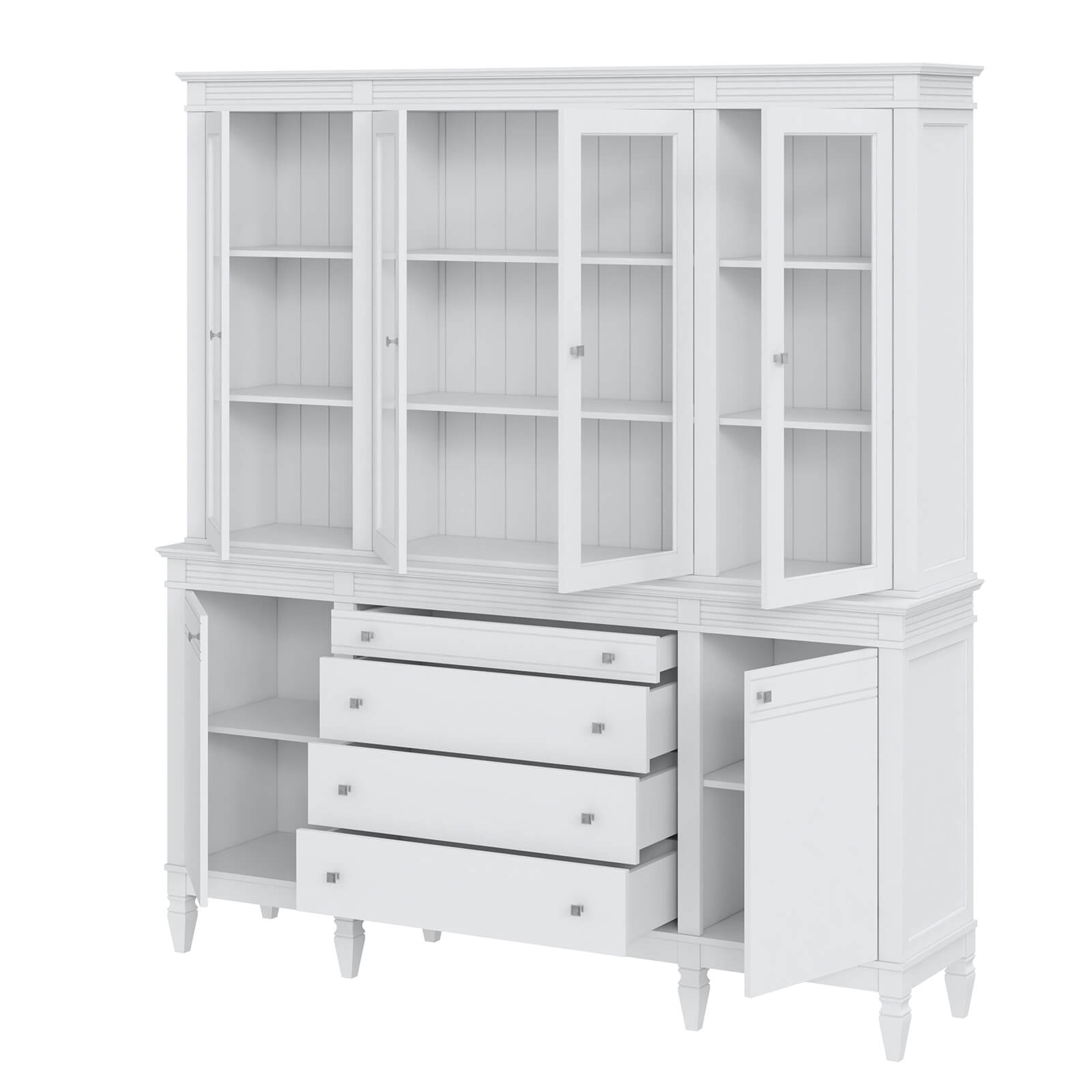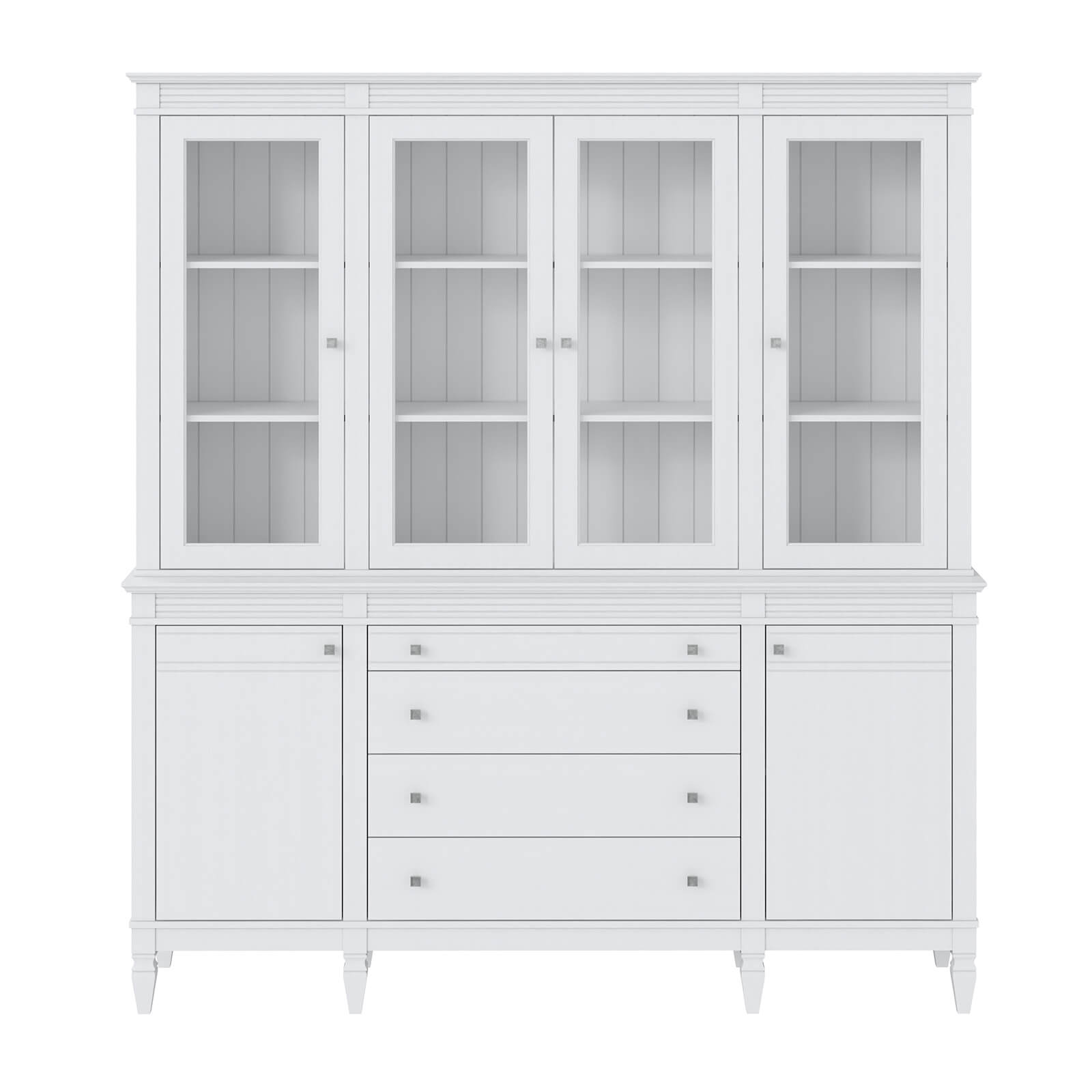 двумя полками снизу за двумя распашными дверями и четырьмя ящиками.