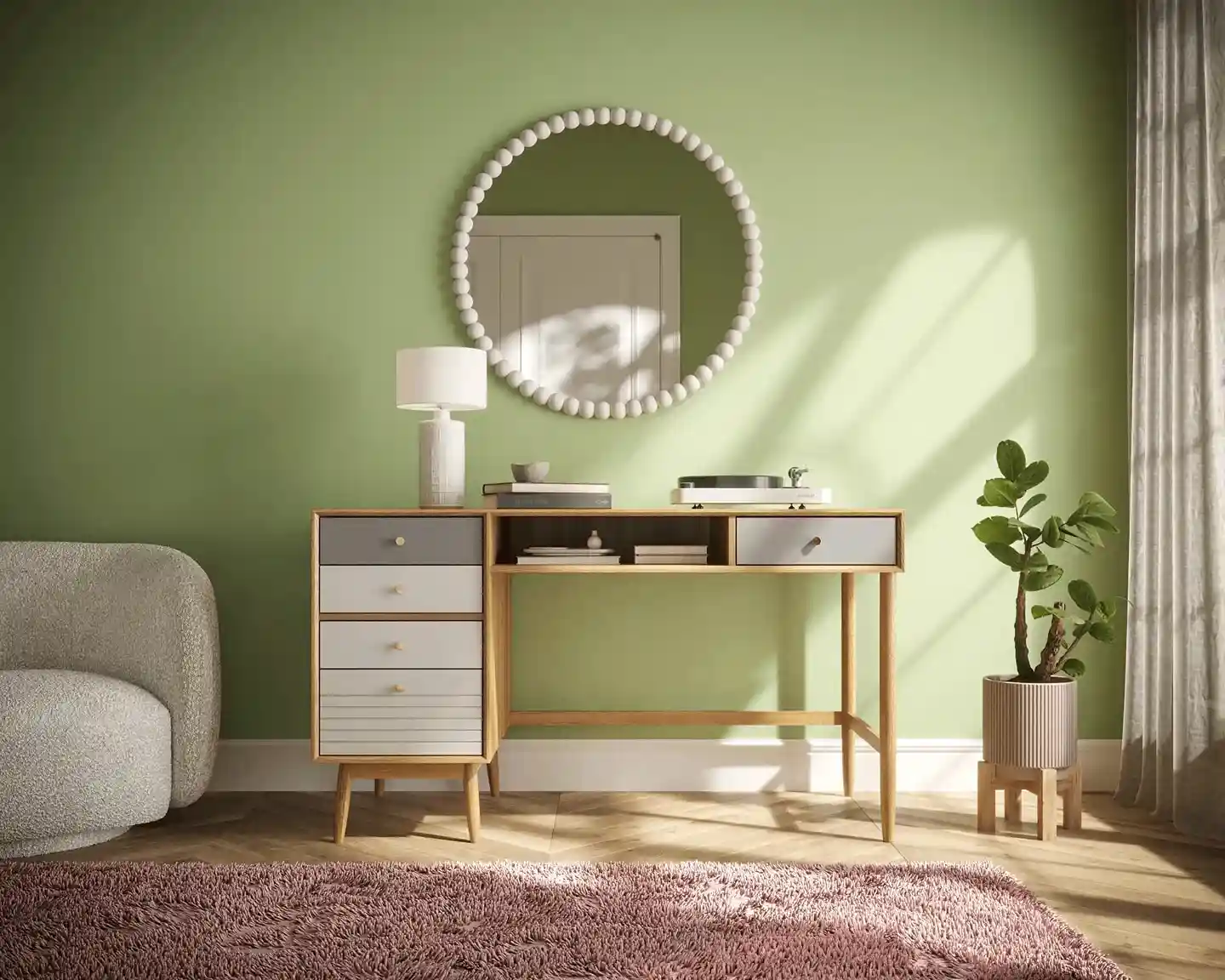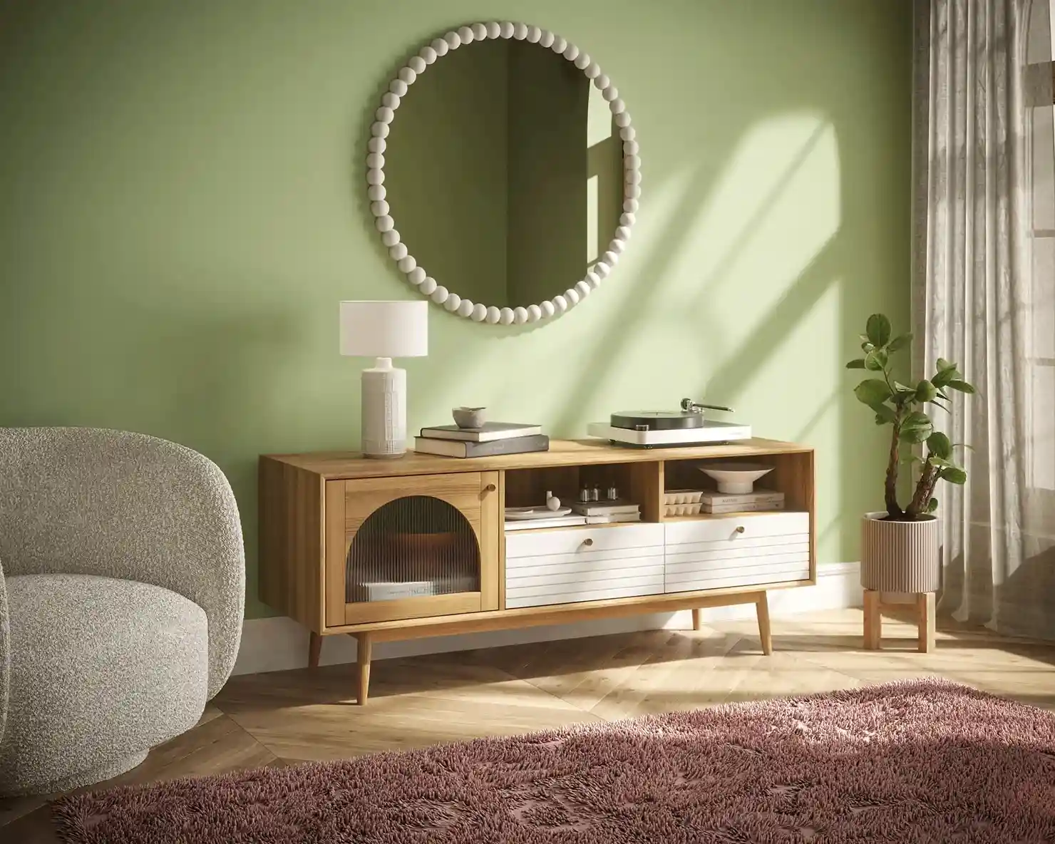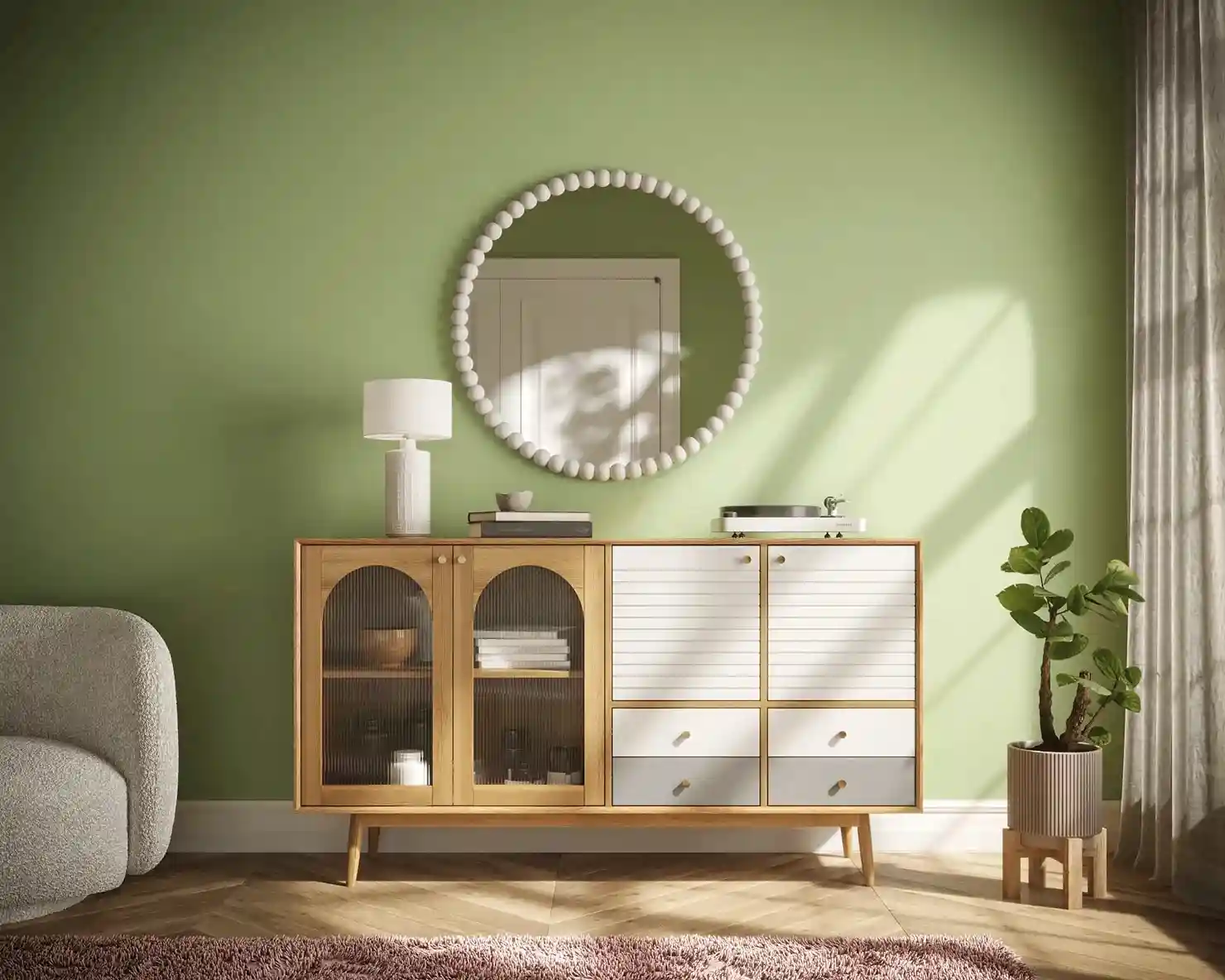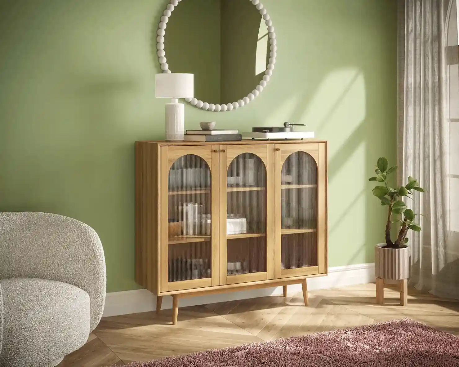 В дизайне используется три цвета. Дверцы в естественном древесном цвете, а фасады ящиков белые или серые. При этом у одного предмета могут быть ящики и с гладкими, и с фрезерованными фасадами. В дверцах сделаны окна в виде арок, застекленные матовыми рифлеными стеклами. На дверках и ящиках круглые металлические ручки золотистого цвета.