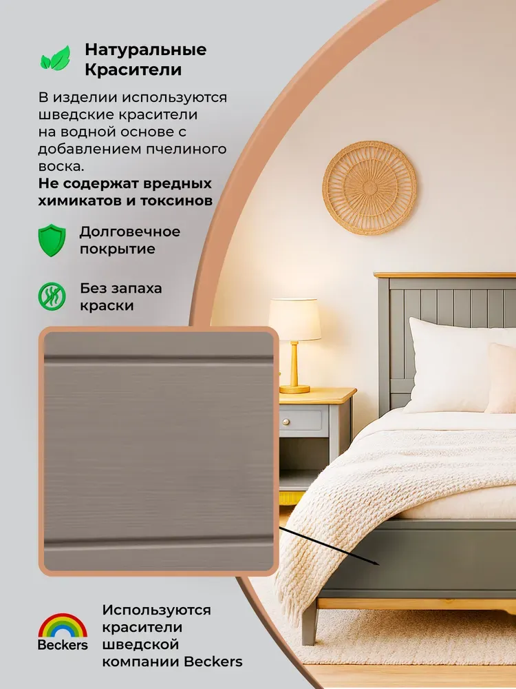 В дизайне кровати гармонично объединены два цвета: корпус окрашен в серый цвет (RAL 7046), а декоративные детали изголовья и изножья в цвет антик, через который видна красивая древесная текстура. Для любителей светлых тонов предлагается такая же модель, но в отделке «белый/антик». Кровать «Пенни» станет центральным элементом спальни в скандинавском, классическом стиле или в стиле прованс.