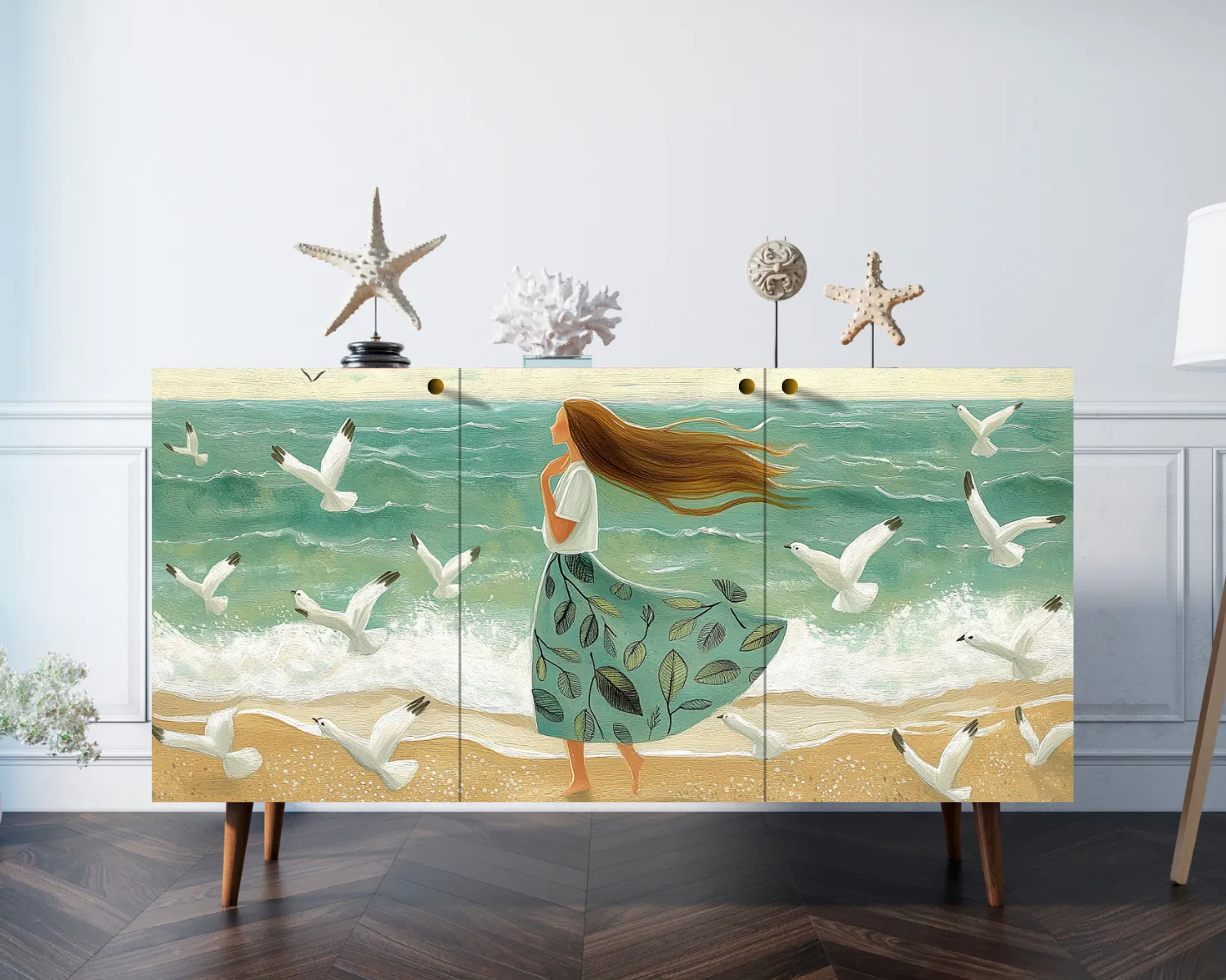 Комод с тремя дверками "Девушка и чайки" арт BB01/Art05