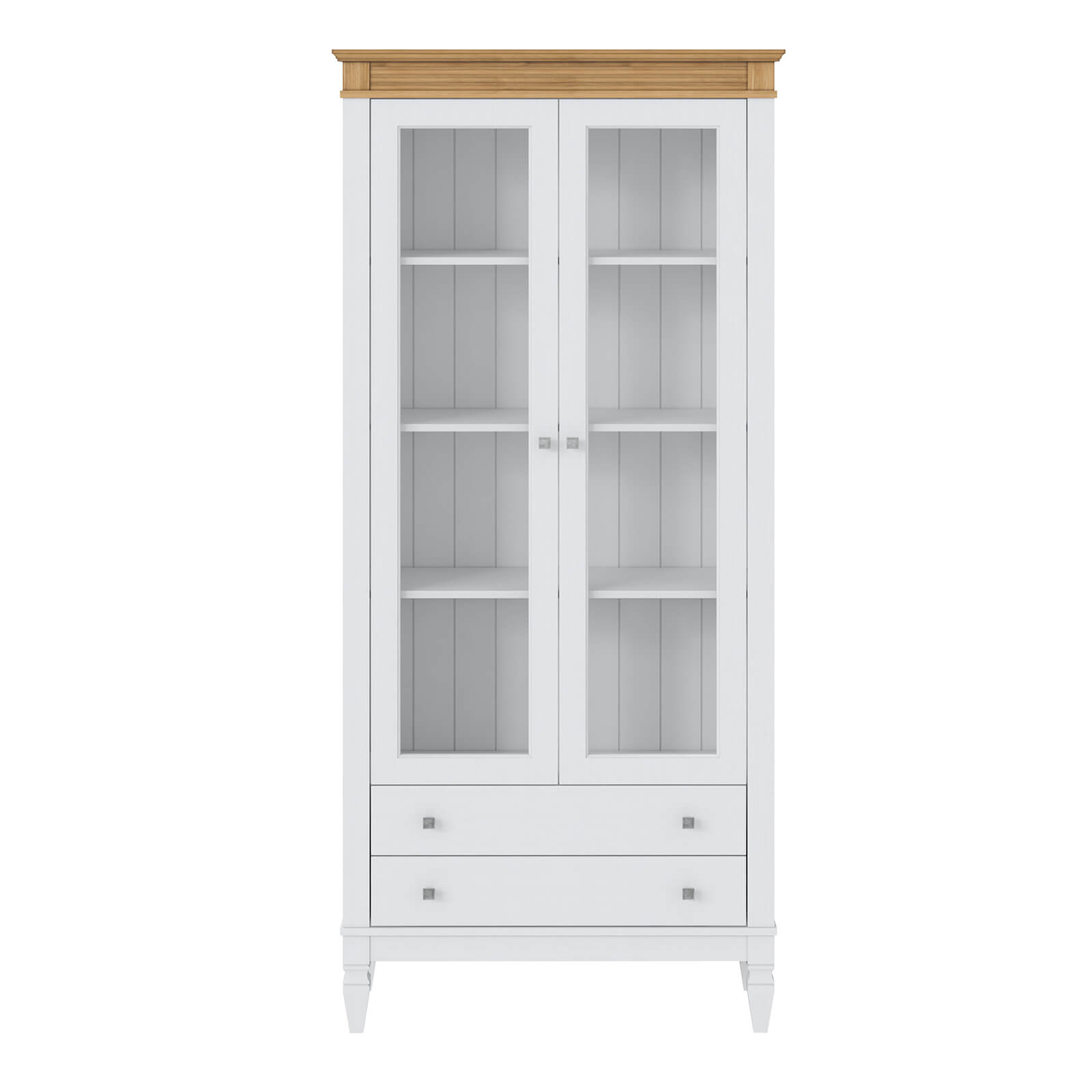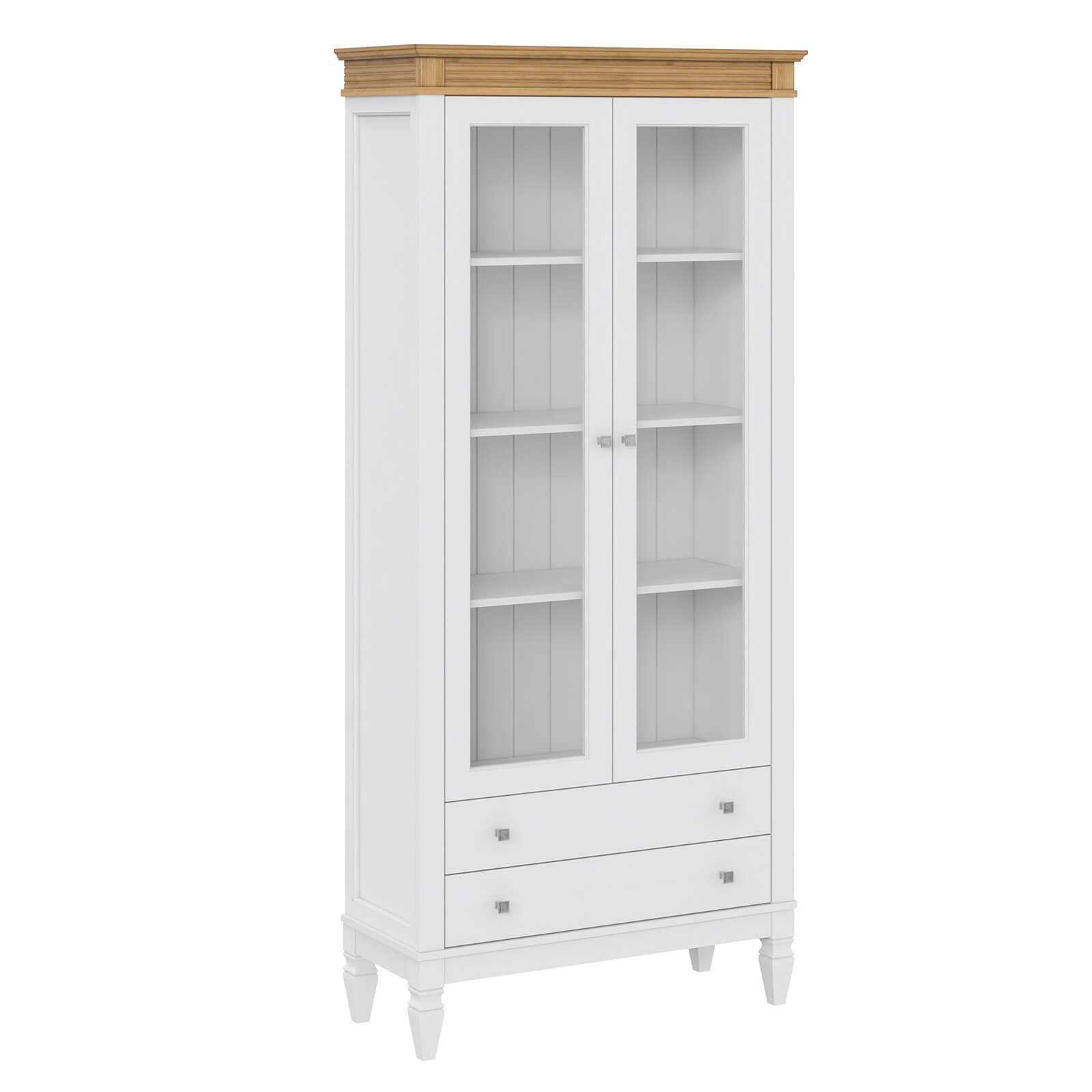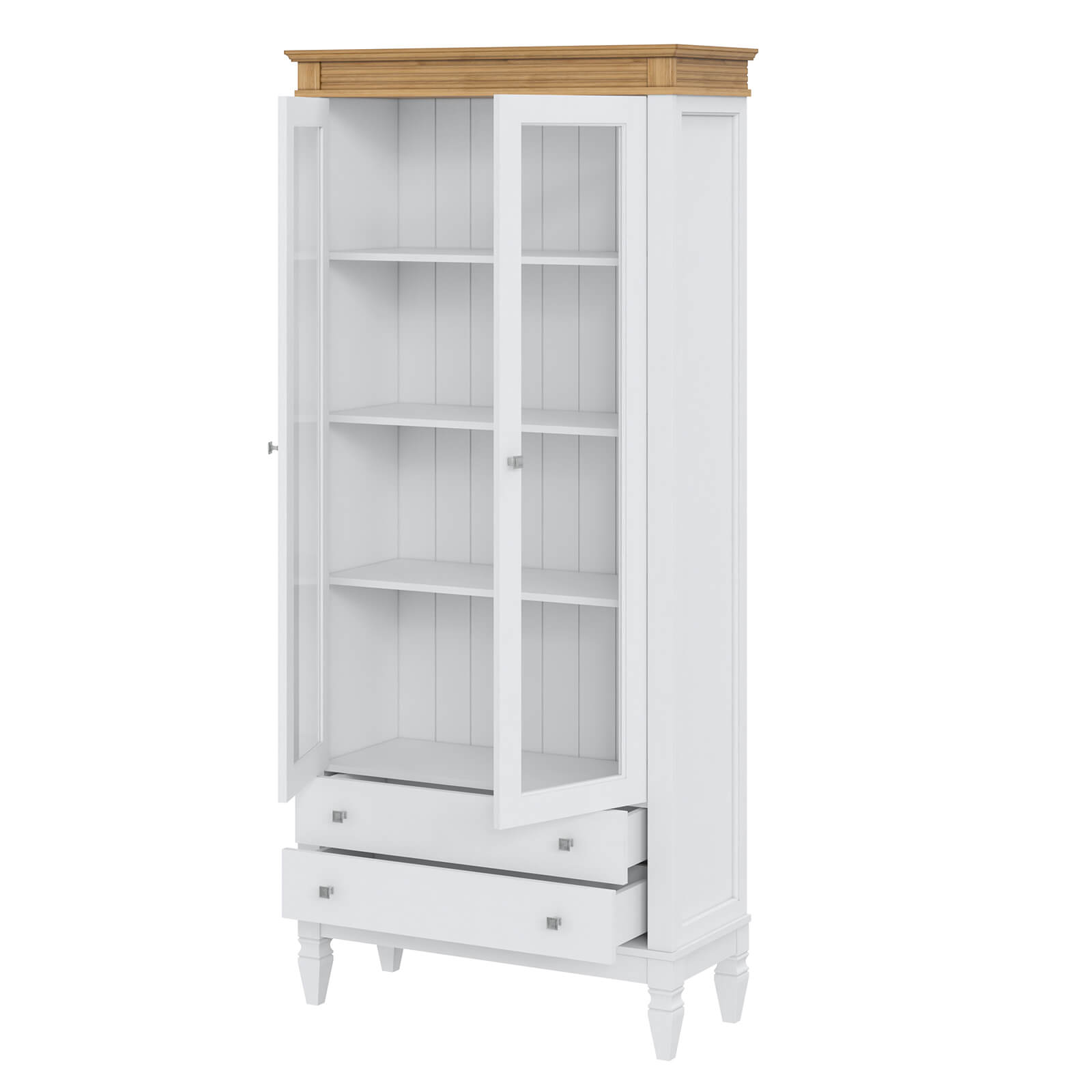 Оснащен двумя ящиками и четырьмя вместительными полками за стеклянными распашными дверями.