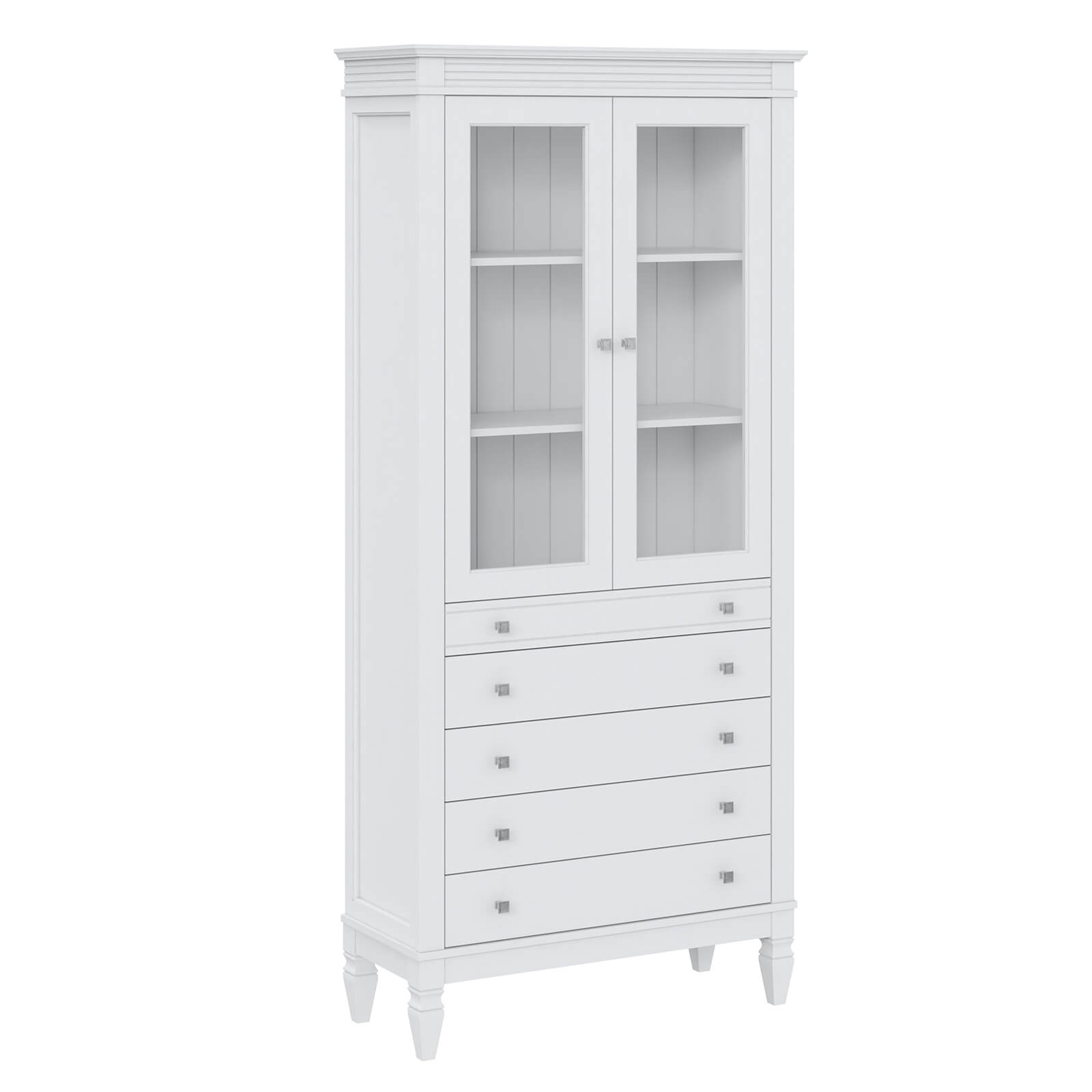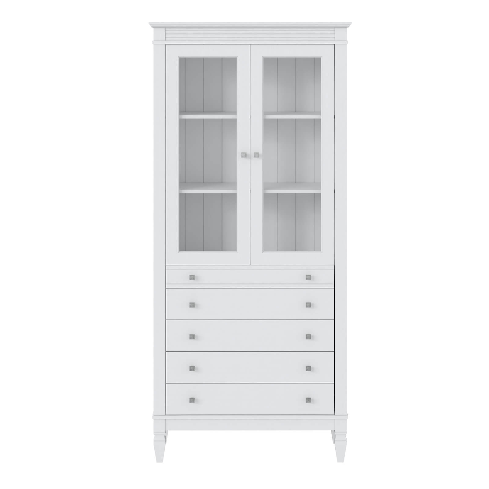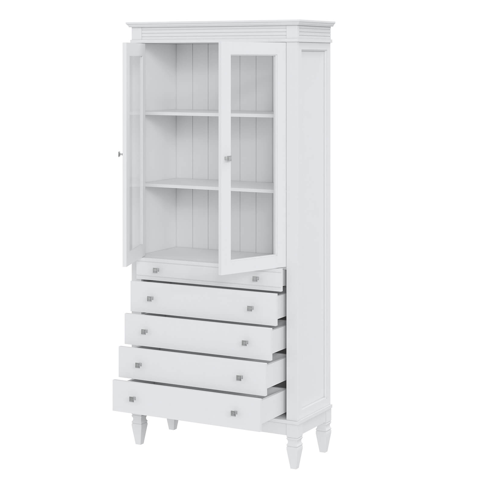 Оснащен пятью ящиками и двумя стеклянными дверками.