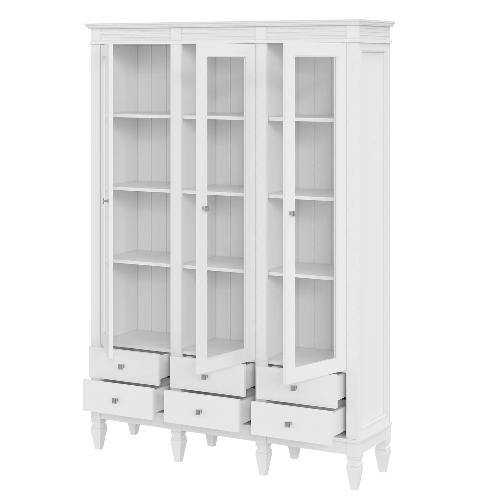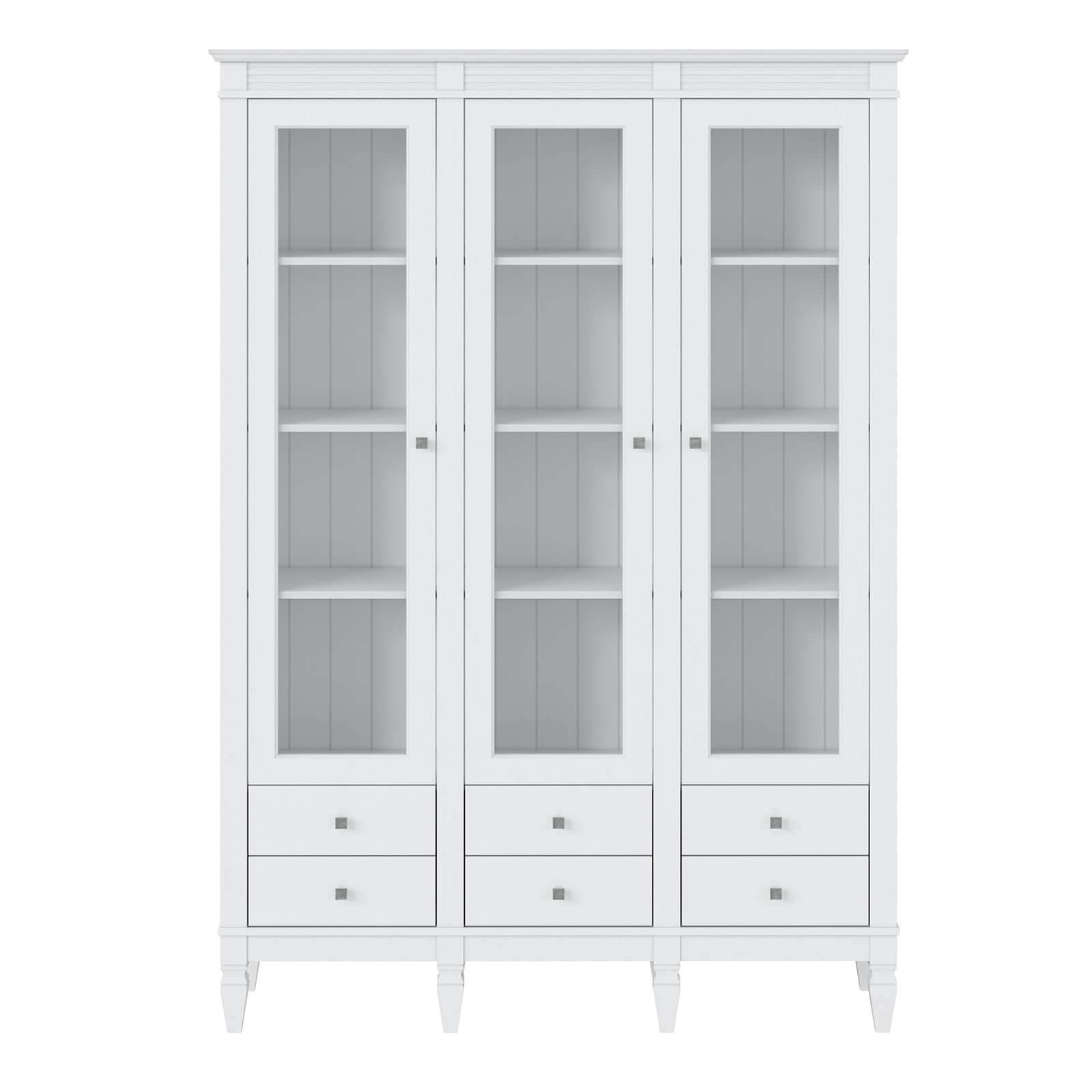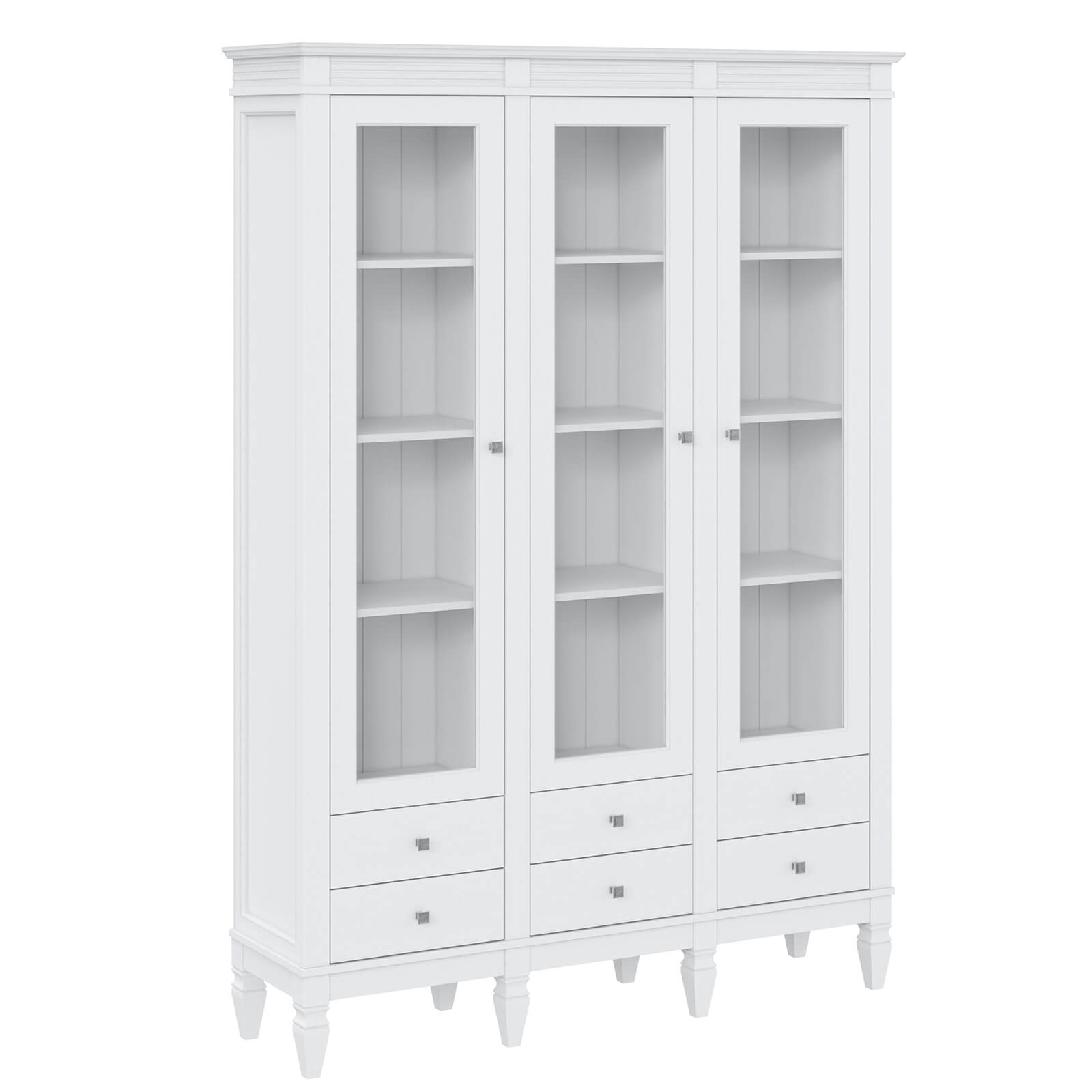 Визуально разделен на три вертикальных секции, в каждой из которых четыре полки за тремя стеклянными, распашными дверями.