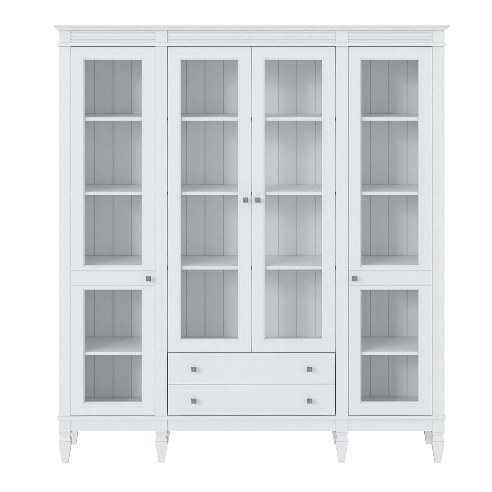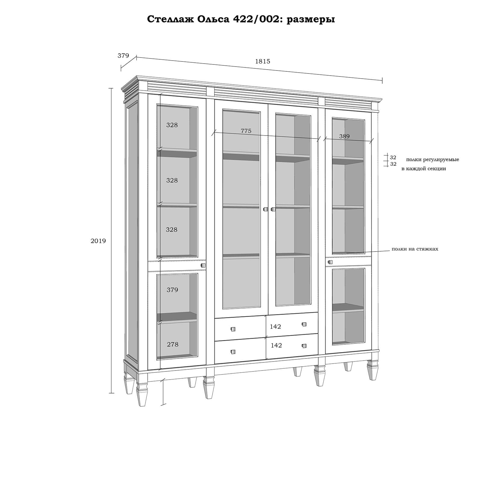 Визуально разделен на три вертикальных секции, в каждой из которых четыре полки за четырьмя стеклянными,
