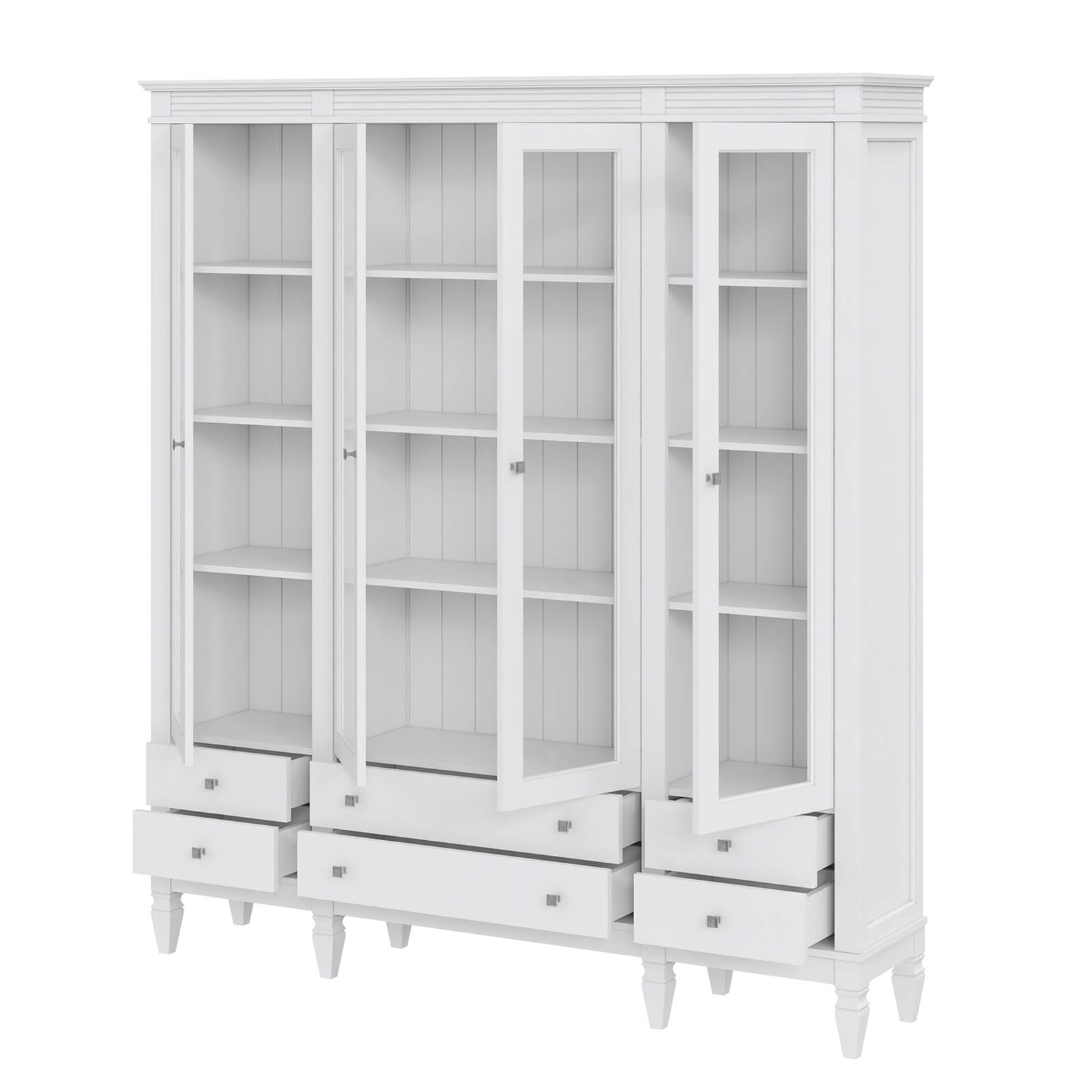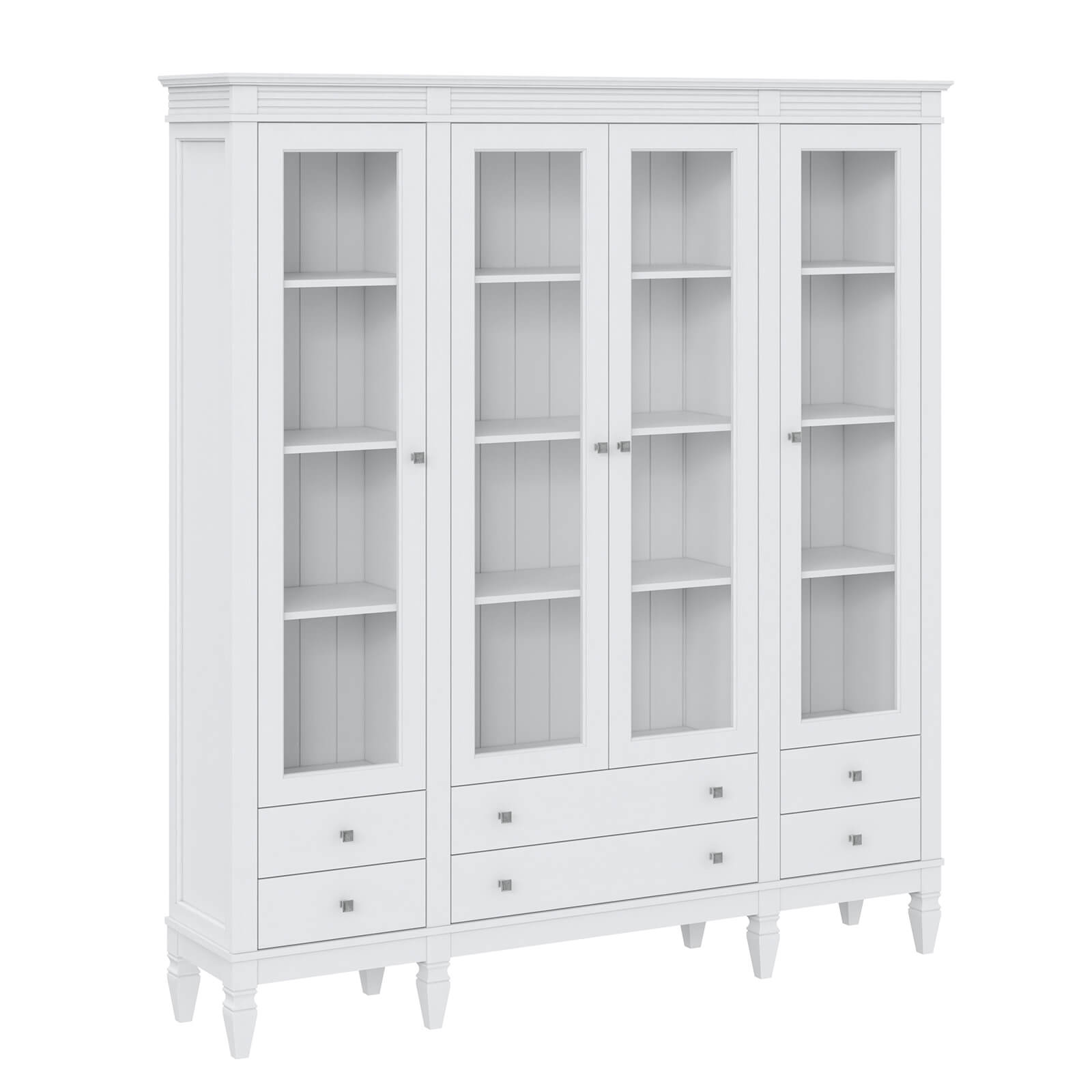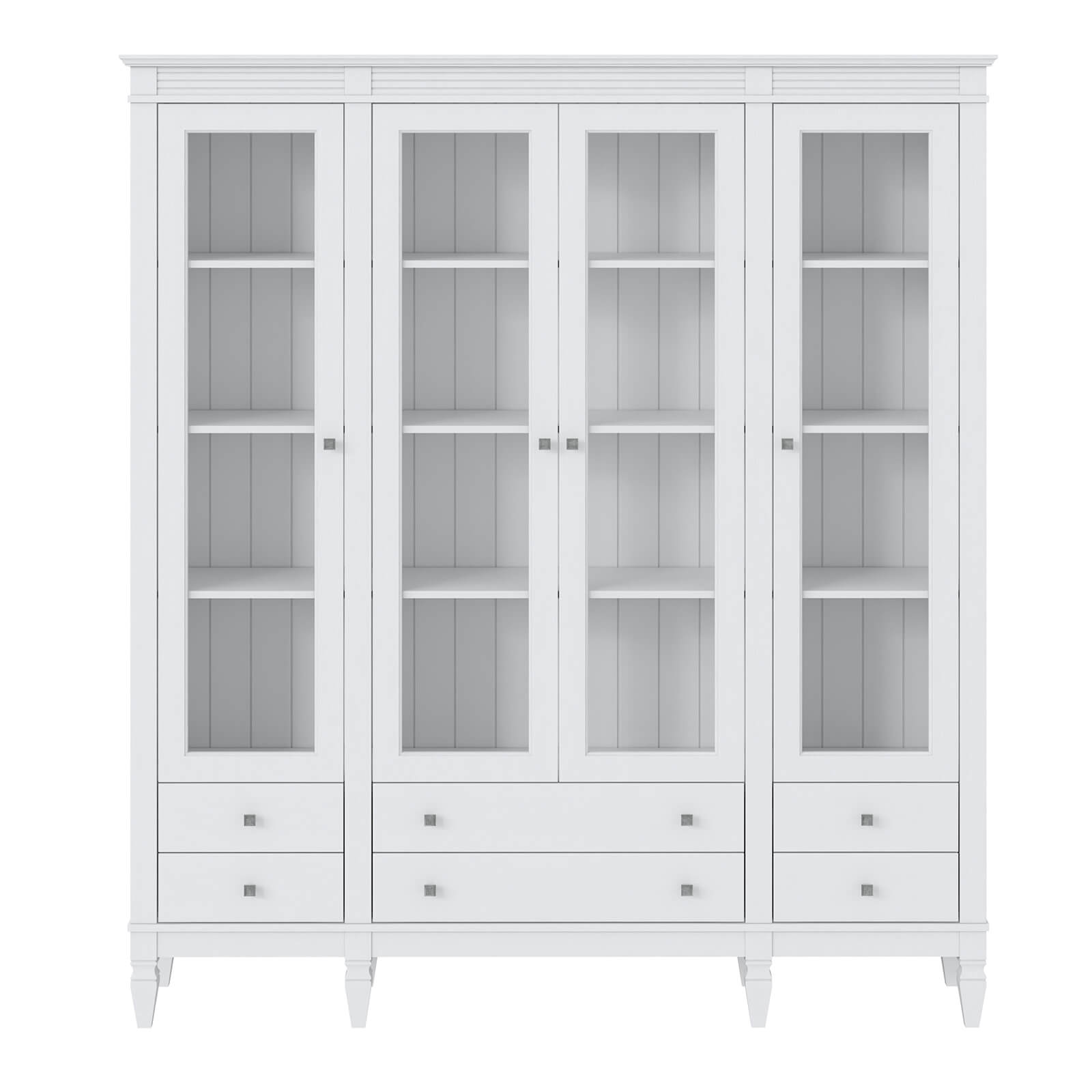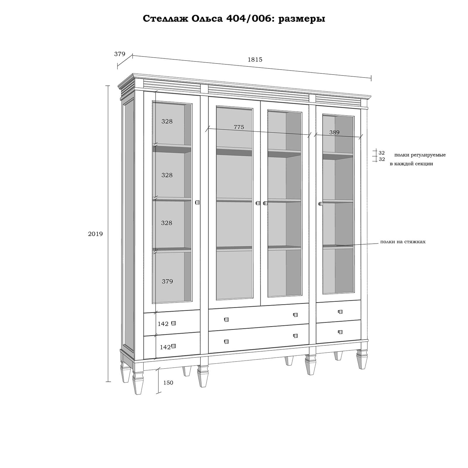 Визуально разделен на три вертикальных секции, в каждой из которых четыре полки за стеклянными дверями и 6 ящиков.