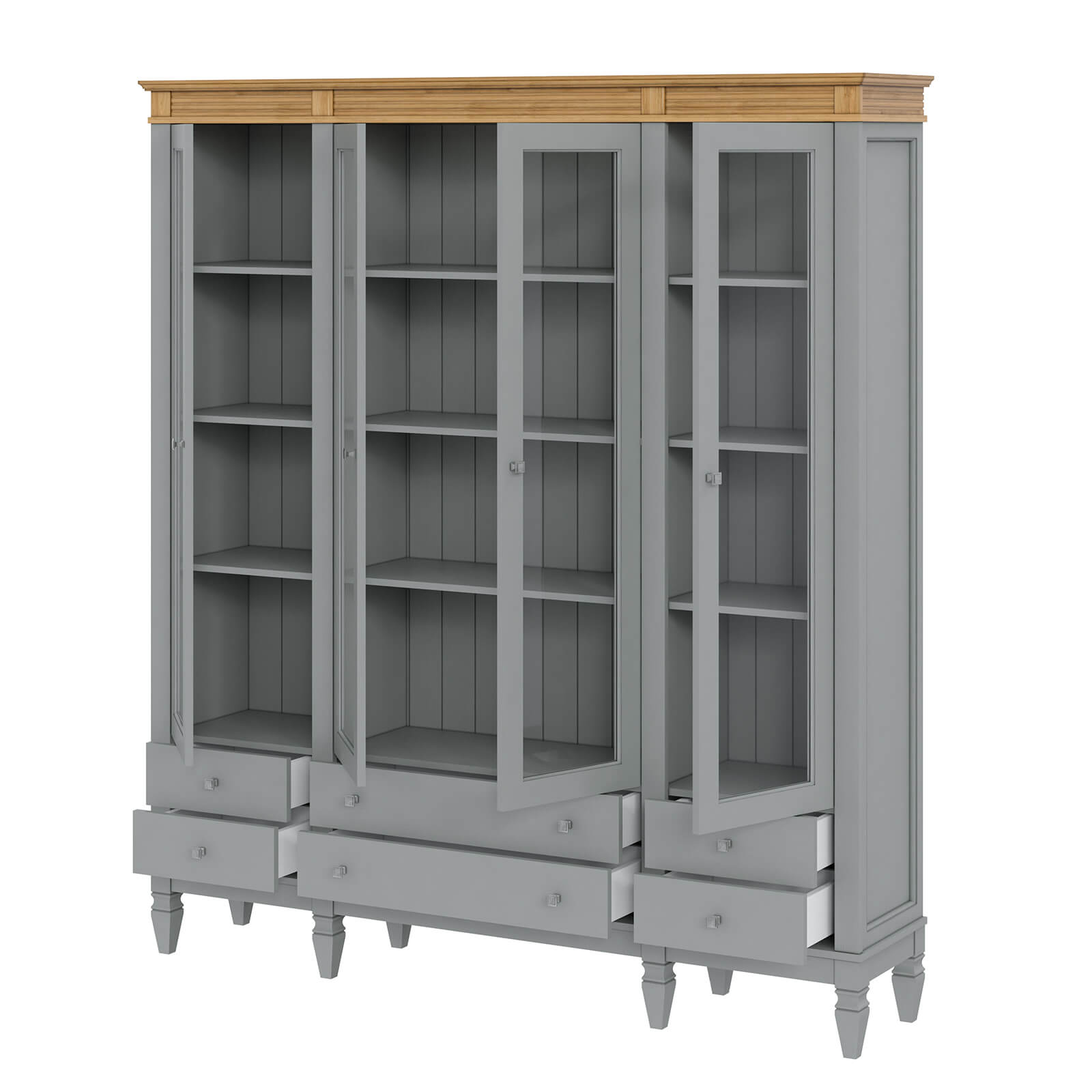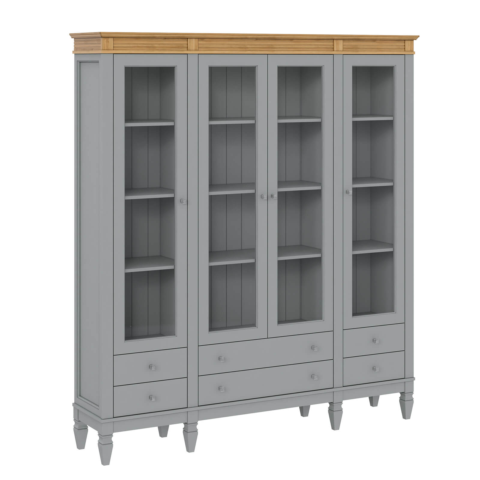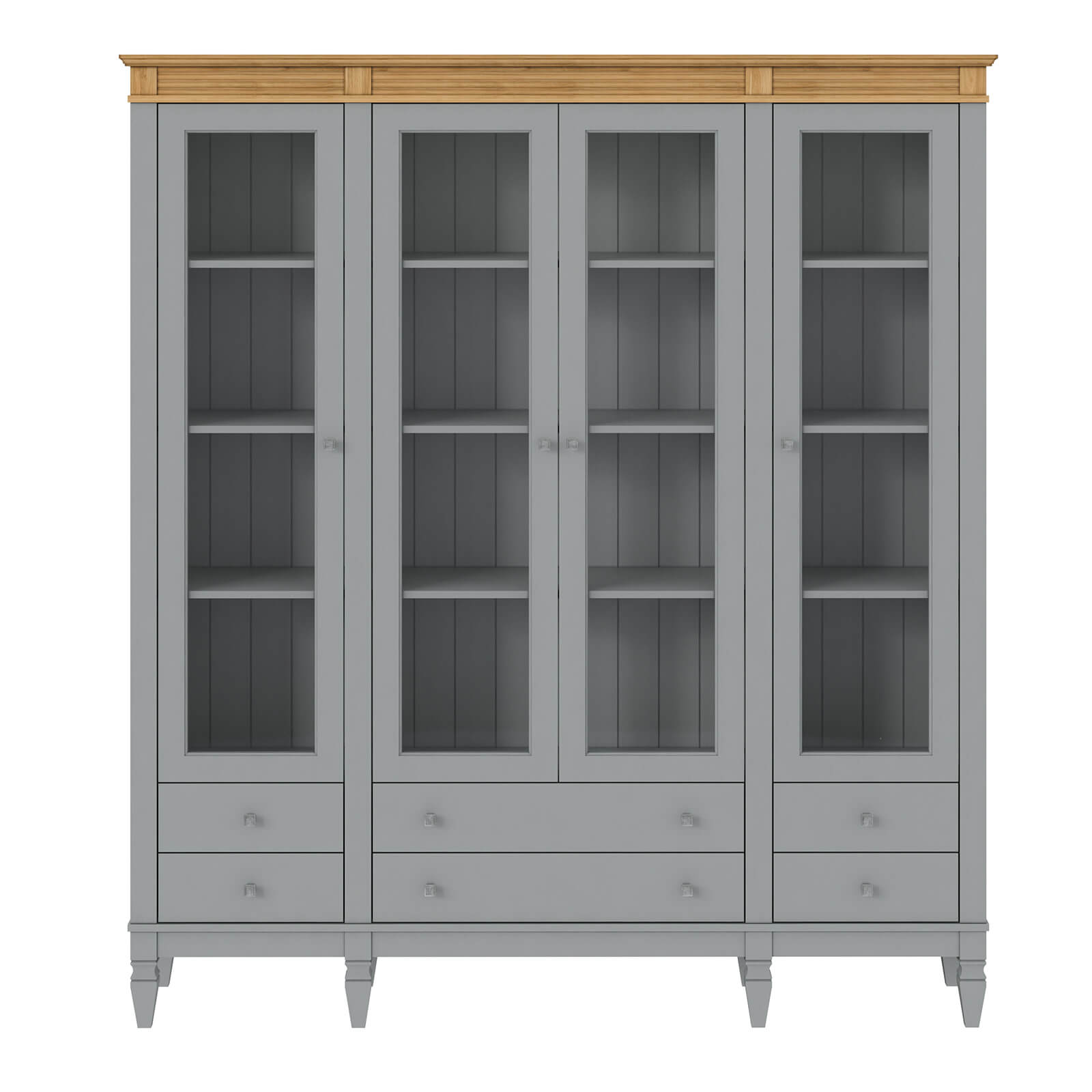 Визуально разделен на три вертикальных секции, в каждой из которых четыре полки за стеклянными дверями и 6 ящиков.
