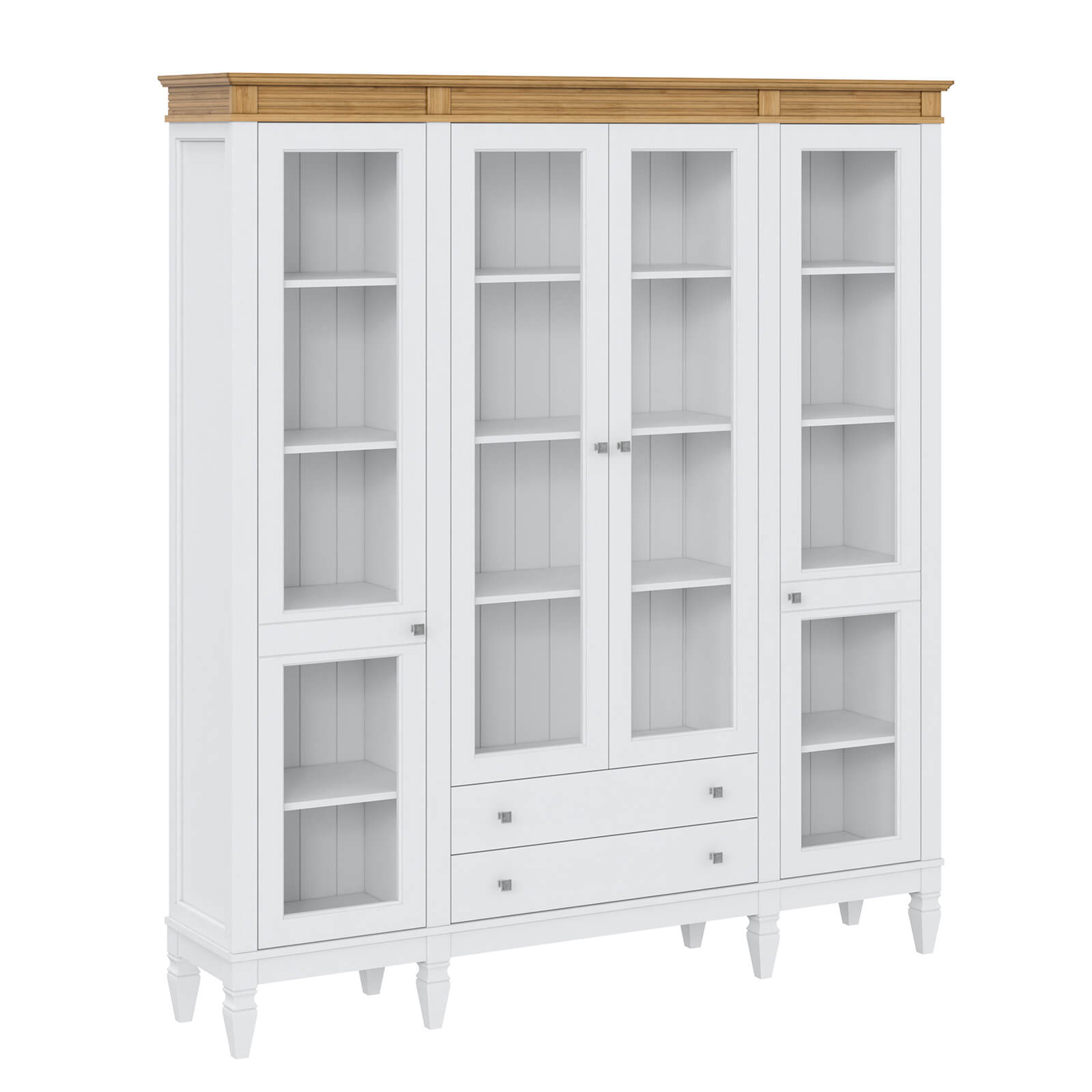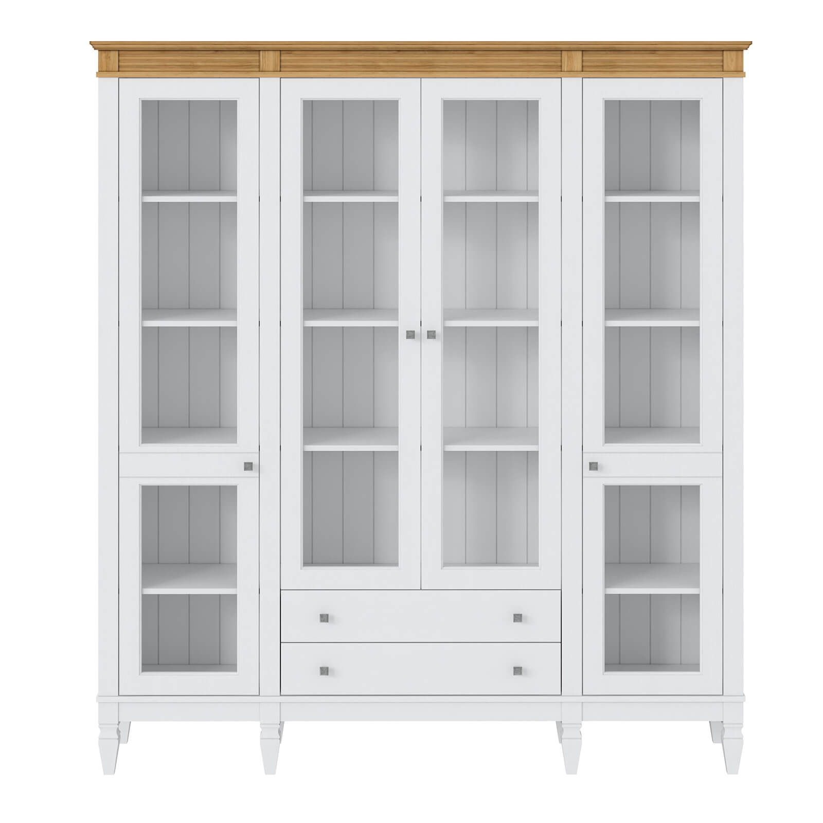 Визуально разделен на три вертикальных секции, в каждой из которых четыре полки за четырьмя стеклянными,