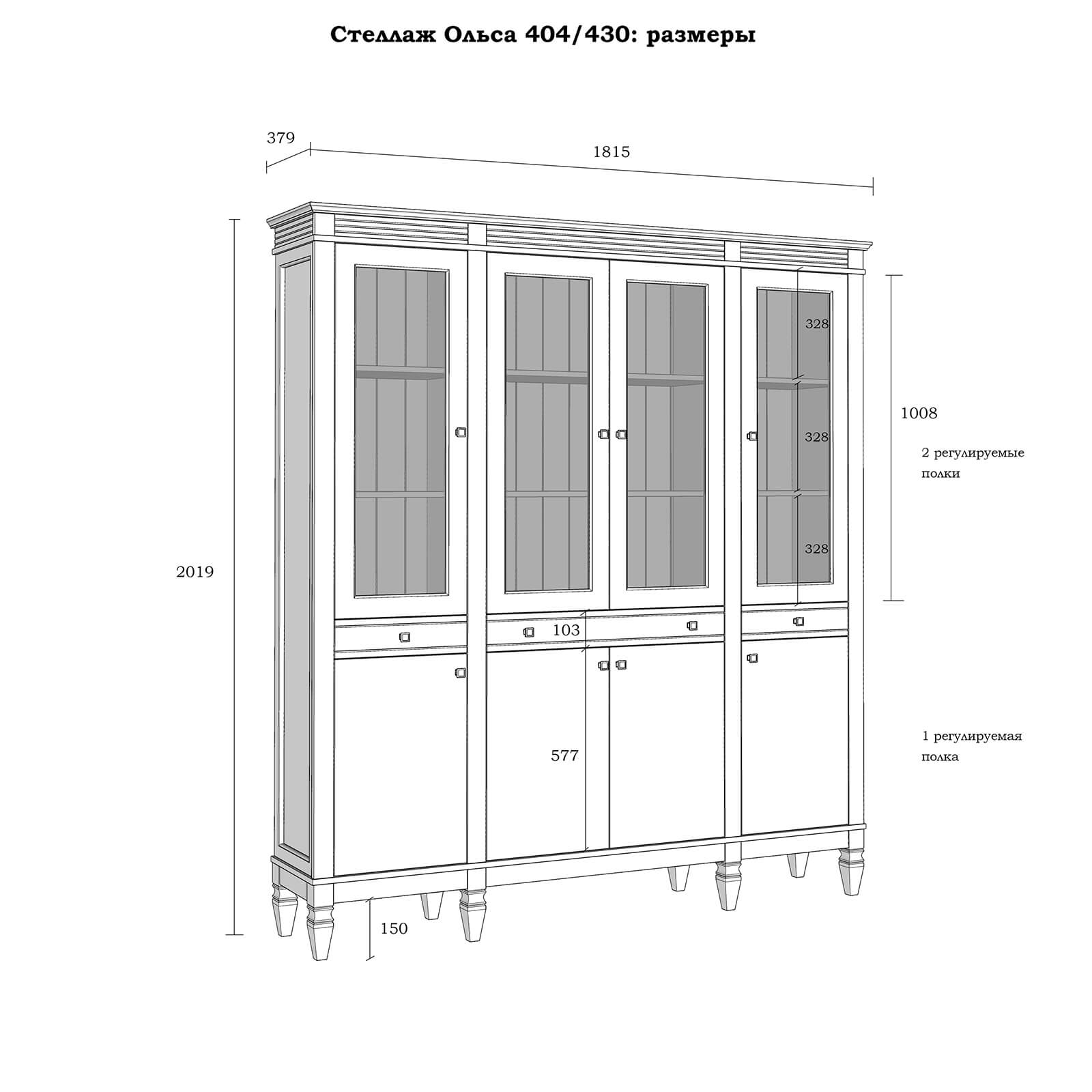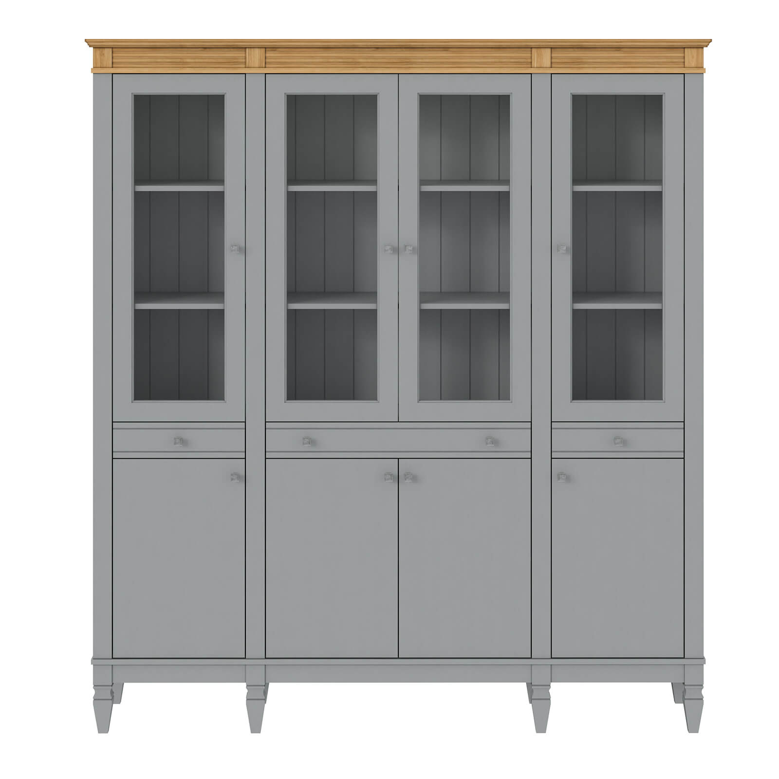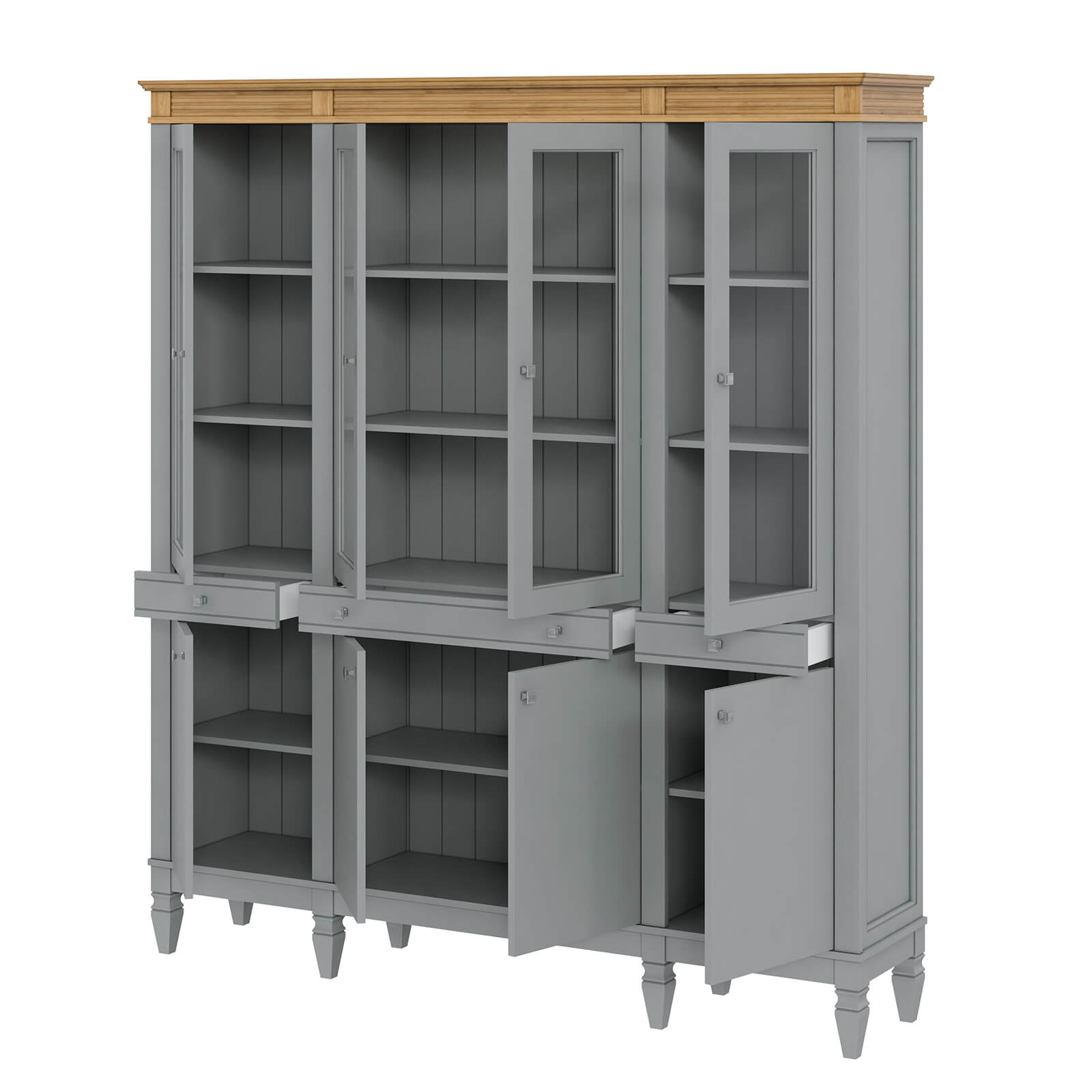 четыре распашные дверки в нижней части, четыре стеклянные, распашные дверки в верхней части и 3 узких ящика в середине.