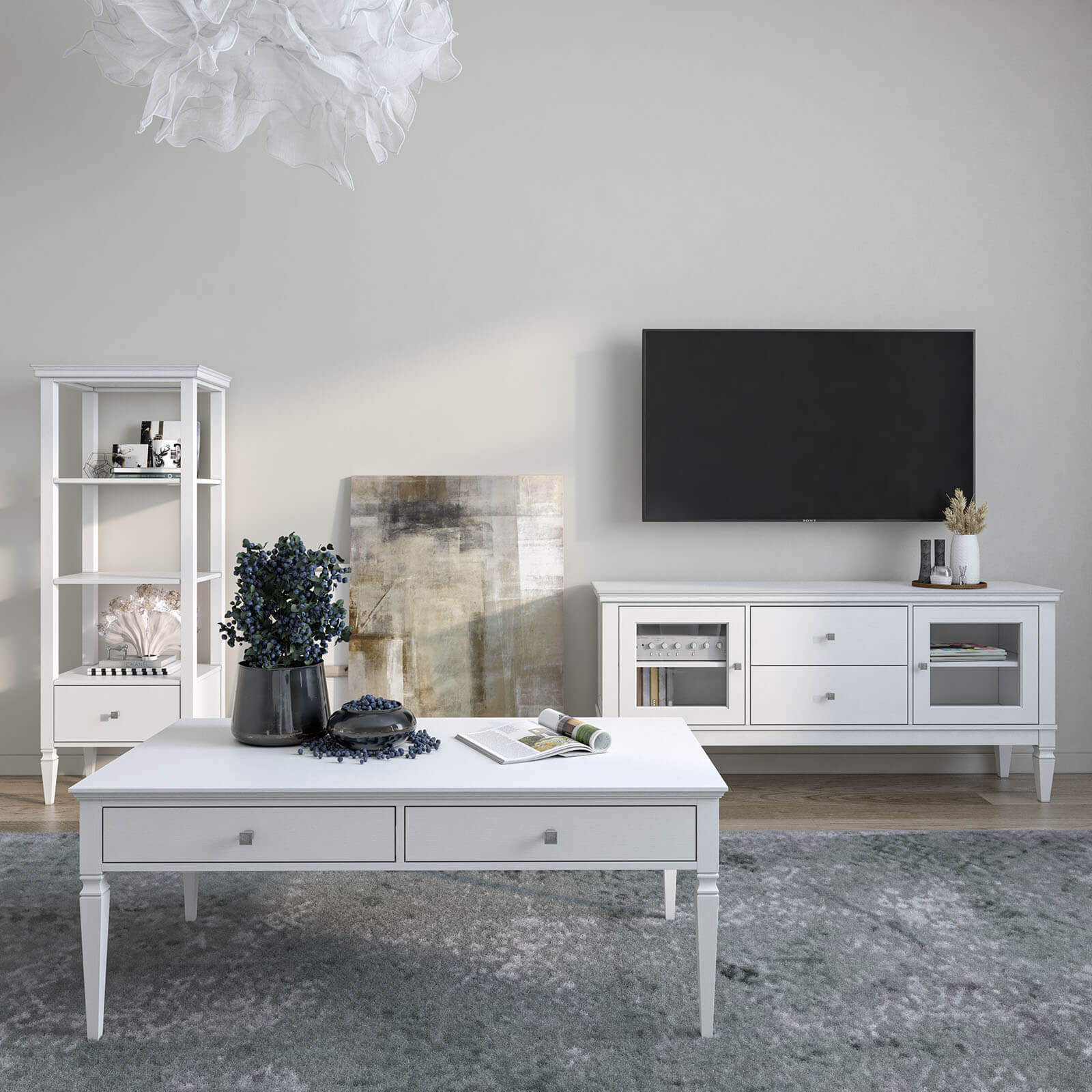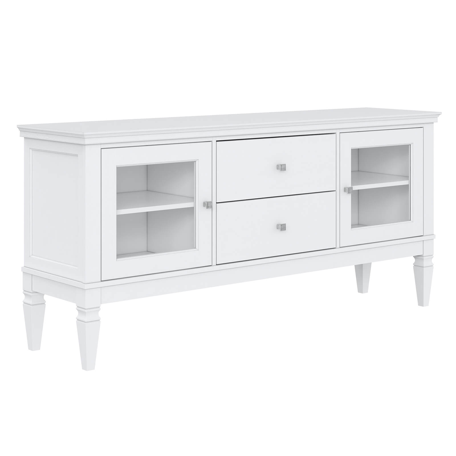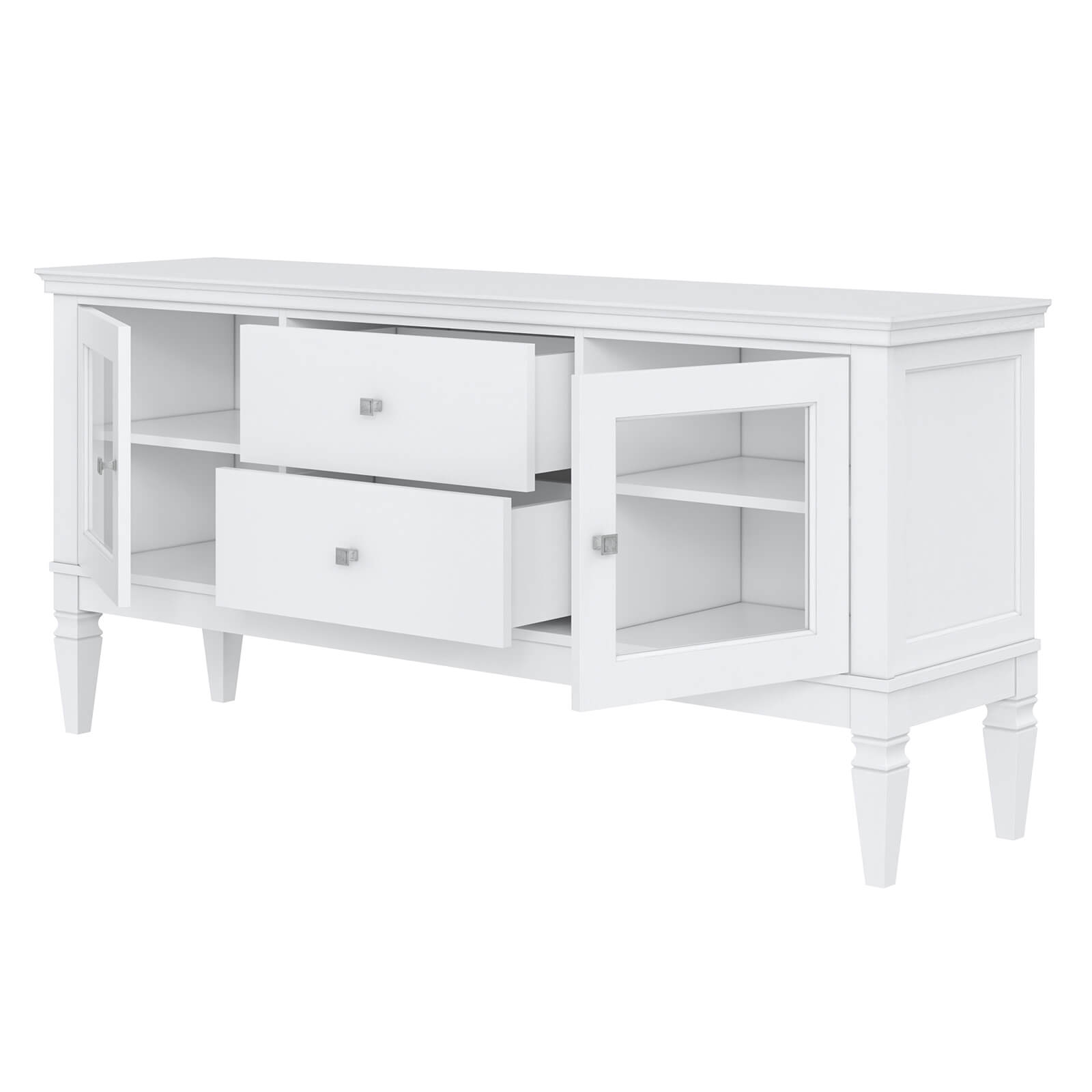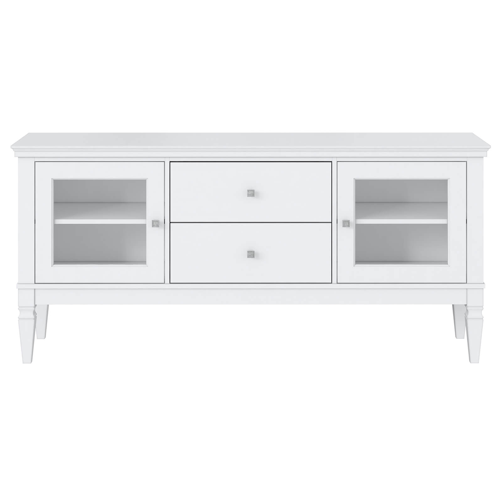 Тумба ТВ состоит из двух выдвижных ящиков и двух полок за стеклянными дверками.