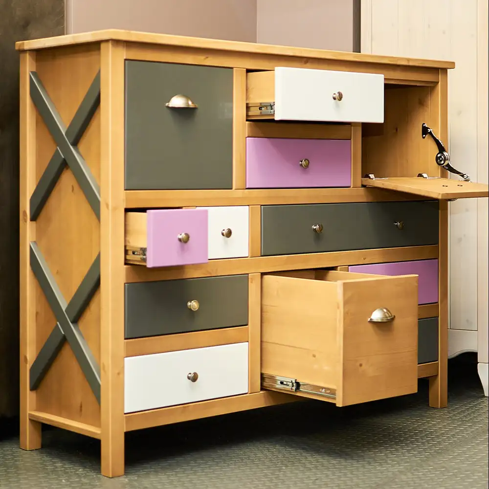 Цены в карточках товаров указаны за изделия в бесцветном лаке. Кроме этого, предлагается много вариантов отделки по палитрам производителя или по RAL. Можно выбрать не один, а несколько разных цветов. На ящиках и дверцах ручки разных типов, кнопки или раковины, в зависимости от изделия.
