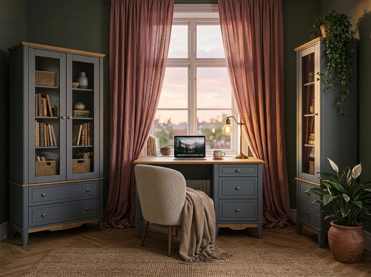 Корпус и фасады шкафа изготовлены из массива сосны, донья ящиков из оргалита. Корпус и фасады окрашены в серый цвет, а карниз, перекрытие над ящиками и нижняя планка – в цвет антик. Через покрытие антик можно рассмотреть природную текстуру сосны. Фасады шкафа, нижняя планка и ножки декорированы фрезеровкой, в неброском дизайне отлично смотрятся металлические ручки-кнопки с эффектом старения. Стенки ящиков окрашены в цвет корпуса и фасадов. Для окрашивания применяются матовые лаки шведской компании Becker Acromа. Лаки сертифицированы по европейским стандартам качества, они стойкие, не пахнут и безопасны для аллергиков.