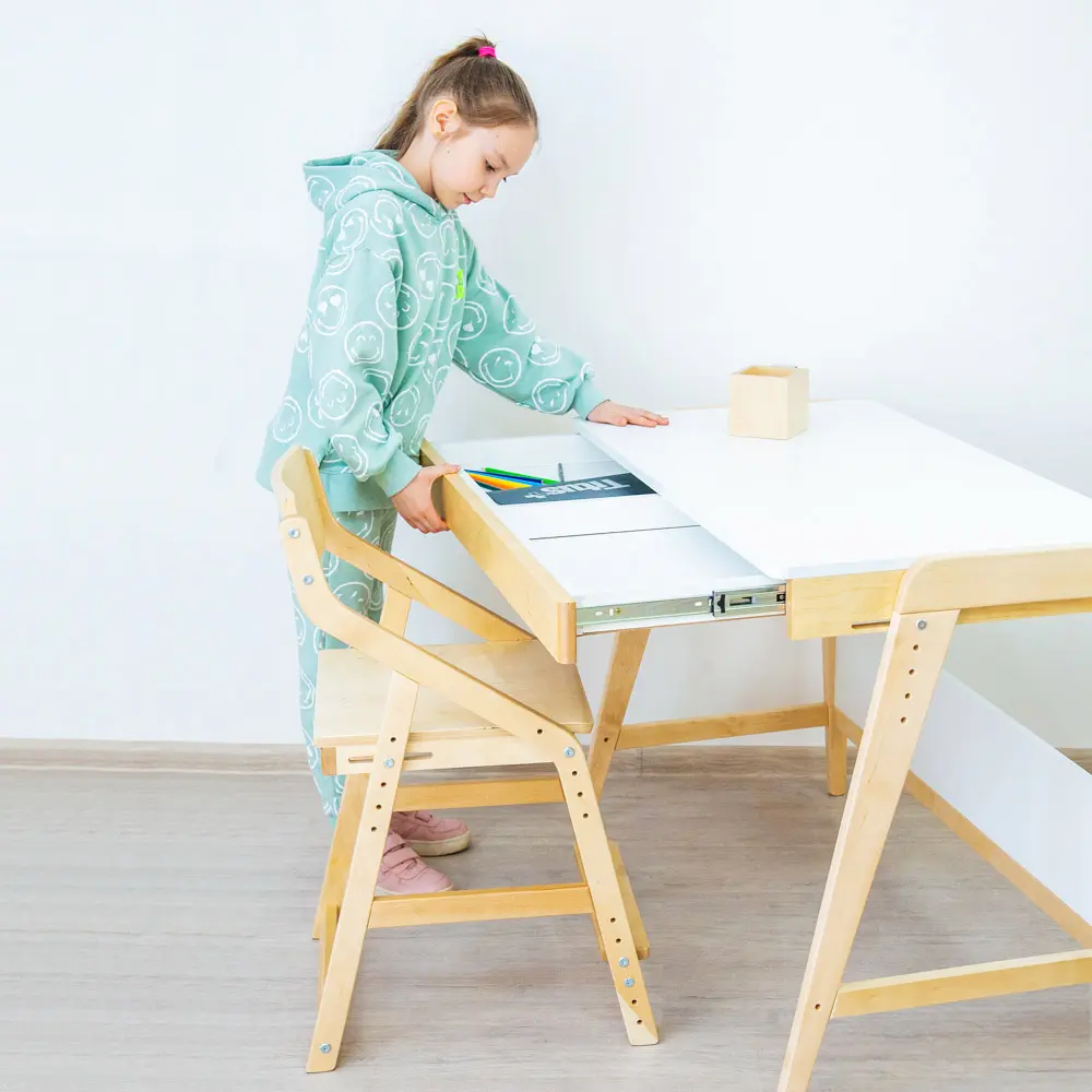 Стулья имеют удобные подставки для ног, которые также переставляются по высоте. Выдвижные ящики столов удобно разделены на секции. Ящики устанавливаются на шариковых направляющих. Изделия соответствуют требованиям для детской мебели: нет острых углов, используются гипоаллергенные красители, конструкции максимально устойчивые.