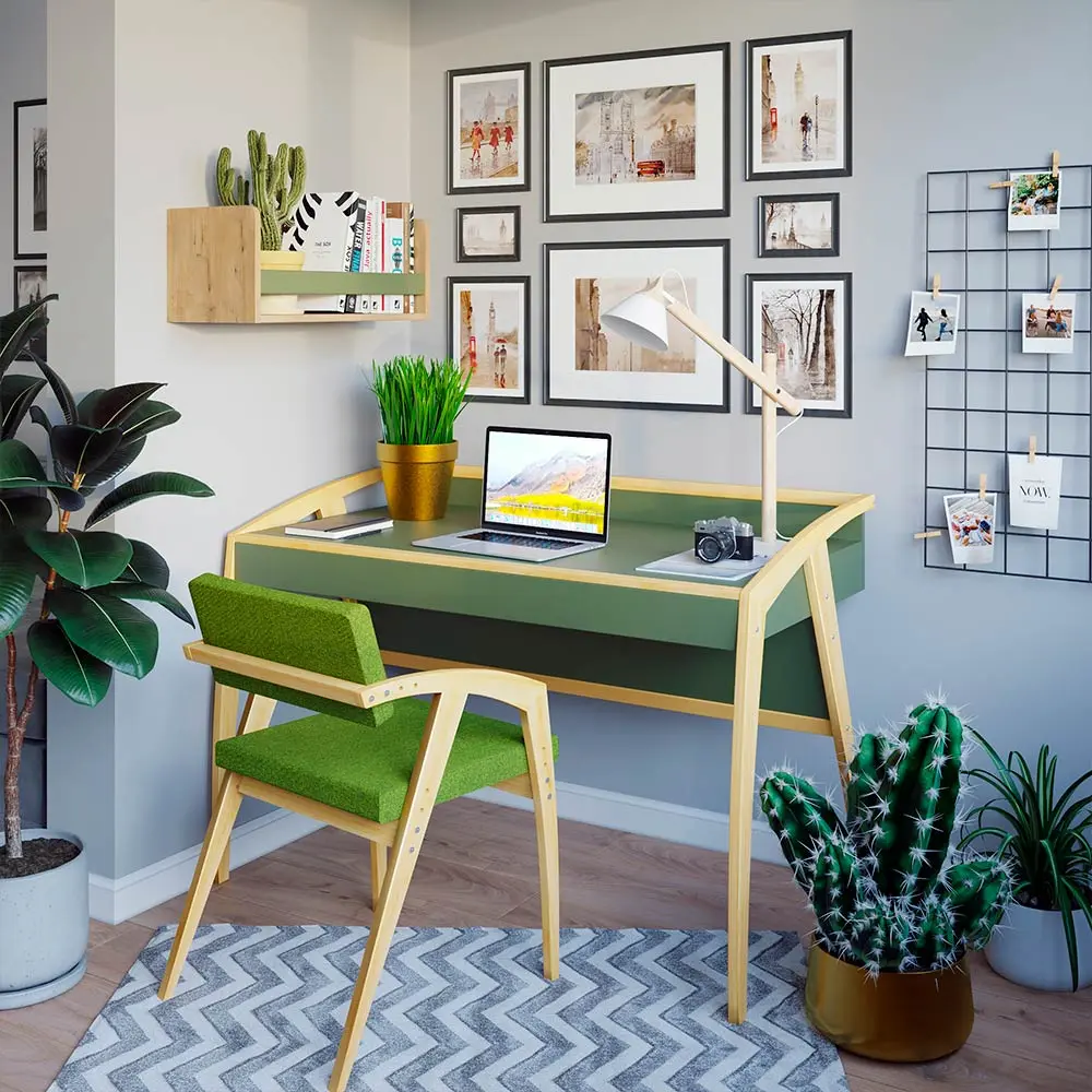 Каркасы столов и фасады ящиков изготавливаются из массива березы, стенки ящиков из березовой фанеры, столешницы столов из ЛДСП. Каркасы стульев из массива березы, спинки и сиденья стульев из березовой фанеры. Предлагается большой выбор цветов. В коллекции также есть мягкие стулья с обивкой из велюра и гобелена.