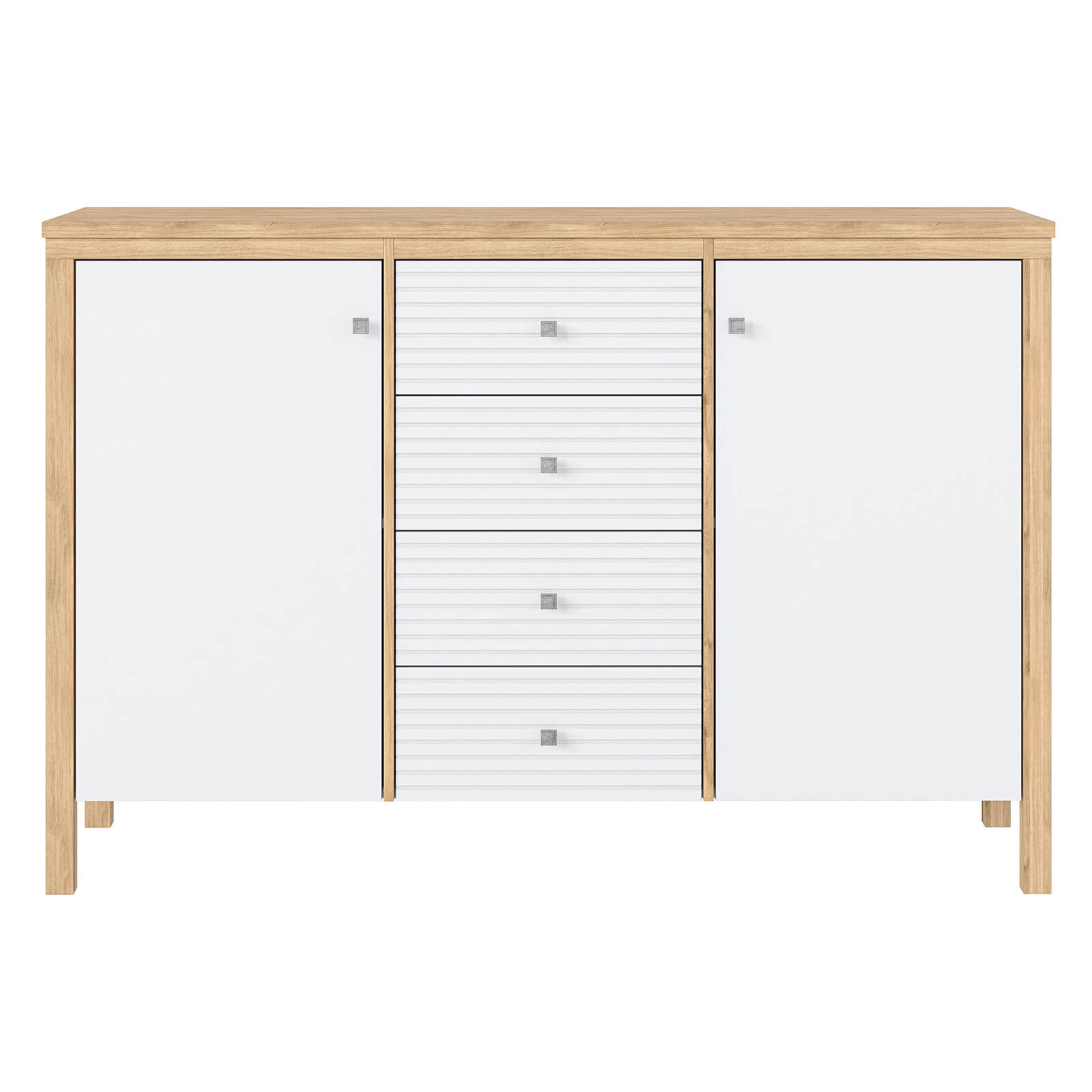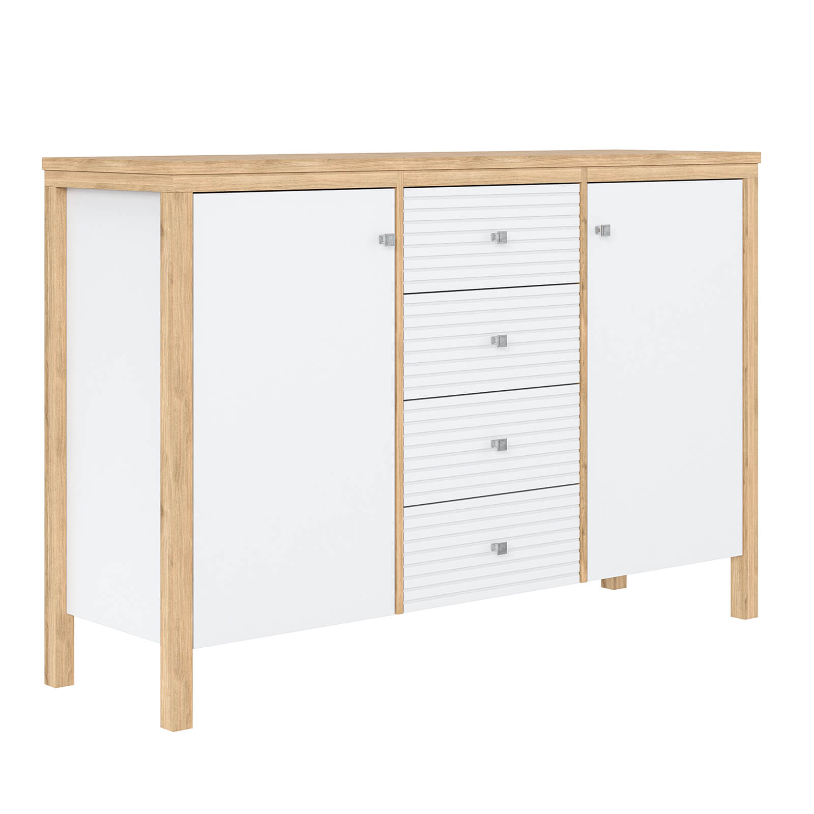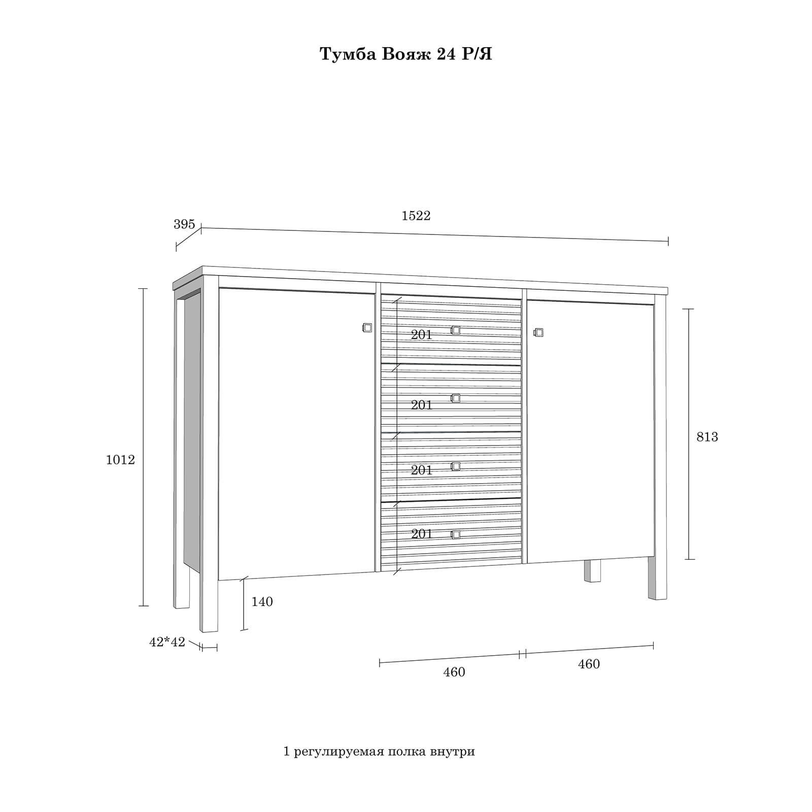Тумба (комод) оснащен четырьмя рифлеными ящиками и двумя распашными дверками с полками.