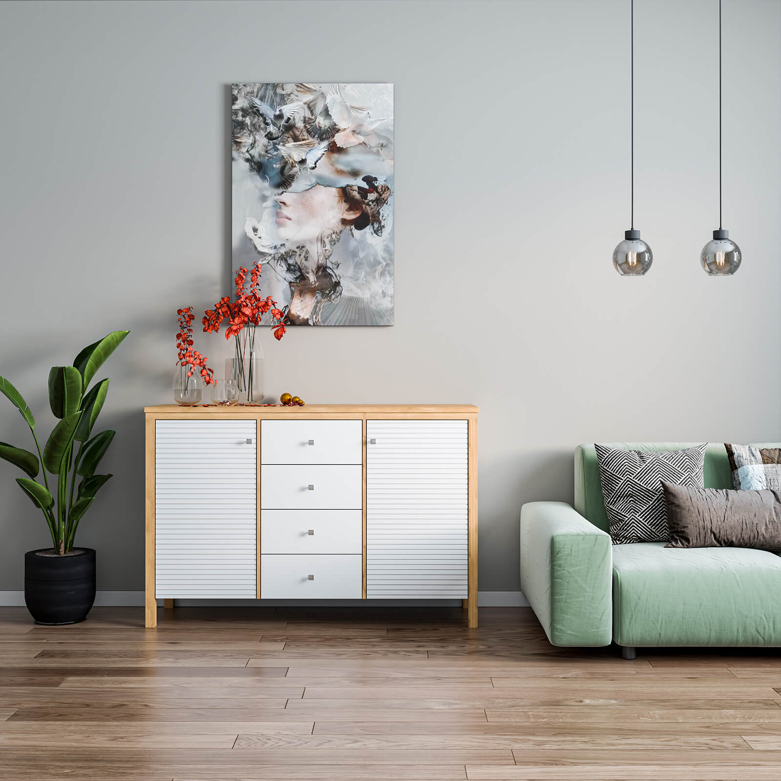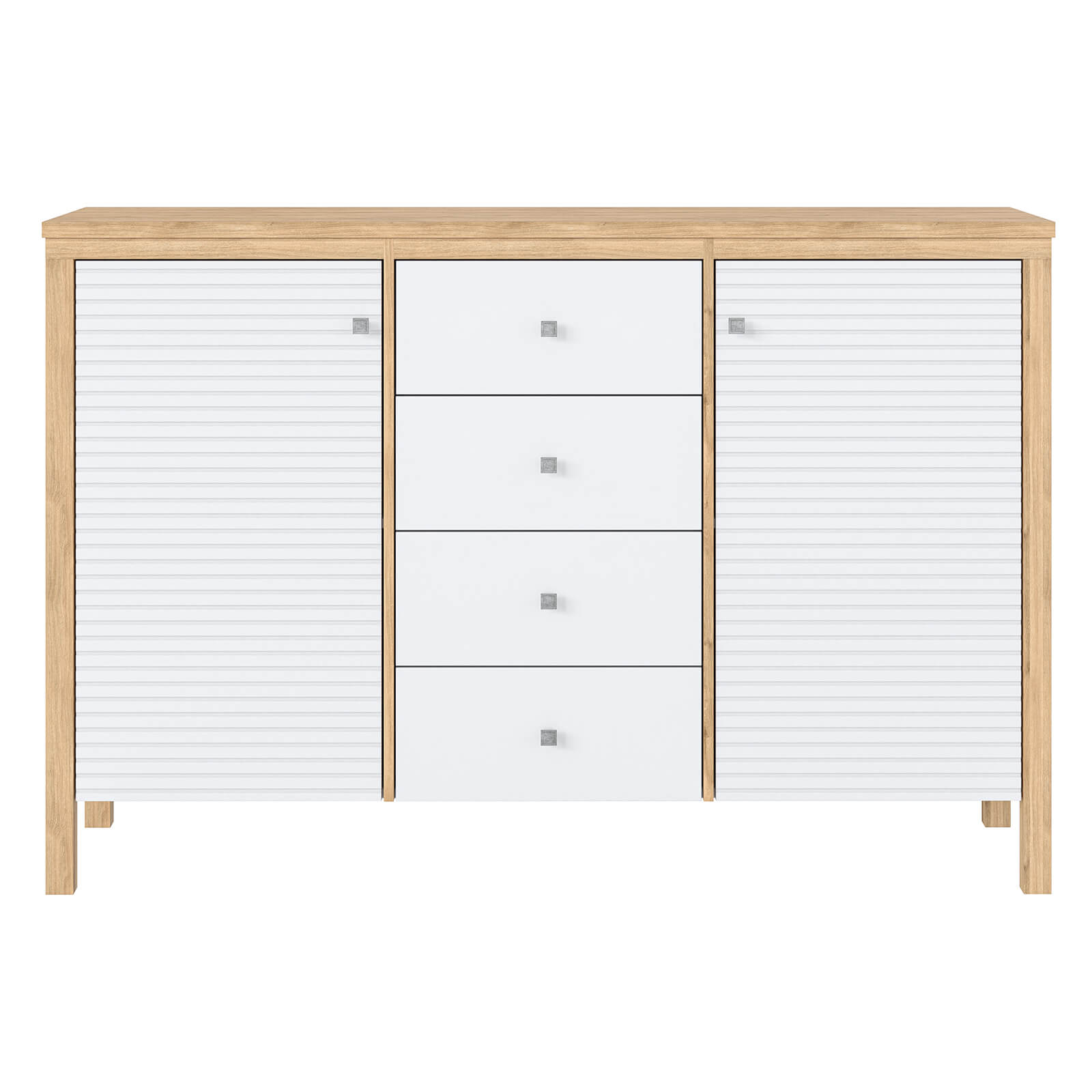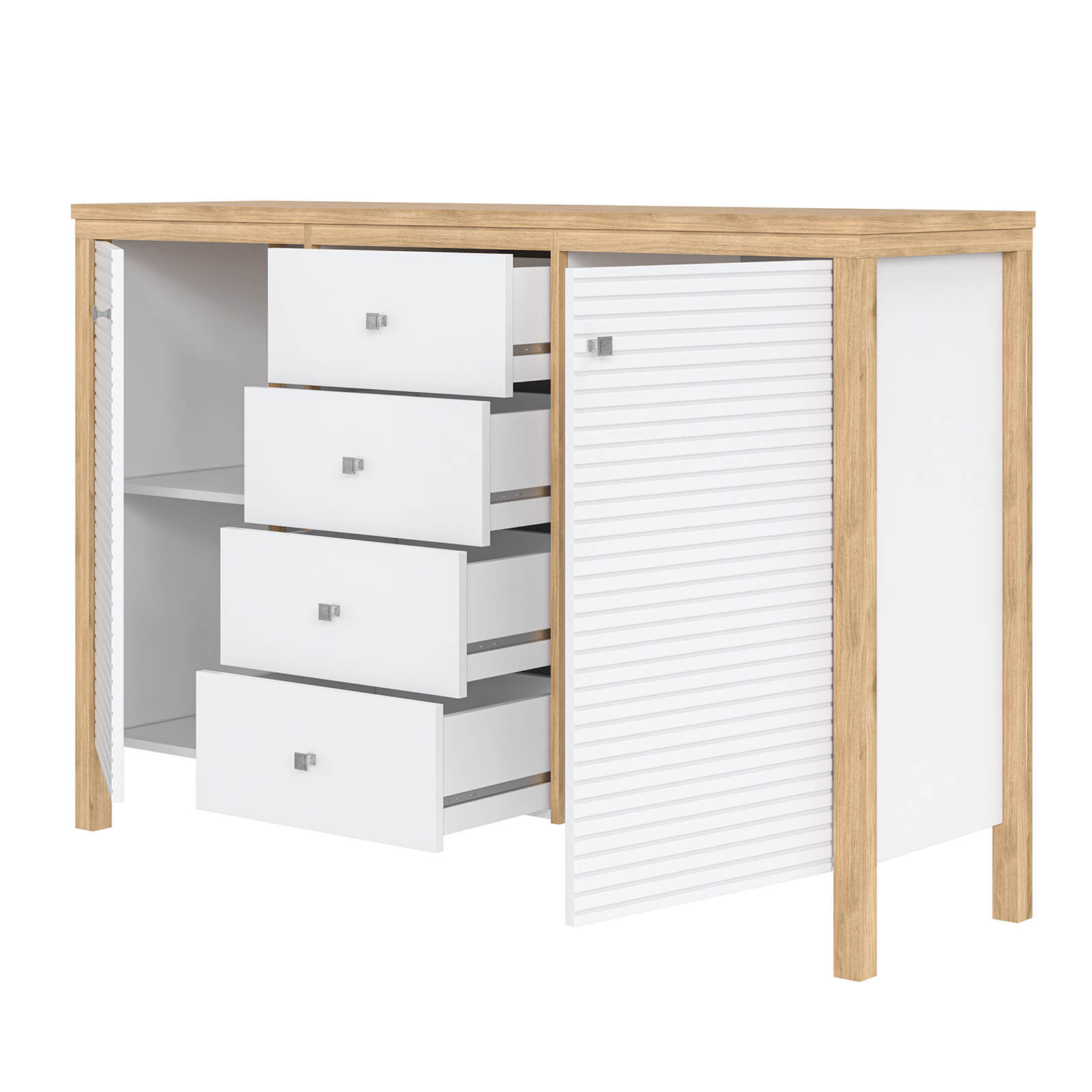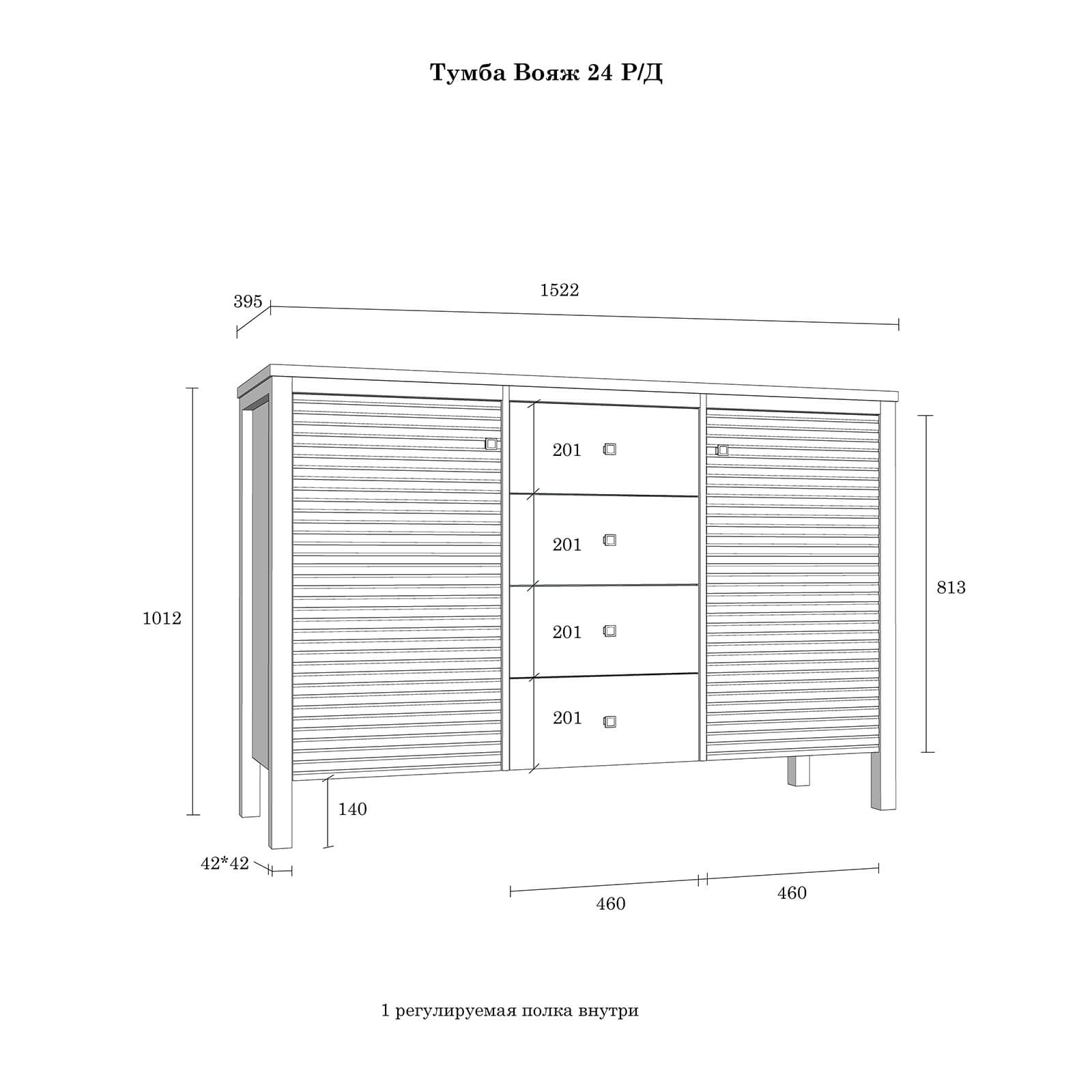 Тумба (комод) оснащен четырьмя выдвижными ящиками и двумя рифлёными, распашными дверками с полками.