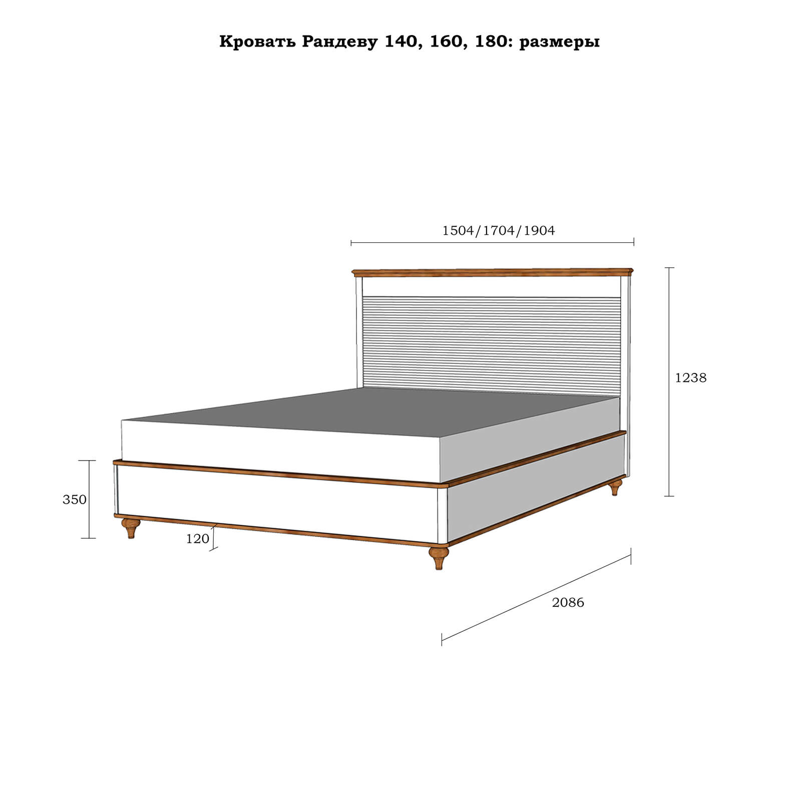Габаритные размеры кровати: (ШхГхВ, мм.) 1504 x 2086 x 1238 мм;
