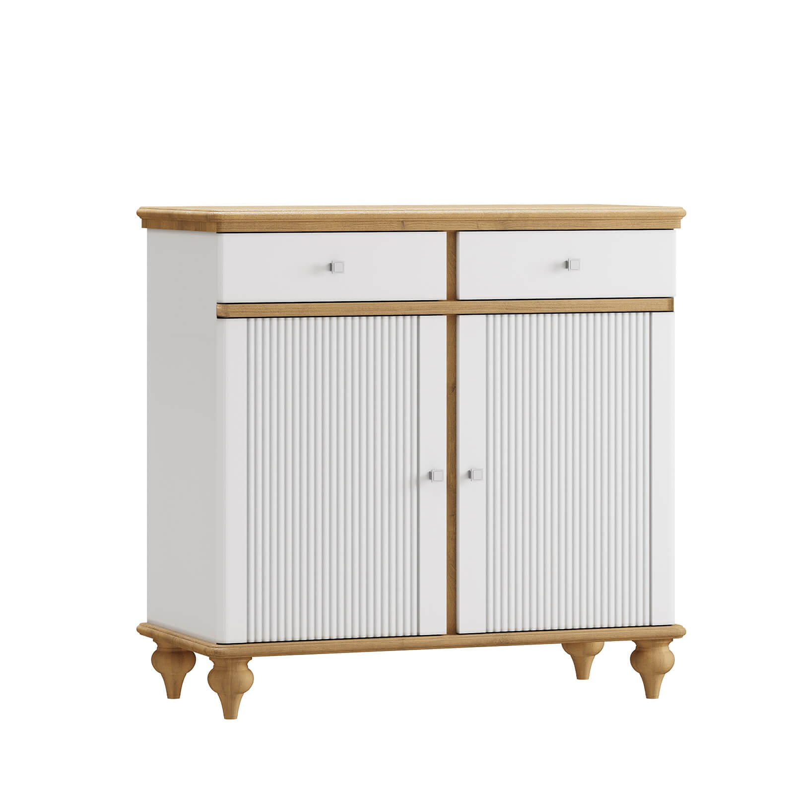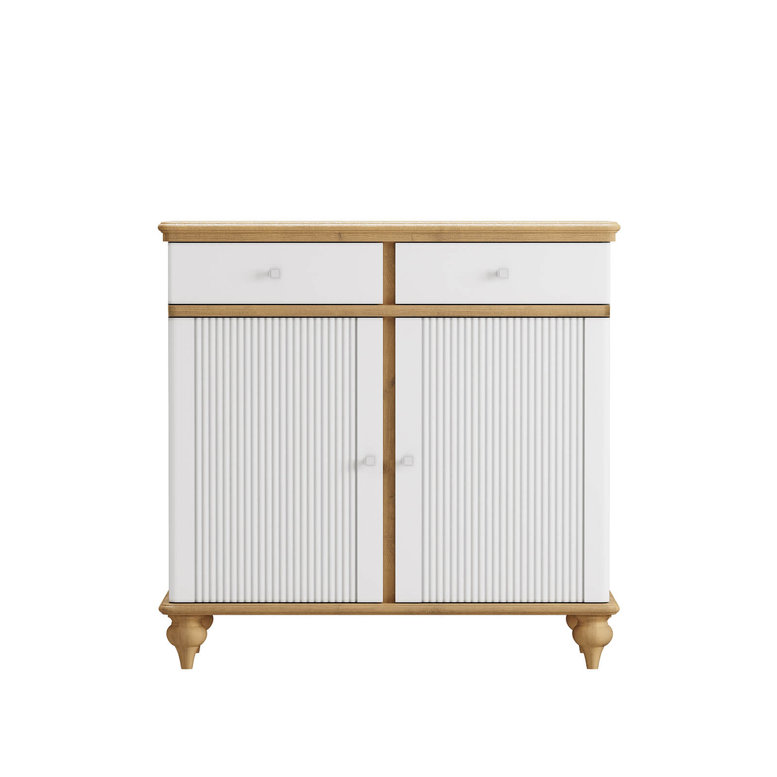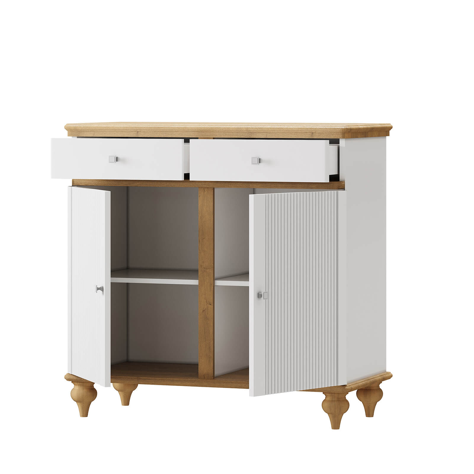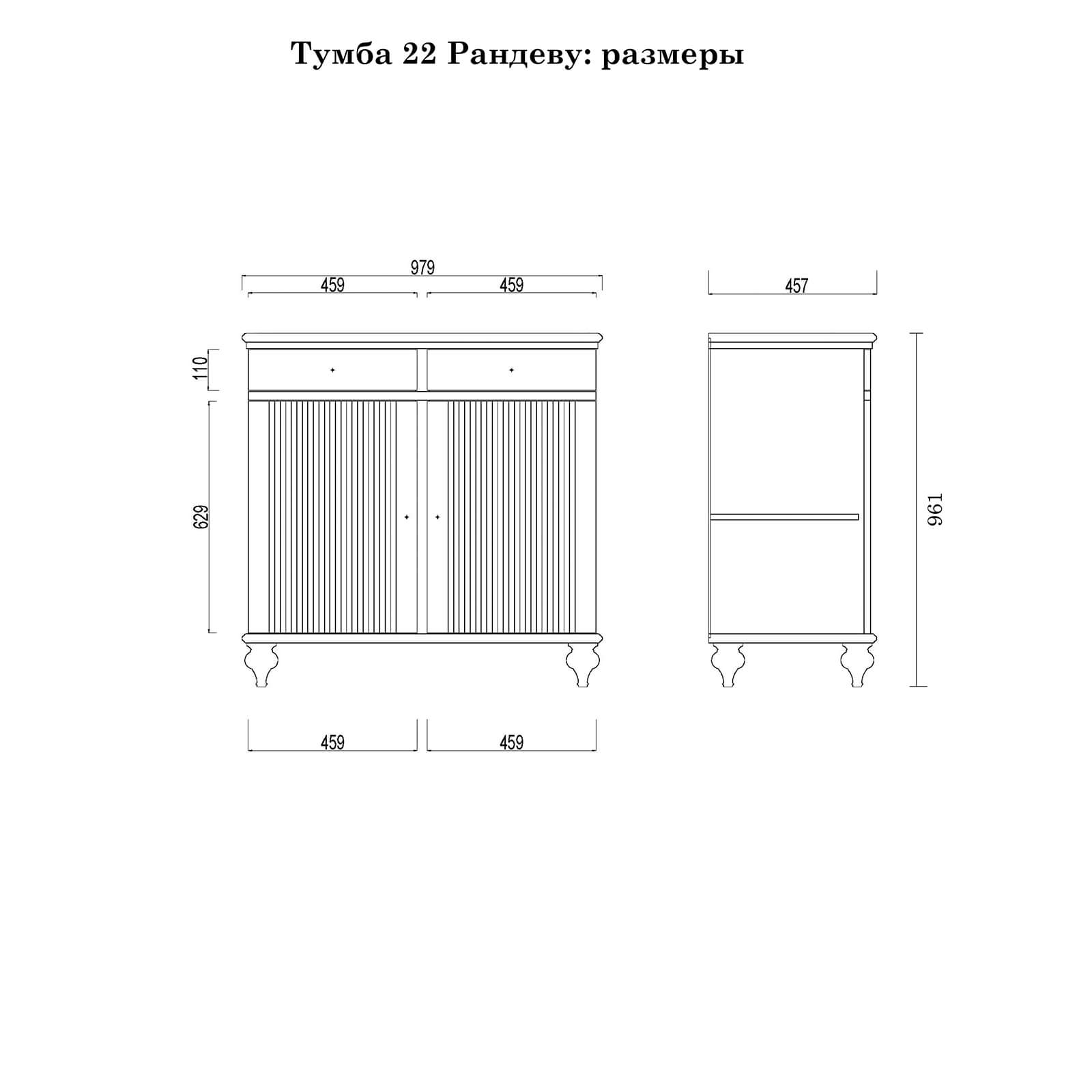 Комод разделен на два отсека, в каждом из которого по одной полке за распашными дверями, сверху два выдвижных ящика.