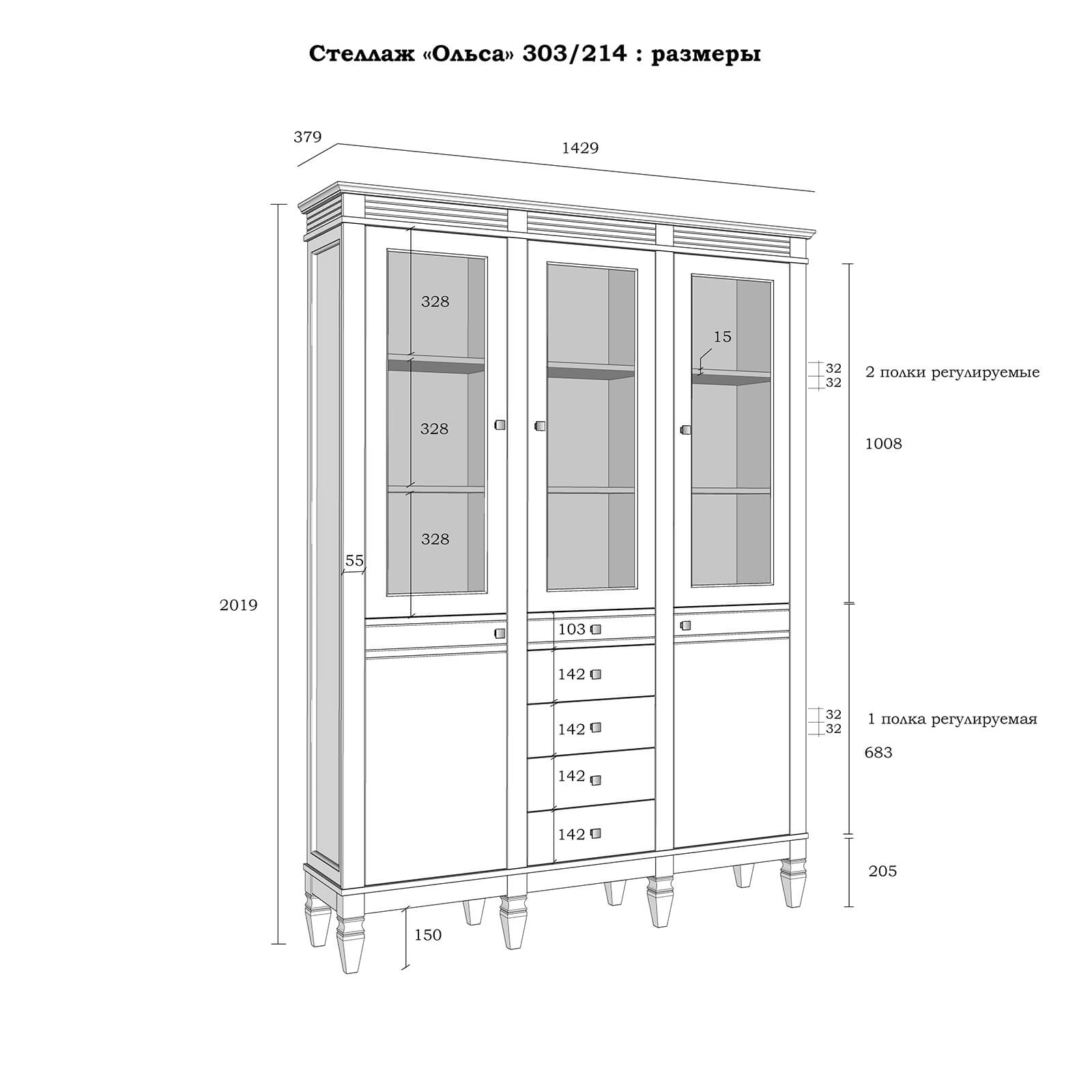 Стеллаж "Ольса" 303/214 из массива сосны, 143x202x38 см Большой и вместительный стеллаж “Ольса” - находка для просторной гостиной, библиотеки или кабинета. Здесь вы сможете разместить не только любимые книги, но и посуду, постельное белье и другие нужные вещи. Визуально разделен на три вертикальных секции. Сделан из натурального массива, поэтому может выдерживать значительные нагрузки. Особенности Размеры 143 х 202 х 38 см; Основа - экологически чистая сосна; Использована фурнитура немецкого бренда; Модель в цвете «белый лак», «белый лак/антик 24», «серый 7042», «серый 7042/антик 24». Фурнитура Направляющие - HAFELE (Германия), скрытого монтажа со встроенным демпфером (доводчиком плавного закрывания); Петли - BLUM (Германия); Ручки - Giusti (Италия) стиль классика, имеют форму квадрата, материал металл, цвет серебро состаренное; Особенности покрытия Деревянную мебель чаще всего обрабатывают водными лакокрасочными материалами. Это наиболее популярный в мире вариант покрытия, который известен отсутствием токсического воздействия на организм. Его безопасность позволяет пользоваться им даже при изготовлении детских игрушек, что подтверждено европейским сертификатом EN71-3. При этом подобная обработка надежно защищает дерево от лишней влаги, сырости, препятствует появлению плесени и грибков. Таким образом, изделие прослужит вам дольше и будет радовать первозданным внешним видом.