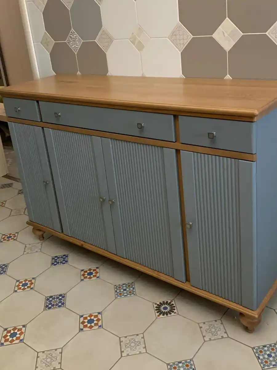 Комод разделен на три отсека, в каждом из которого по одной полке за распашными дверями, сверху три выдвижных ящика.