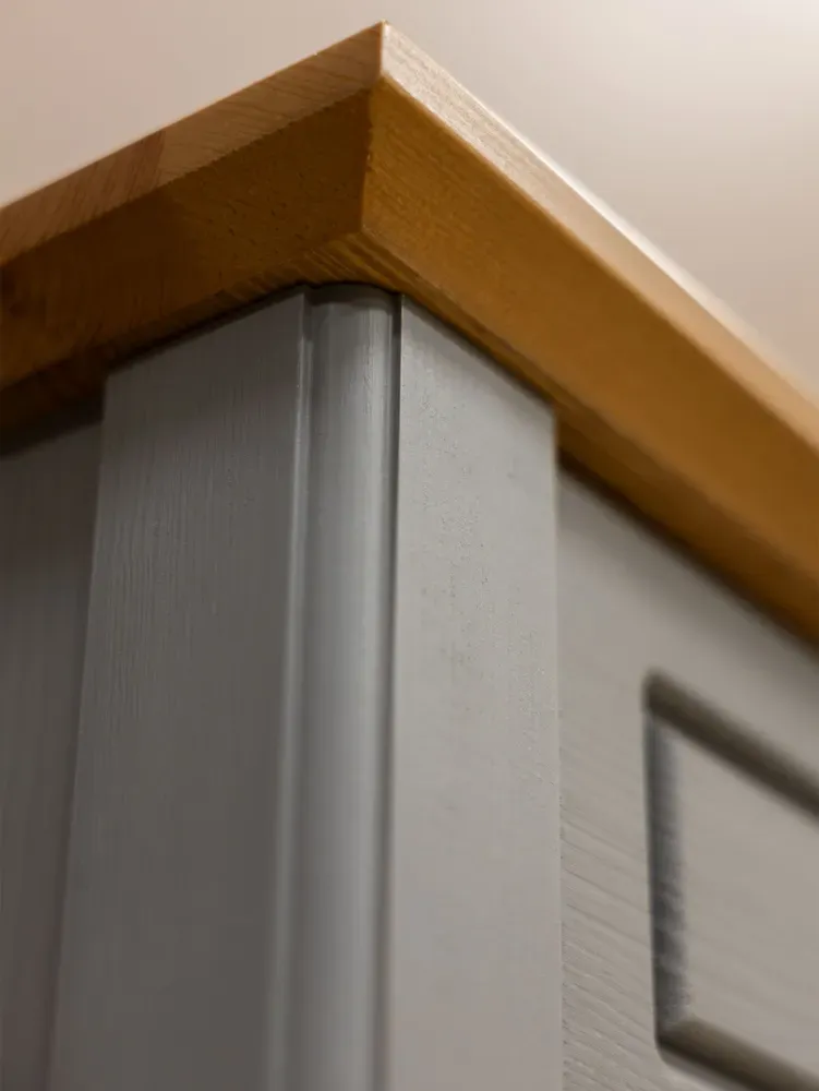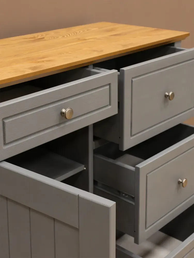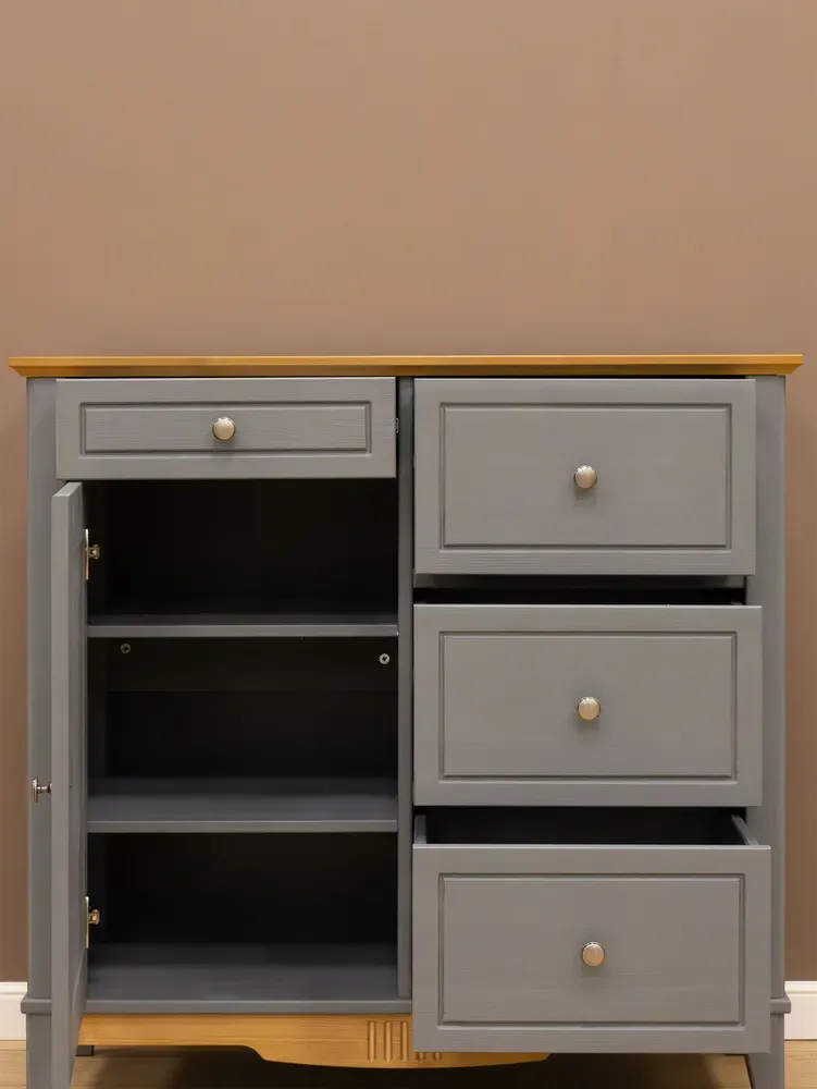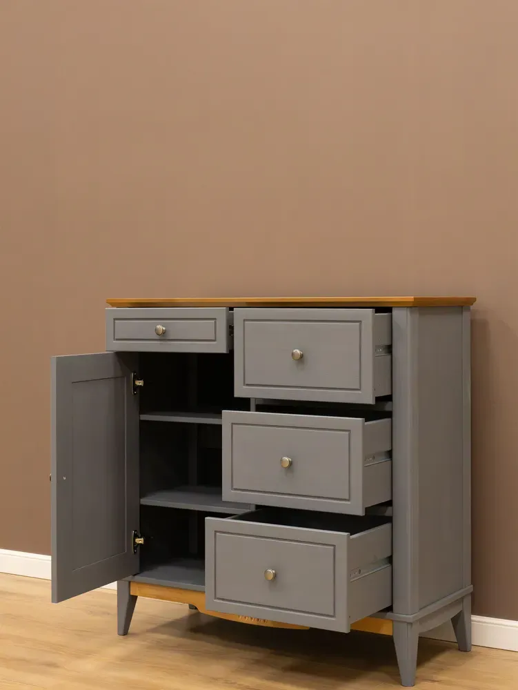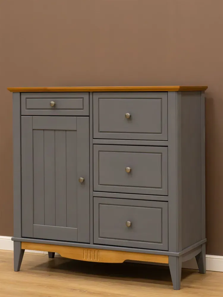Оригинальное цветовое решение: Корпус комода выдержан в спокойном сером тоне (RAL 7046), крышка и нижняя декоративная планка окрашены в тёплый цвет антик, через который просвечивает текстура дерева. Донья ящиков сделаны из оргалита, стенки ящиков окрашены в цвет корпуса. Эта модель комода также предлагается в отделках «белый воск/антик» и «черный/антик».