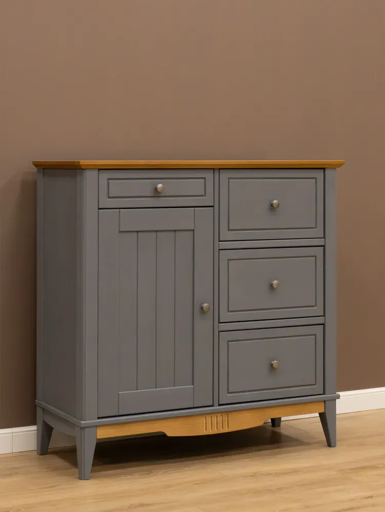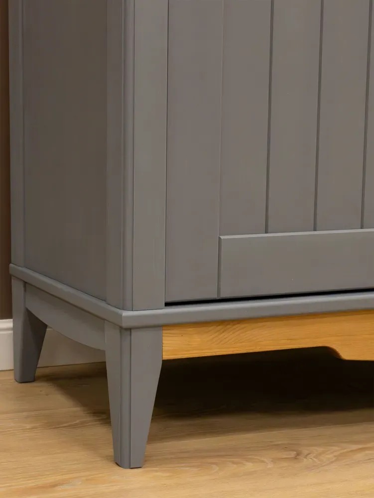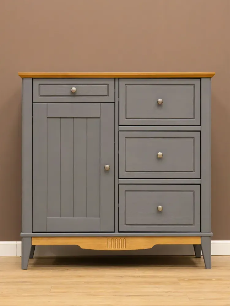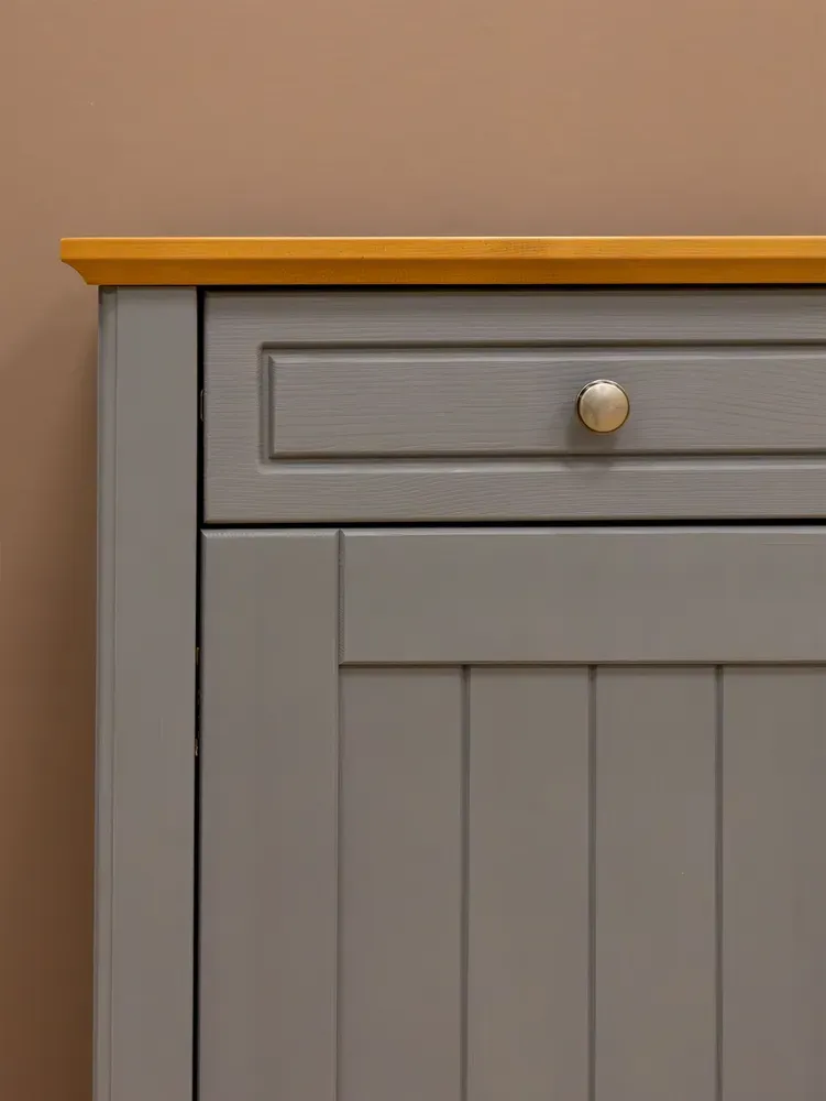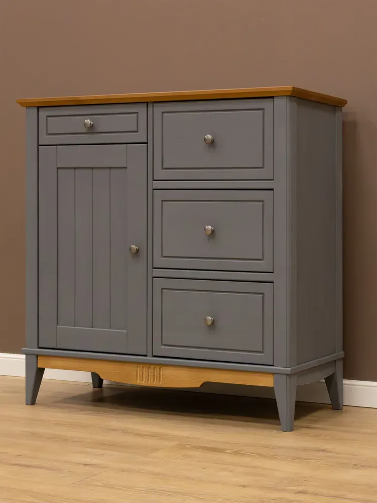 Оригинальное цветовое решение: Корпус комода выдержан в спокойном сером тоне (RAL 7046), крышка и нижняя декоративная планка окрашены в тёплый цвет антик, через который просвечивает текстура дерева. Донья ящиков сделаны из оргалита, стенки ящиков окрашены в цвет корпуса. Эта модель комода также предлагается в отделках «белый воск/антик» и «черный/антик».