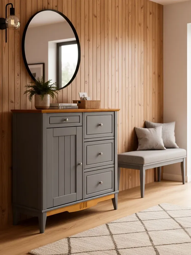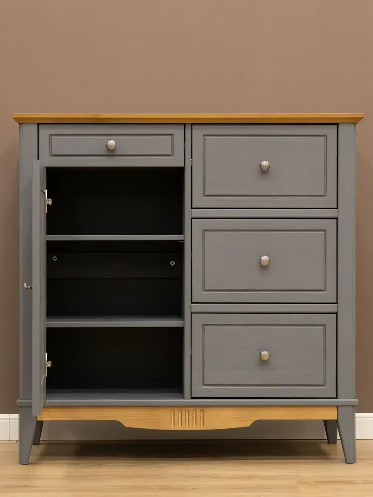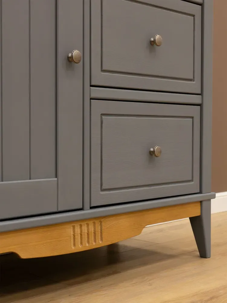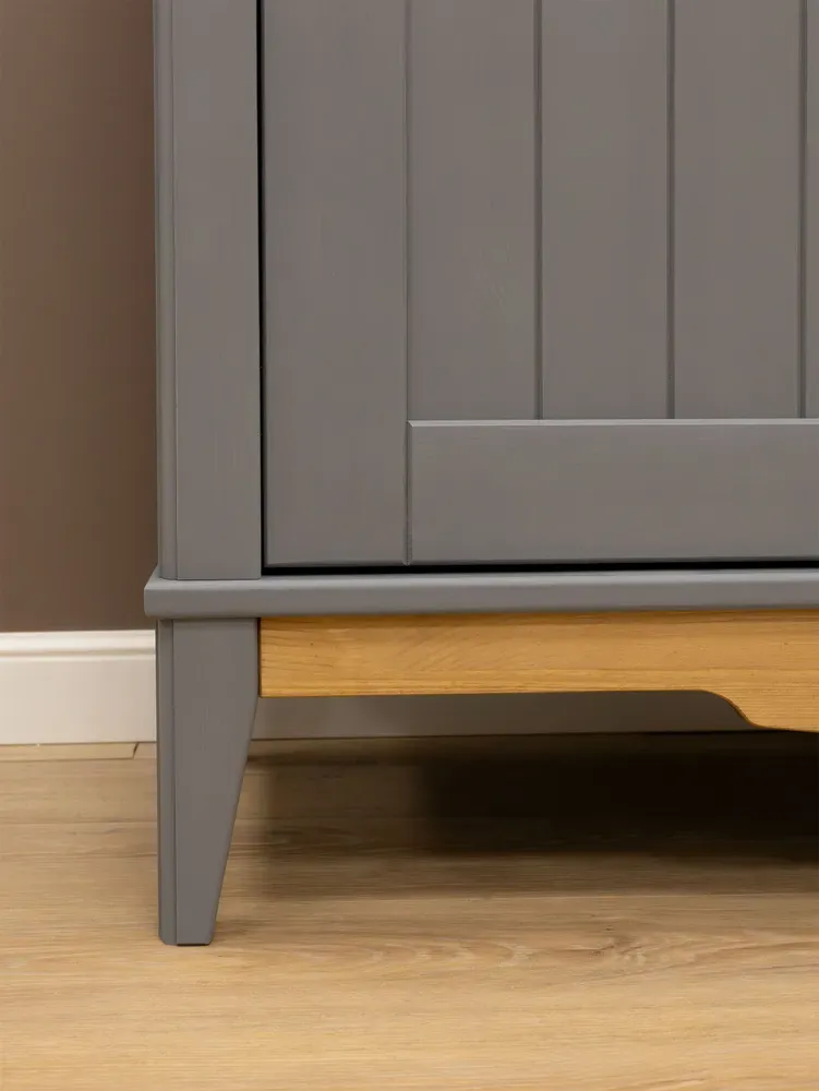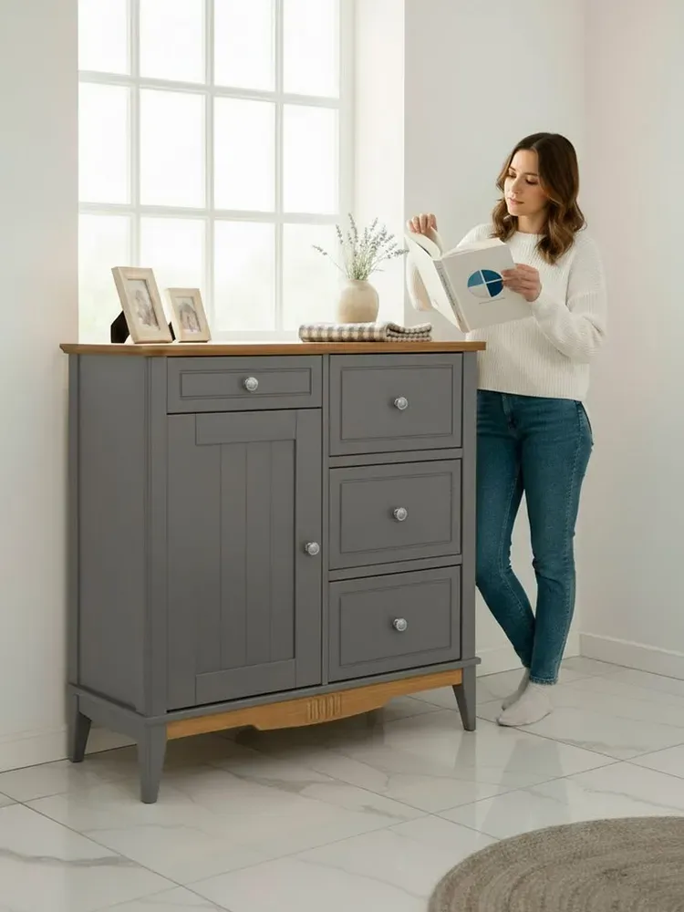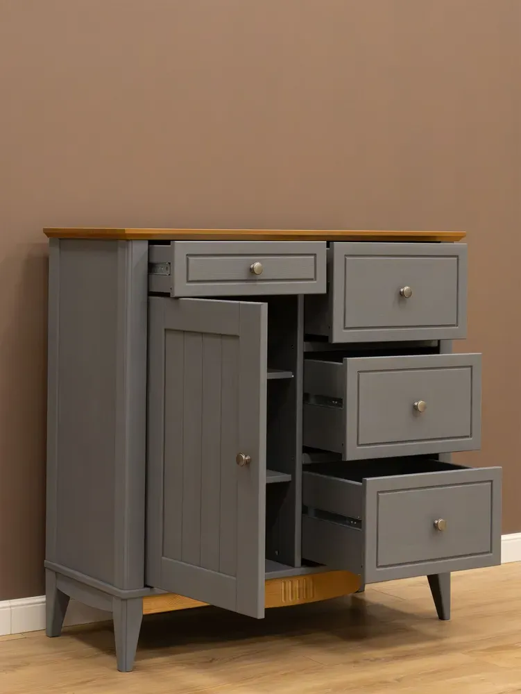 Оригинальный дизайн: Комод выполнен в лаконичном скандинавском стиле. Фасады украшены простой декоративной фрезеровкой, на ящиках и дверце устанавливаются металлические ручки-кнопки с эффектом старения.