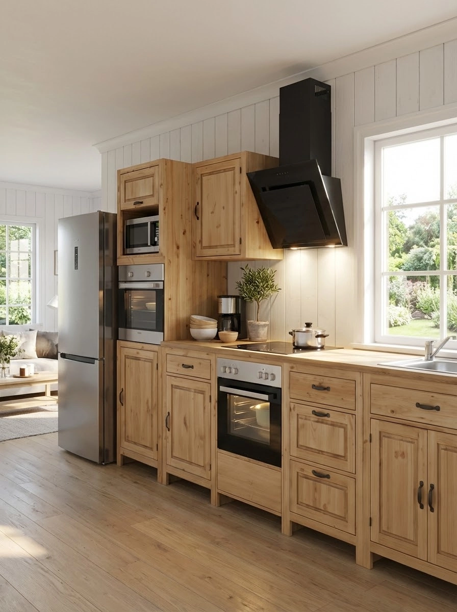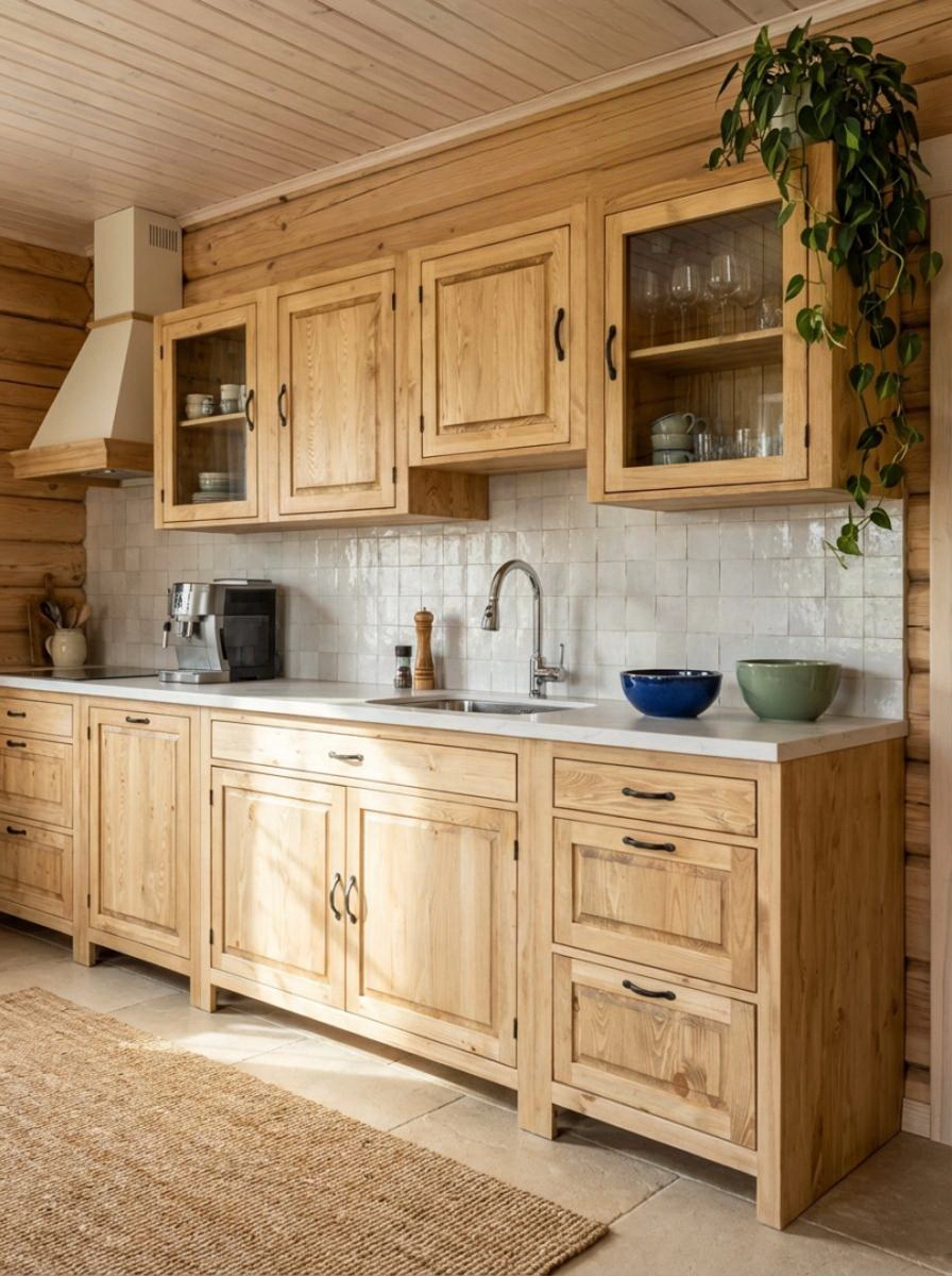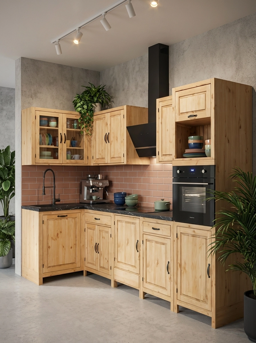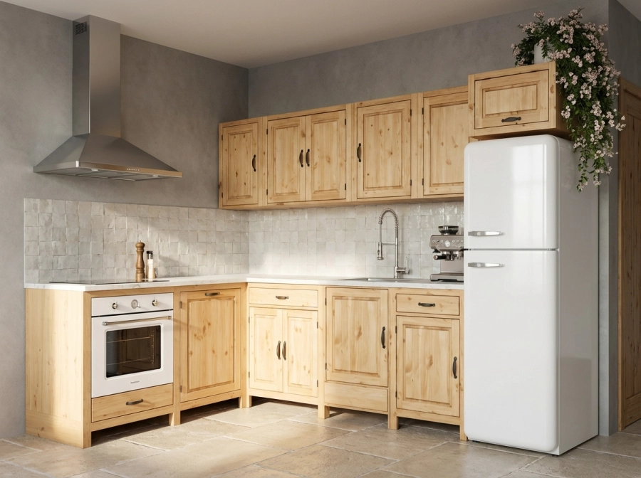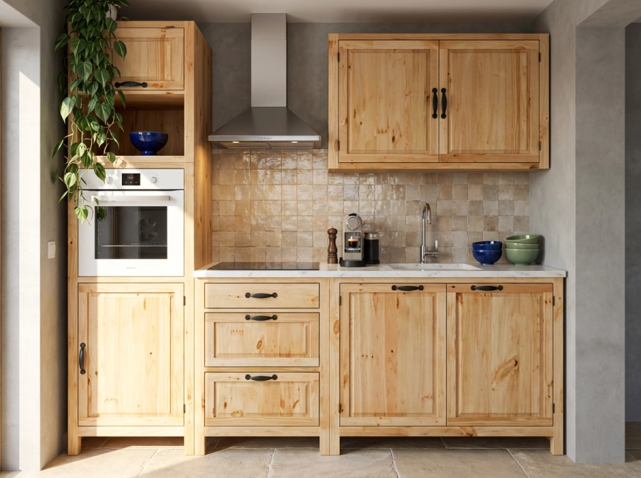 Кухня «Шалёр» – универсальная модульная система из массива сосны, которая поставляется в собранном виде: достаточно распаковать и установить — никаких сложных сборок. Коллекция включает базовые шкаф-столы с распашными дверцами и выдвижными ящиками, угловые модули, а также специализированные тумбы под мойку, варочную панель и духовой шкаф.