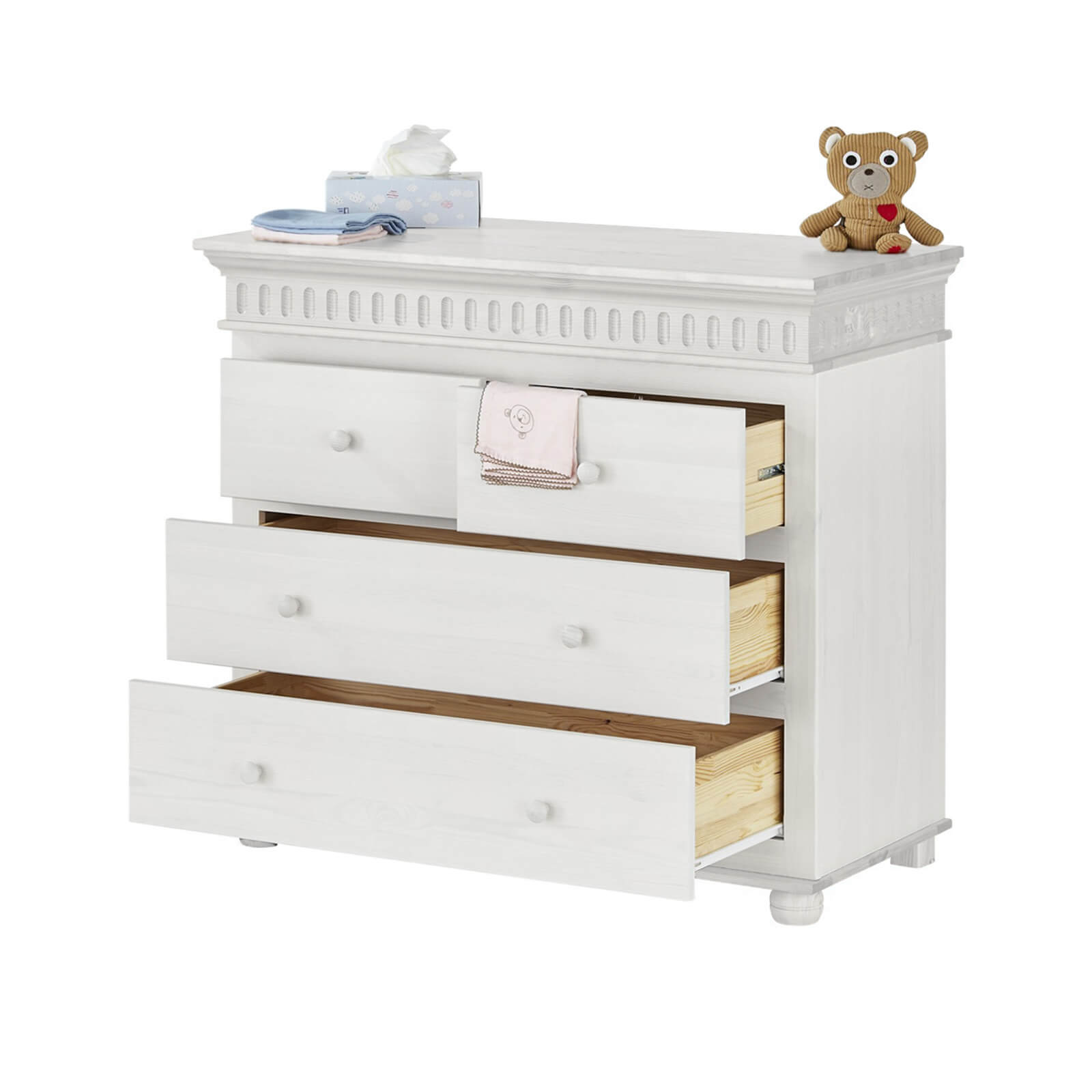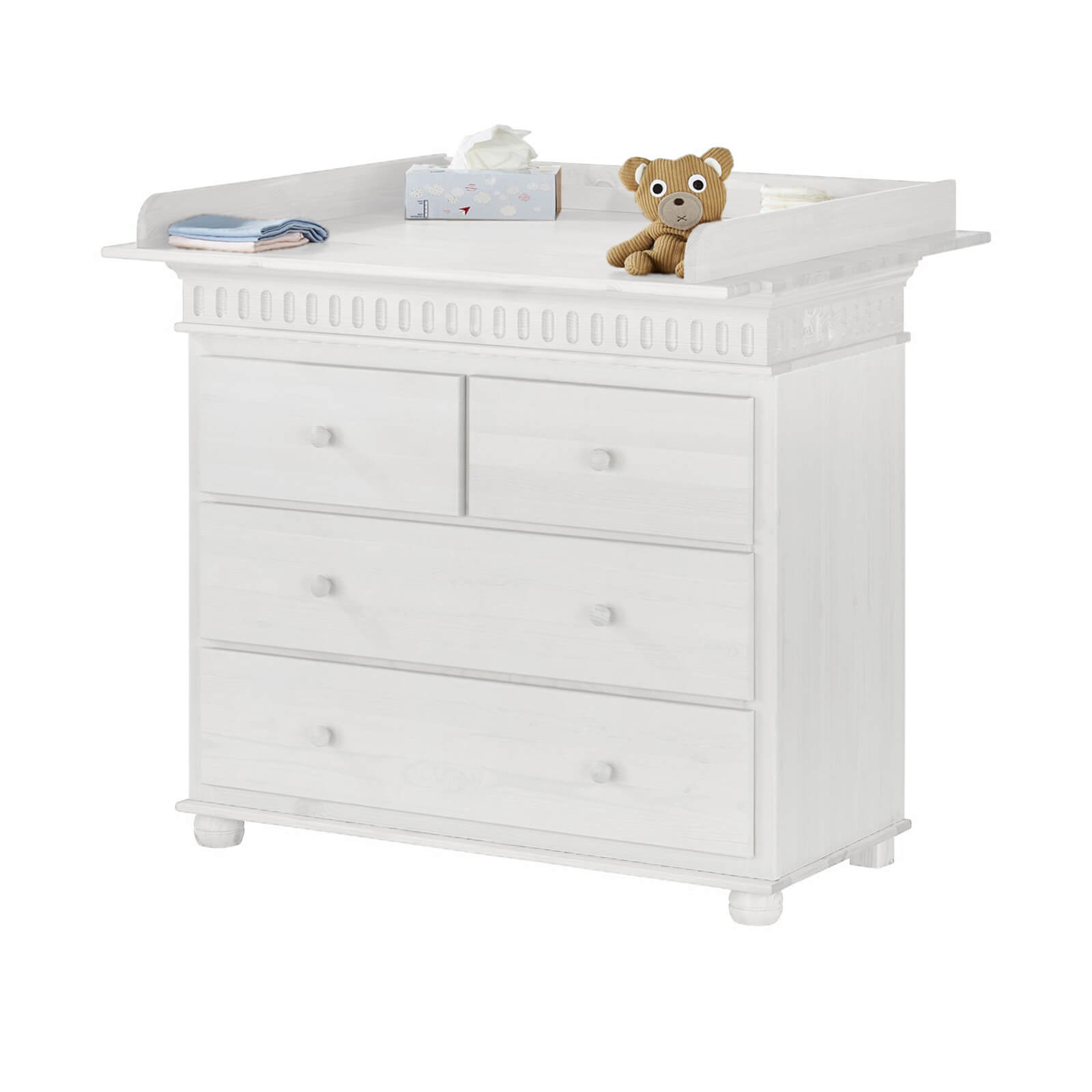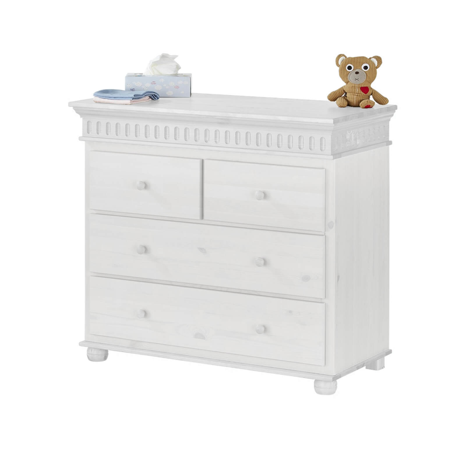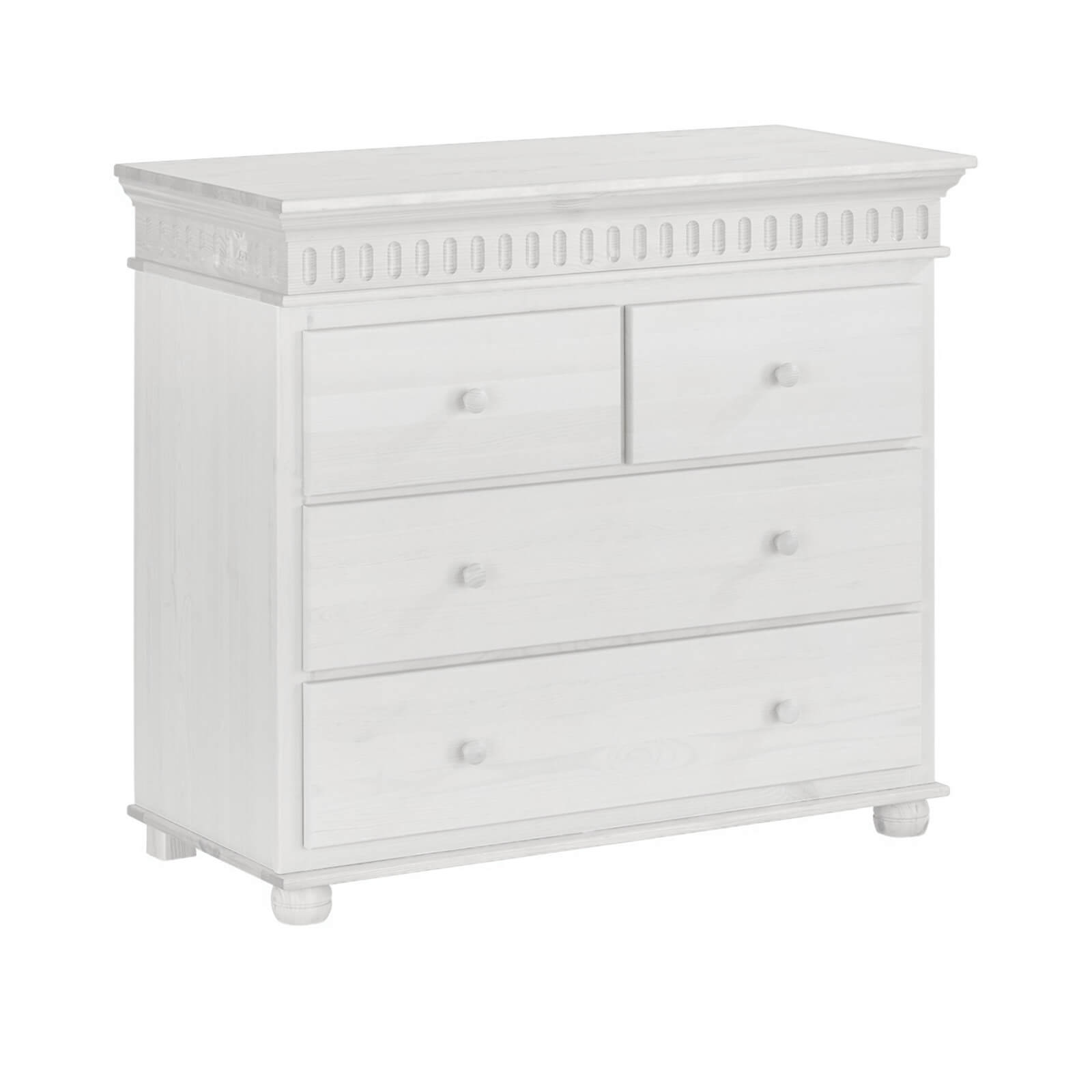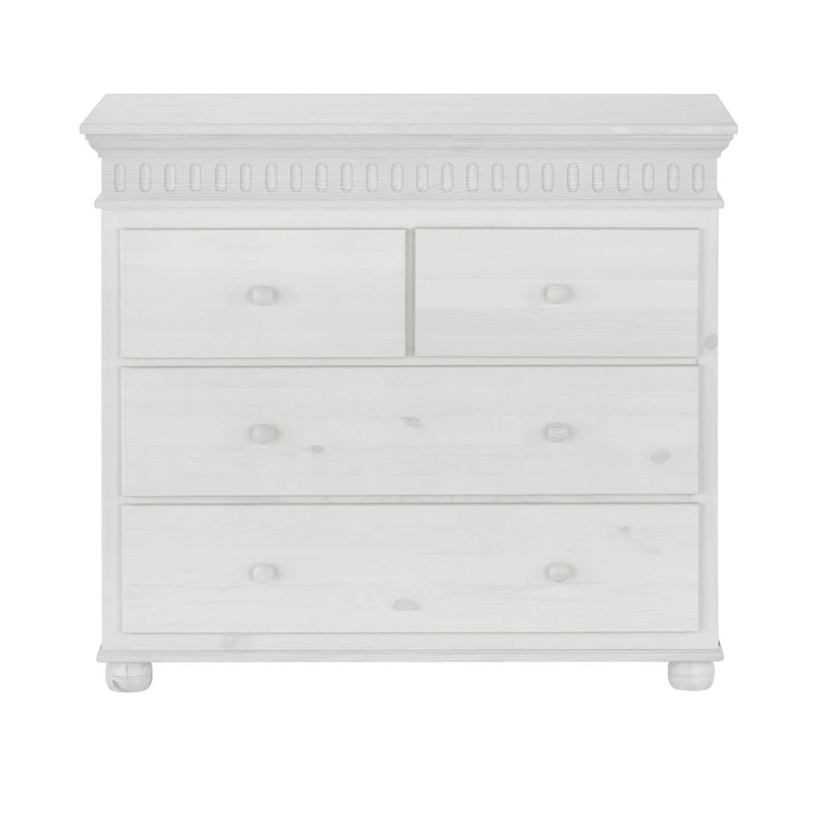 Комод «Хельсинки» — это отличный выбор для молодых родителей, которые хотят создать уютную и функциональную обстановку в комнате своего ребёнка. Комод оснащён четырьмя выдвижными ящиками: два широких и два узких. Это позволяет удобно хранить вещи и поддерживать порядок в детской комнате.