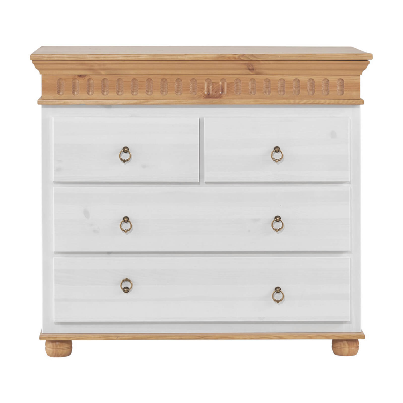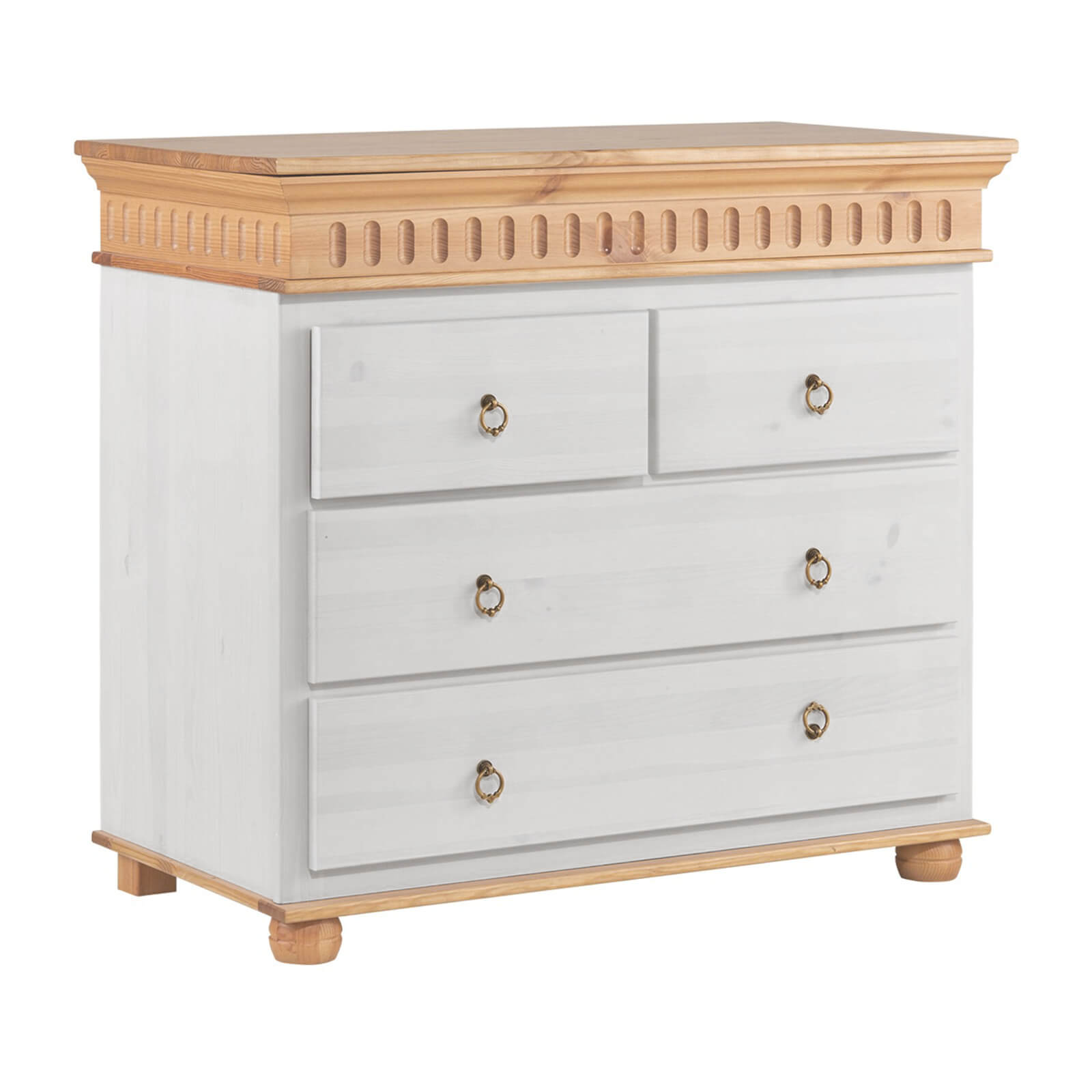 Размеры комода составляют 95 x 87 x 50 см. Фурнитура произведена в Германии. Вы можете выбрать один из четырёх вариантов исполнения: серый, антик, белый воск УКВ или колониал.