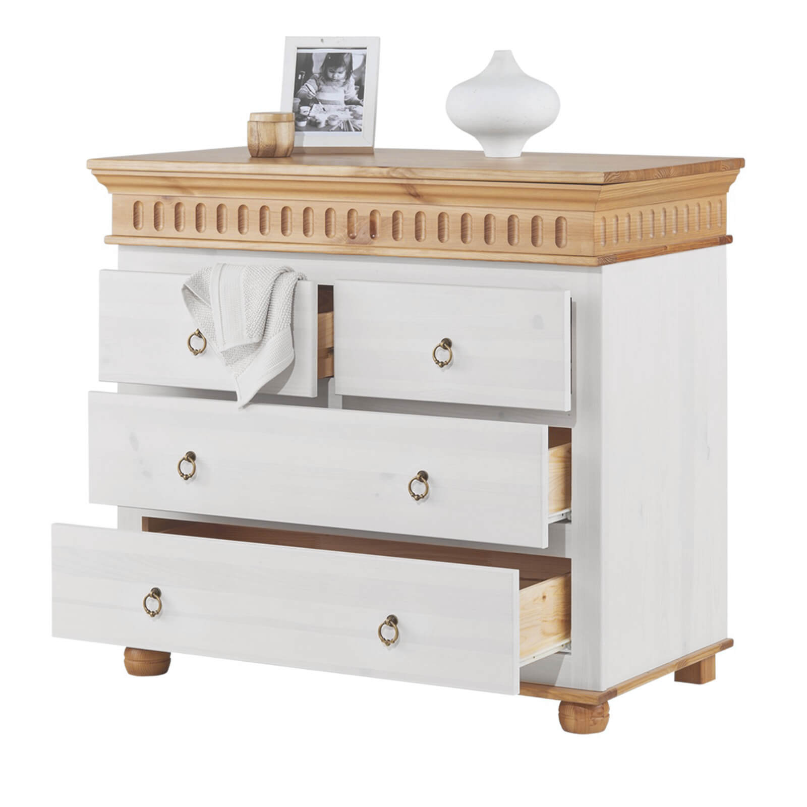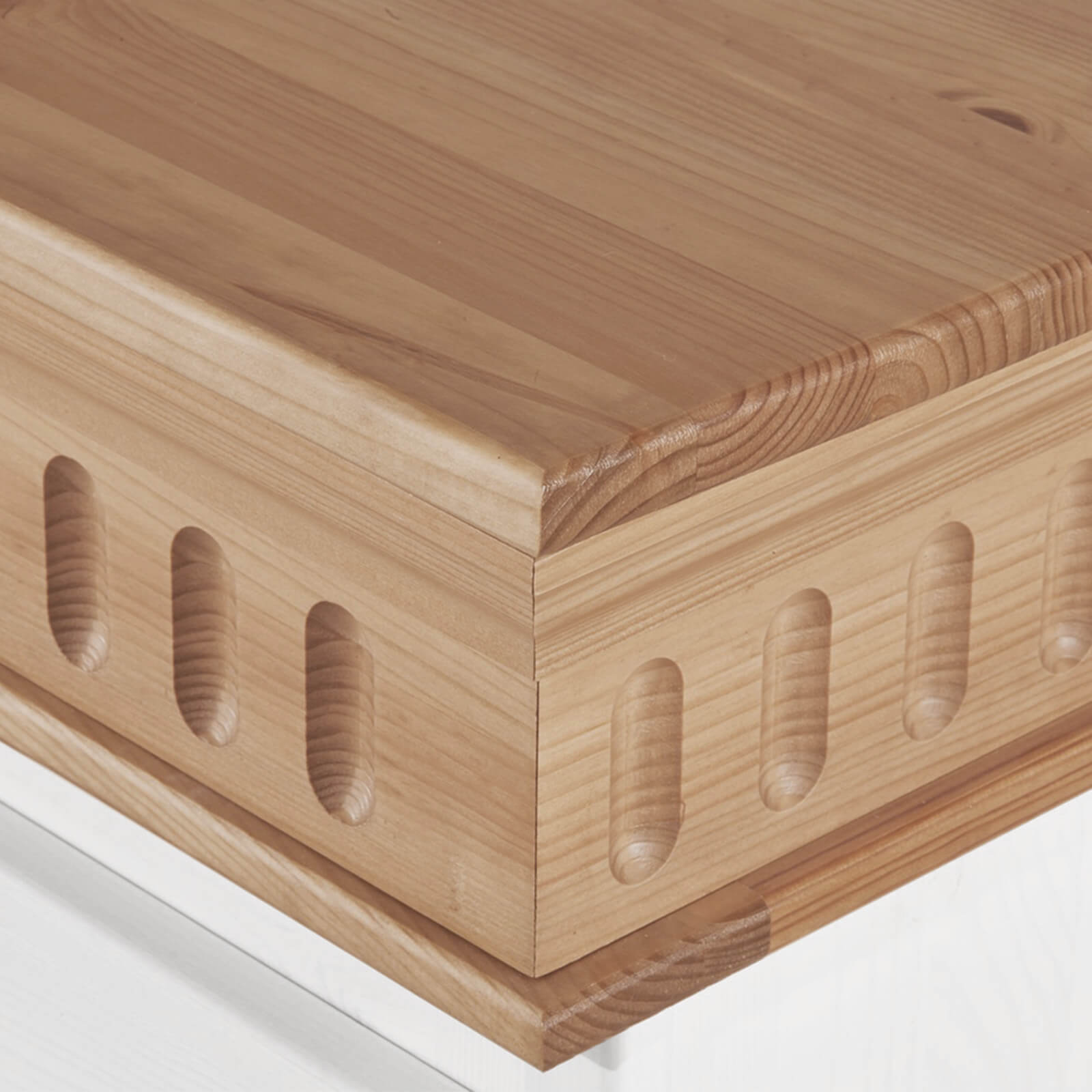 Комод оснащён четырьмя ящиками: двумя узкими выдвижными под столешницей и двумя широкими — ниже. Они идеально подойдут для хранения постельного белья.