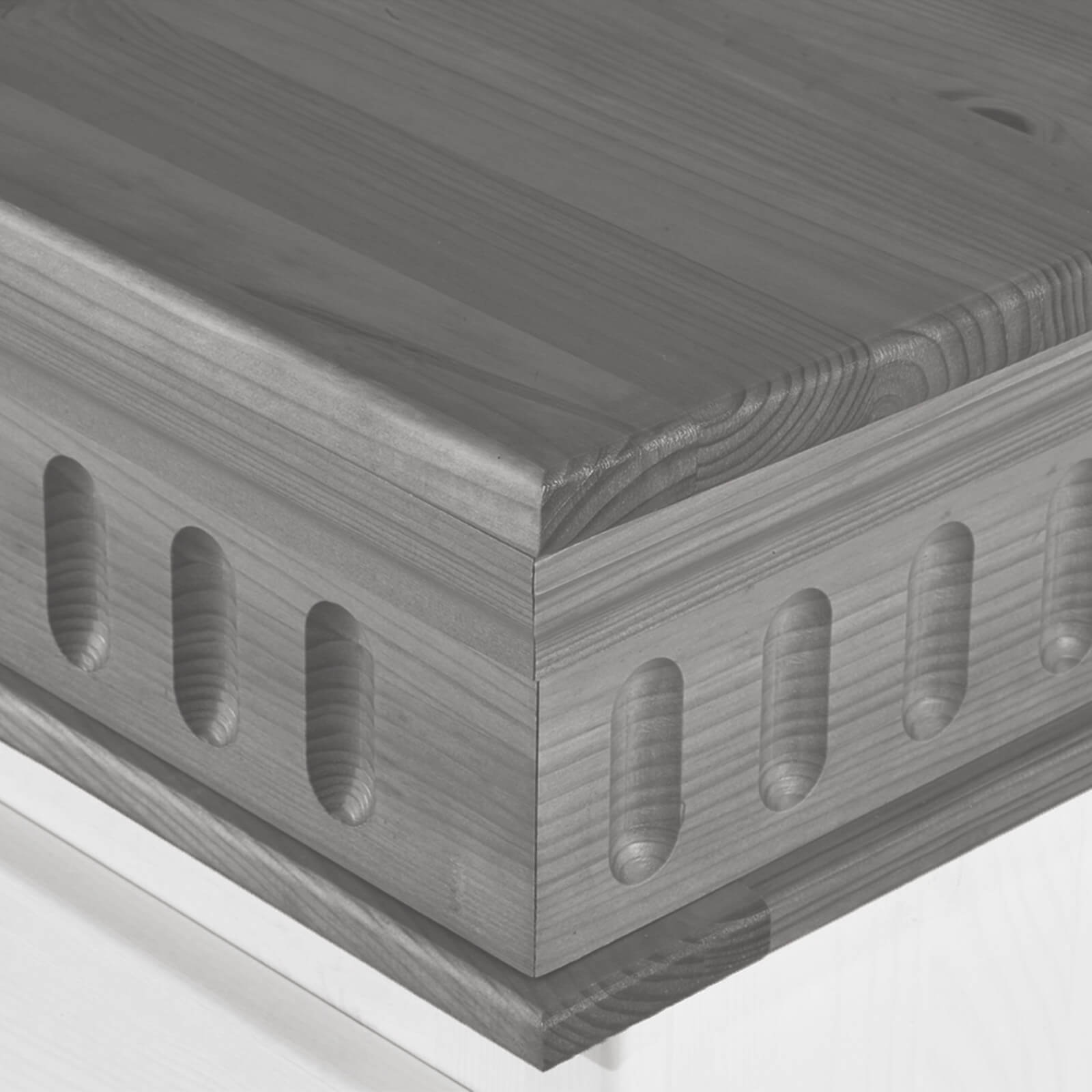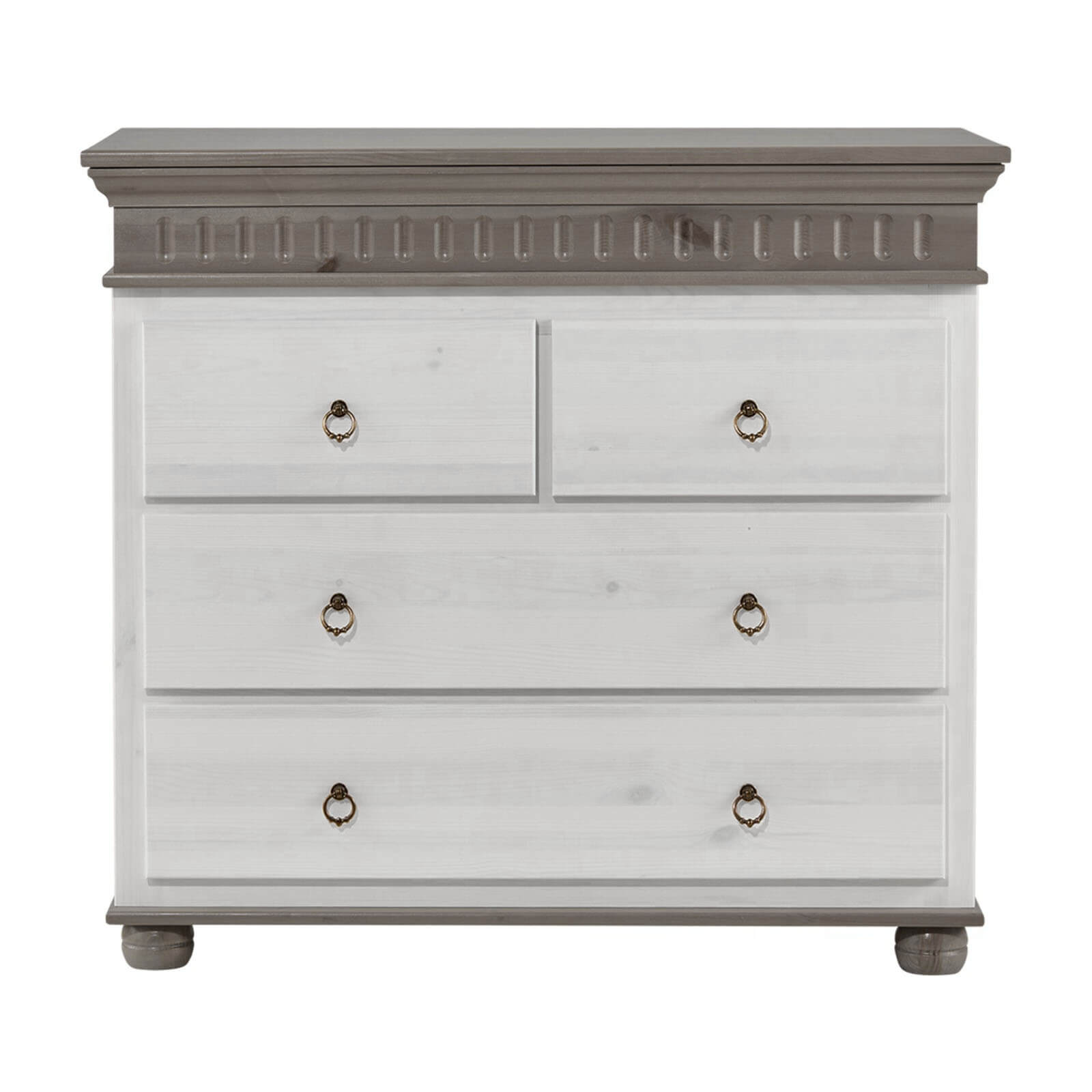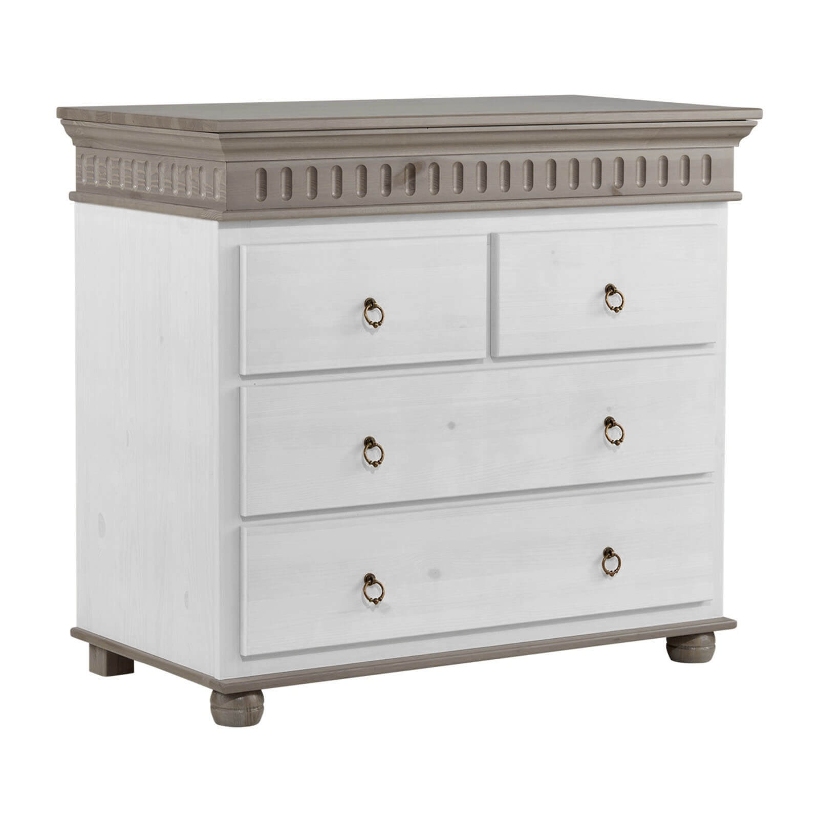 Размеры комода составляют 95 x 87 x 50 см. Фурнитура произведена в Германии. Вы можете выбрать один из четырёх вариантов исполнения: серый, антик, белый воск УКВ или колониал.