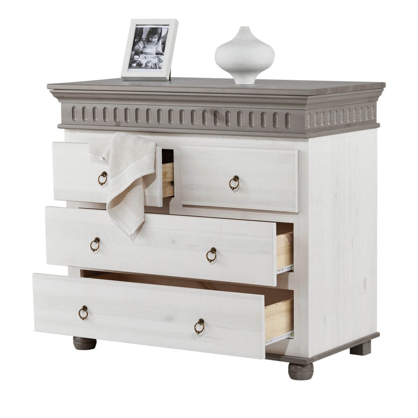 Комод оснащён четырьмя ящиками: двумя узкими выдвижными под столешницей и двумя широкими — ниже. Они идеально подойдут для хранения постельного белья.