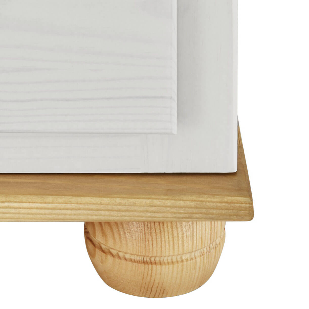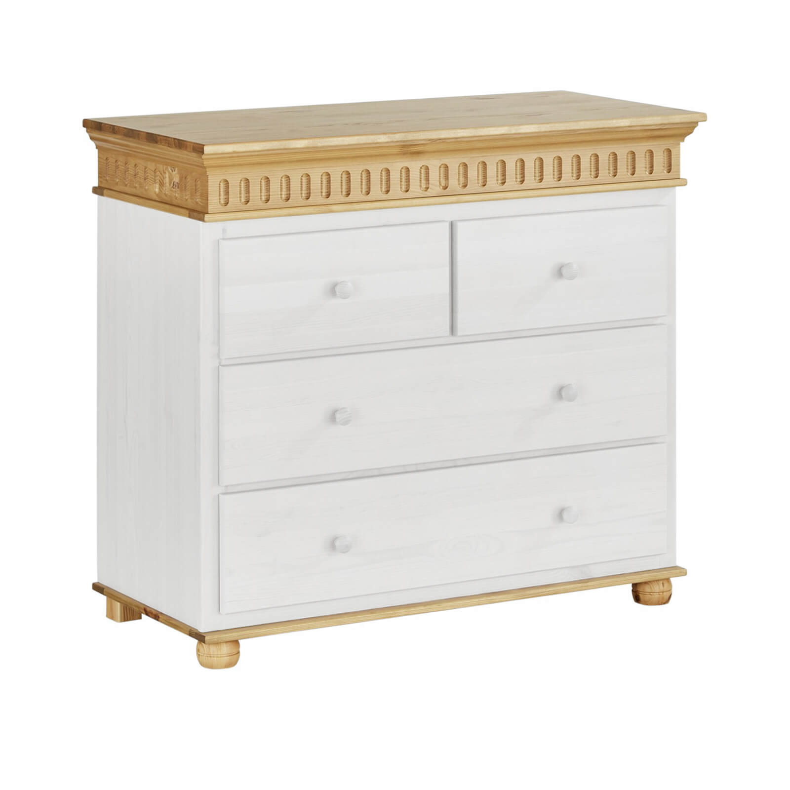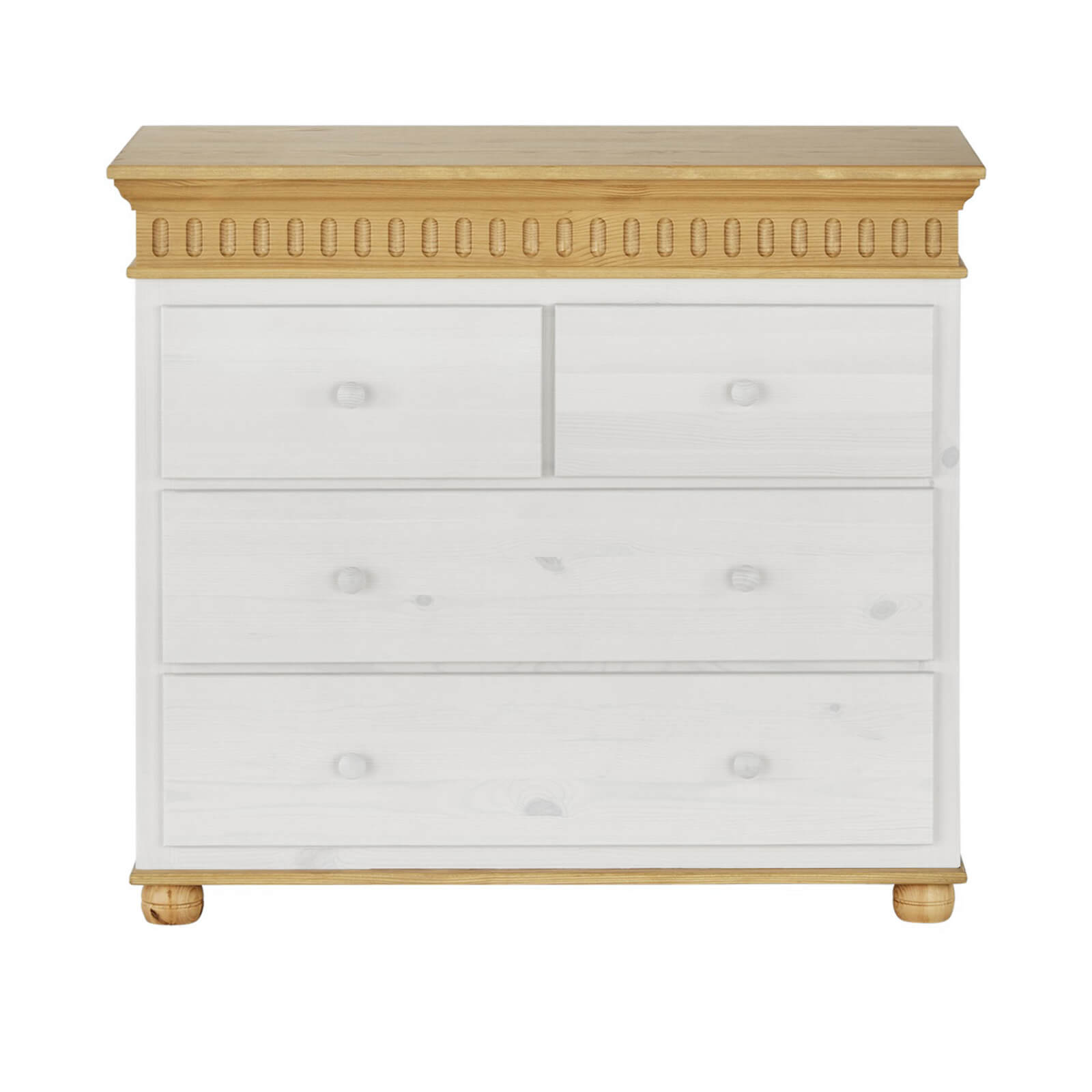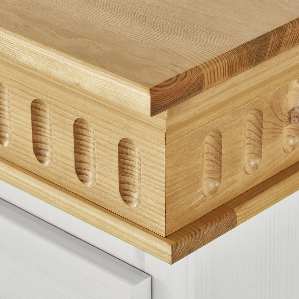 Размеры комода составляют 107 х 95 х 50 см. Он выполнен из массива сосны, а задняя стенка изготовлена из HDF — древесноволокнистой плиты высокой плотности, ламинированной с одной стороны. В комплекте идёт крепкая немецкая фурнитура.