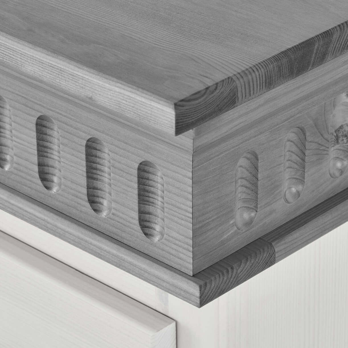 Размеры комода составляют 1070 х 500 х 950 мм. Он выполнен из массива сосны, а задняя стенка изготовлена из HDF — древесноволокнистой плиты высокой плотности, ламинированной с одной стороны. В комплекте идёт крепкая немецкая фурнитура.