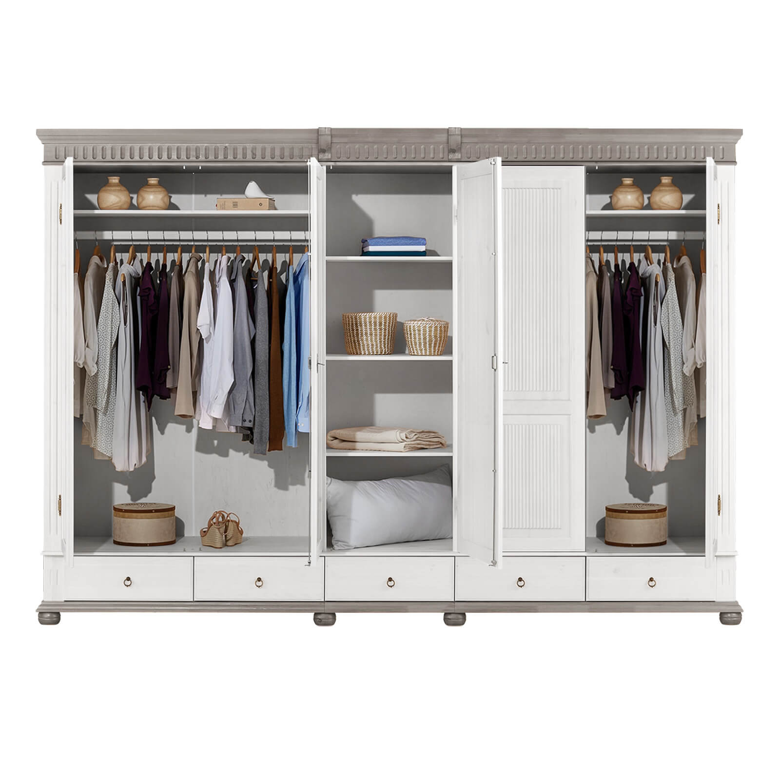 Он оснащен 5 распашными дверями, за которыми находятся два отделения для одежды со штангами и секции с полками для других вещей и головных уборов. Под каждой дверью находятся выдвижные ящики.