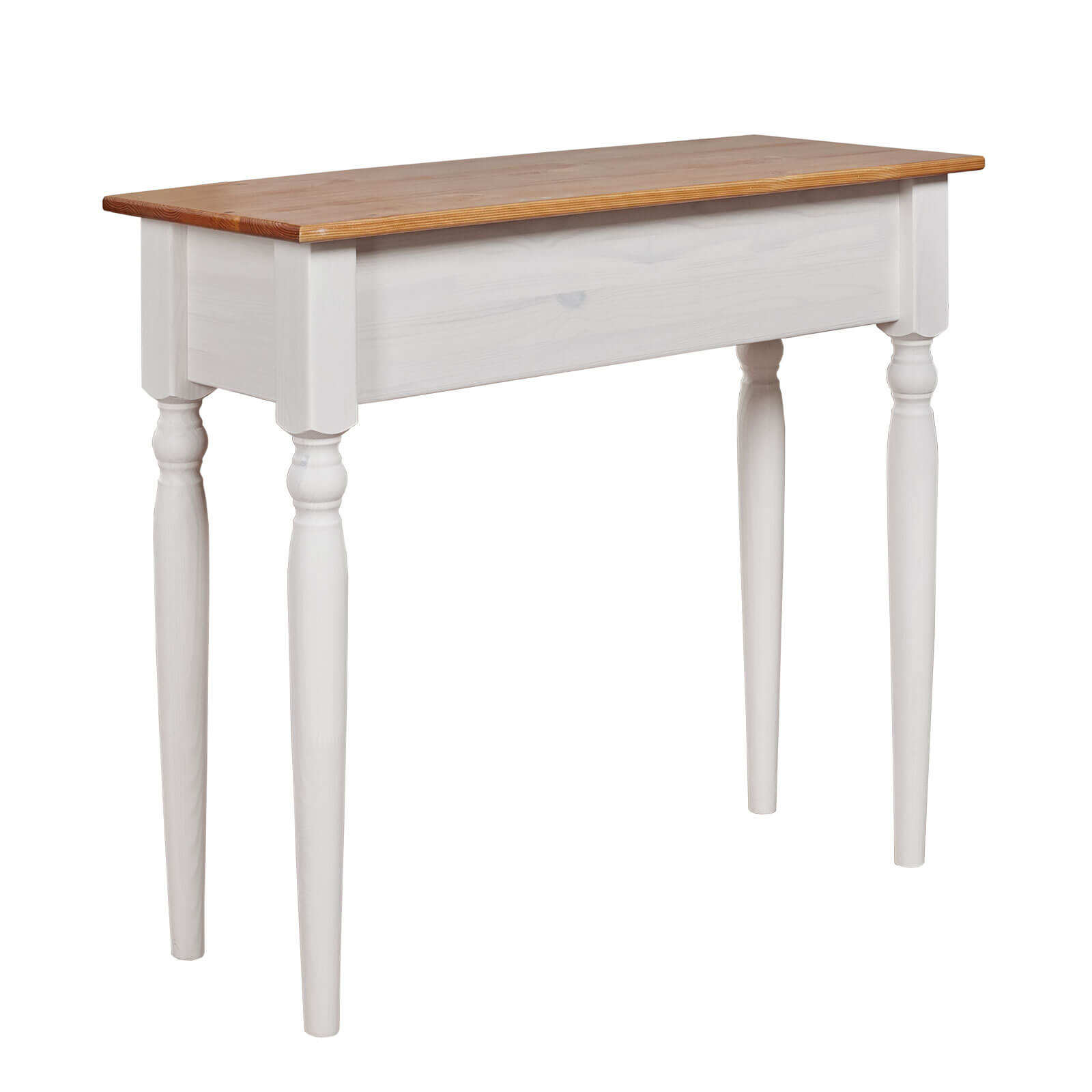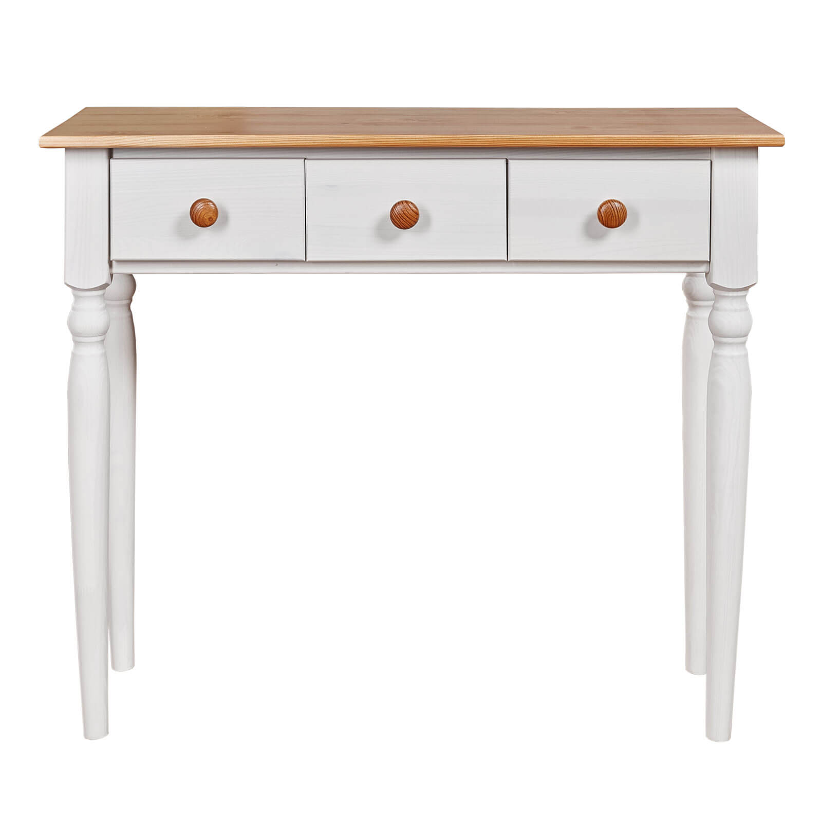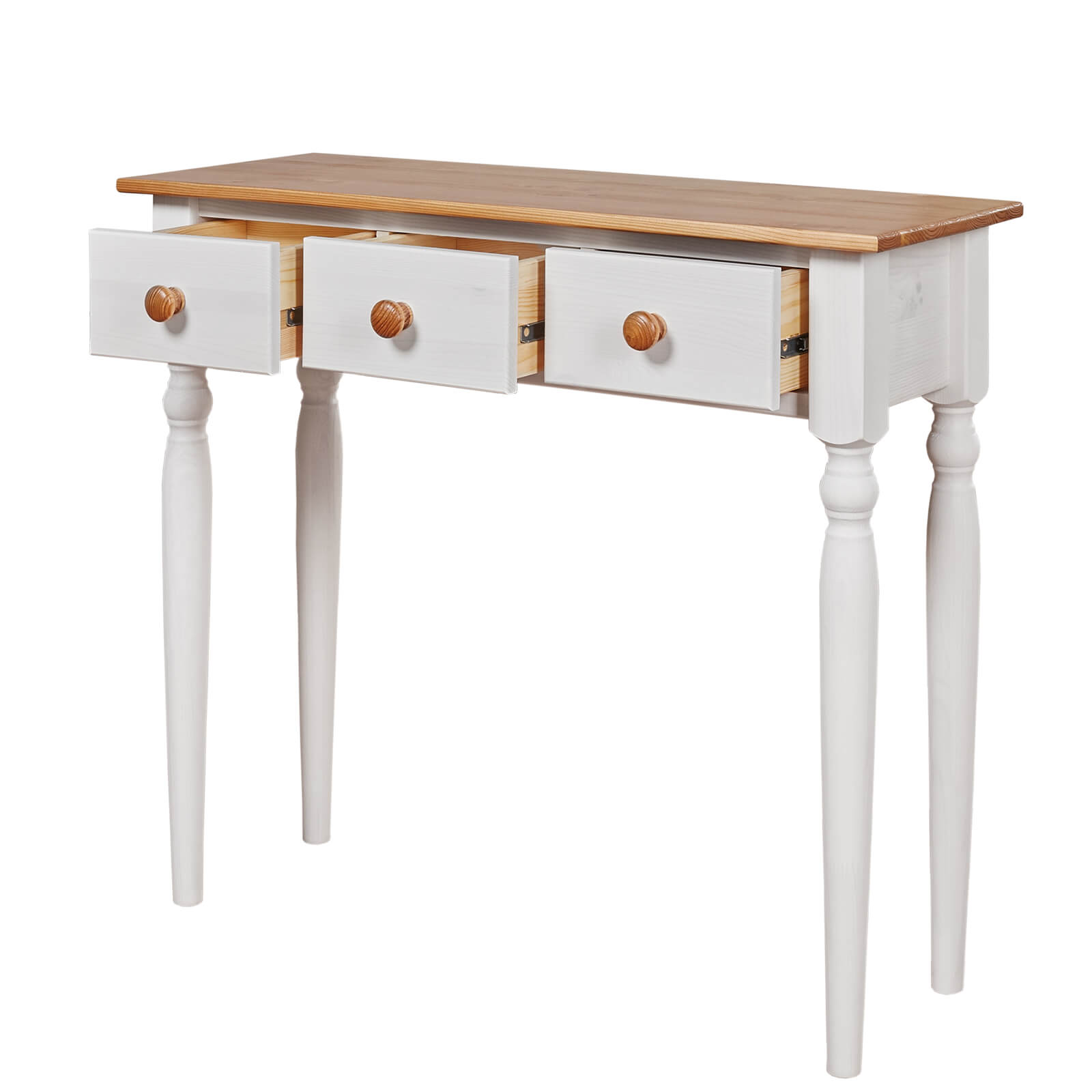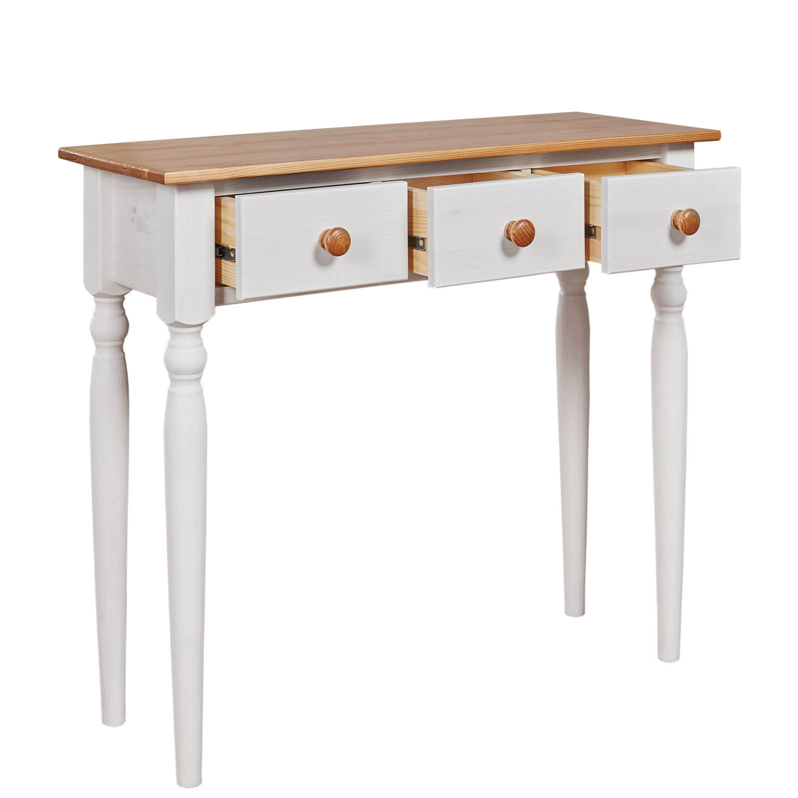 Эта модель консоли представляет собой небольшой столик с тремя выдвижными ящиками из массива сосны. Высокие резные ножки придают ей изящный вид, а ящики позволяют хранить мелочи, которые всегда должны быть под рукой. Консоль может служить подставкой для лампы, вазы или памятных вещей. Над ней можно повесить зеркало или картину, что добавит интерьеру завершённости.