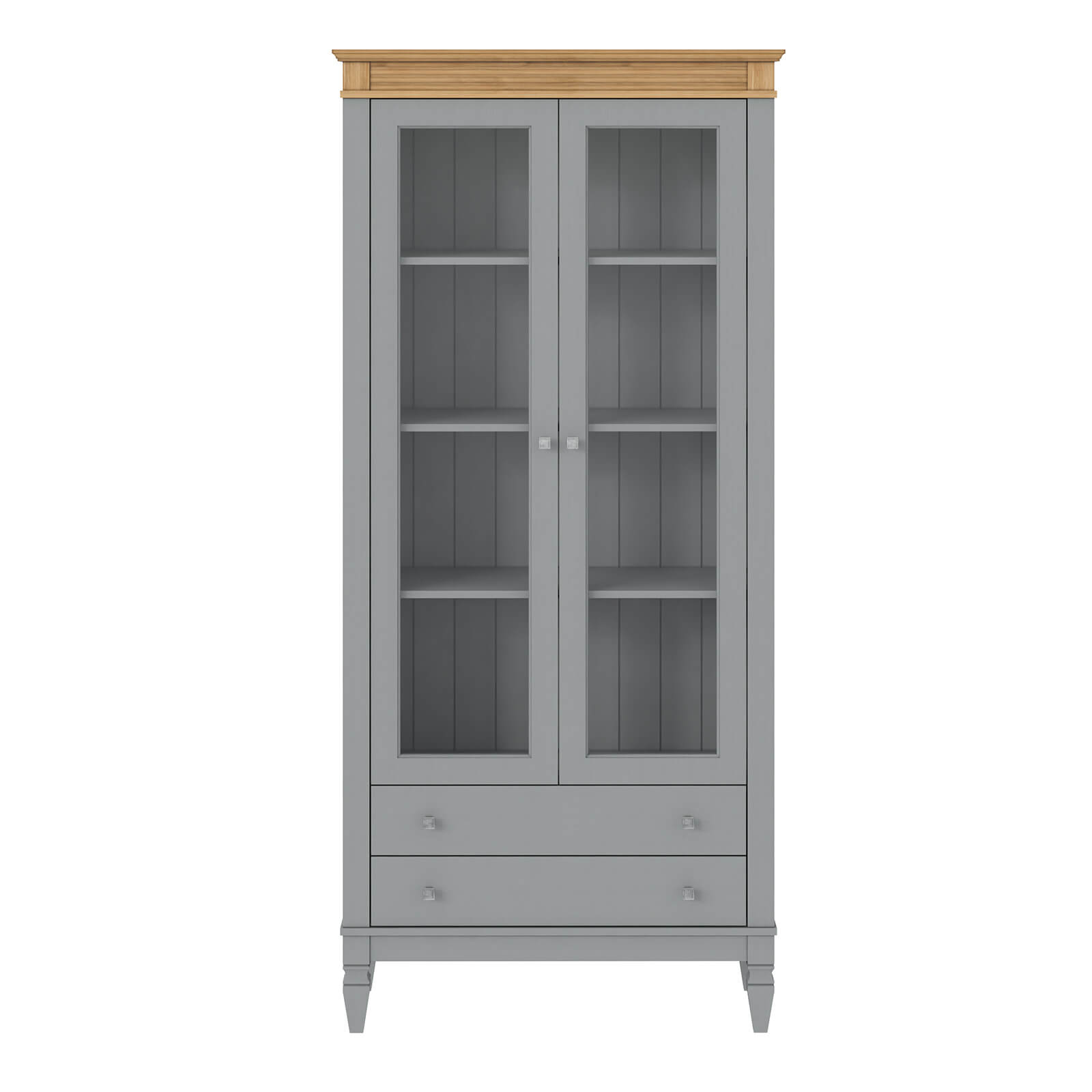 Оснащен двумя ящиками и четырьмя вместительными полками за стеклянными распашными дверями.