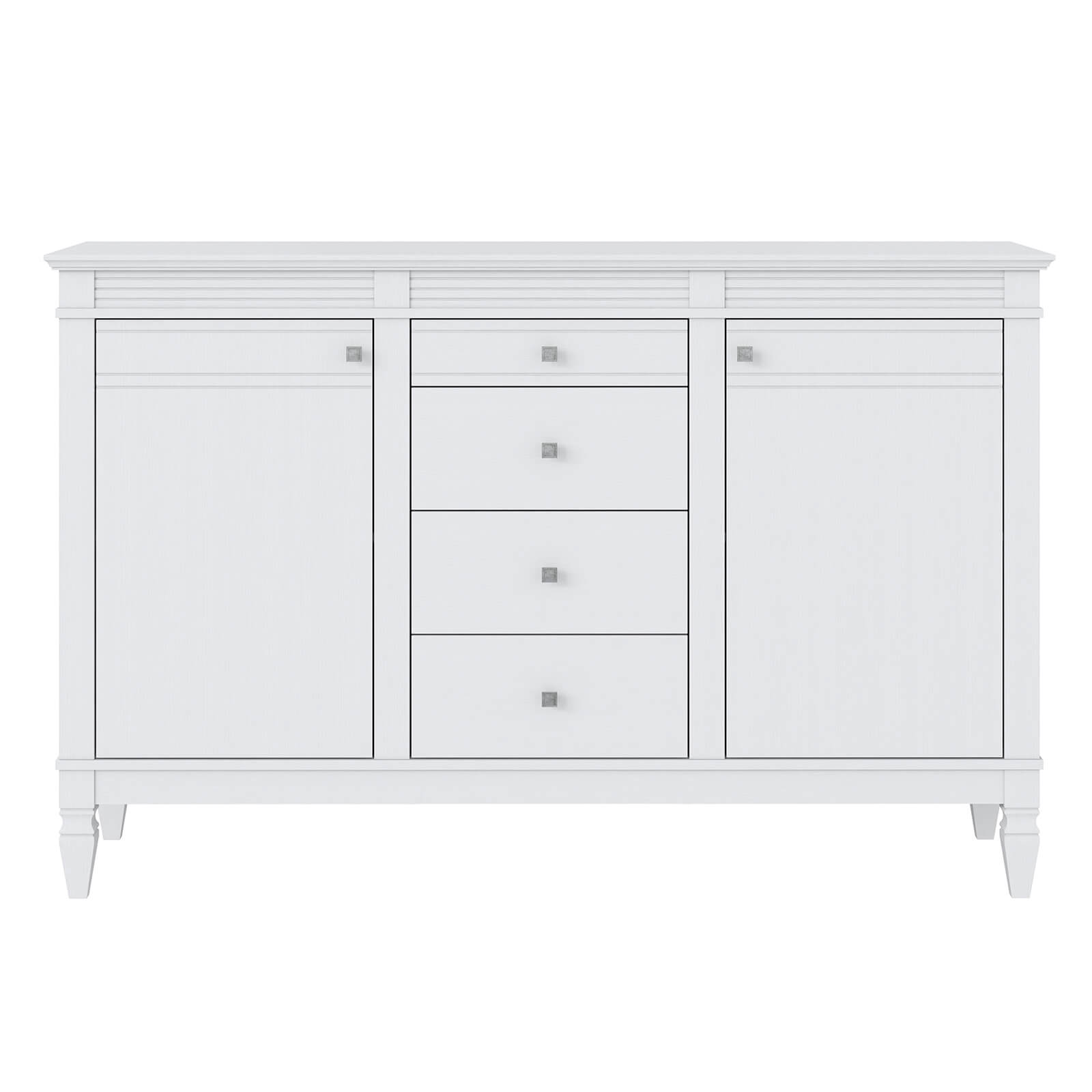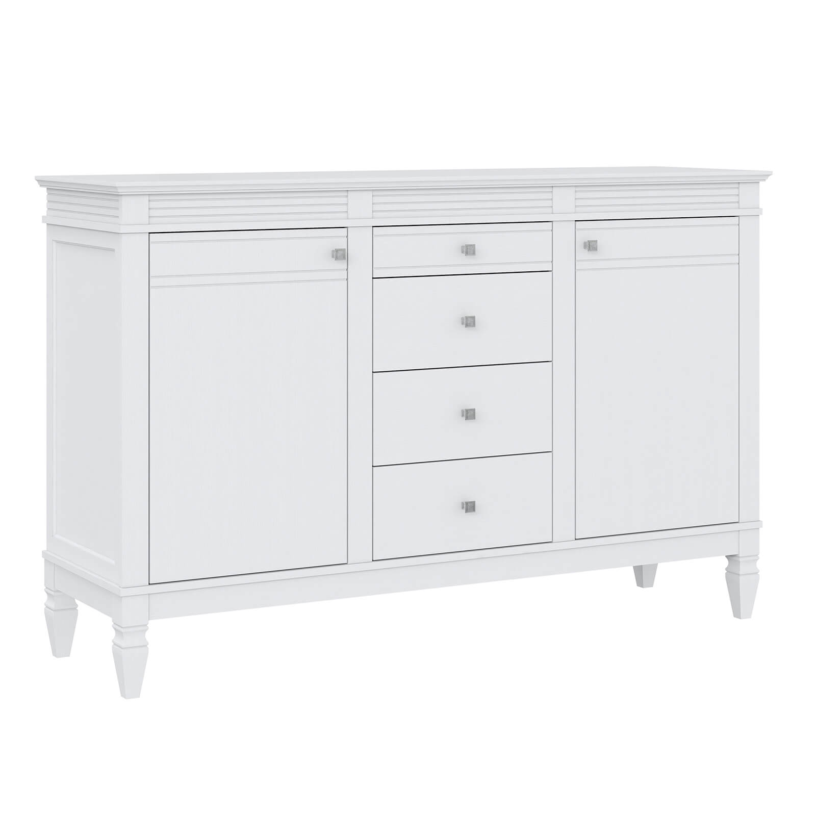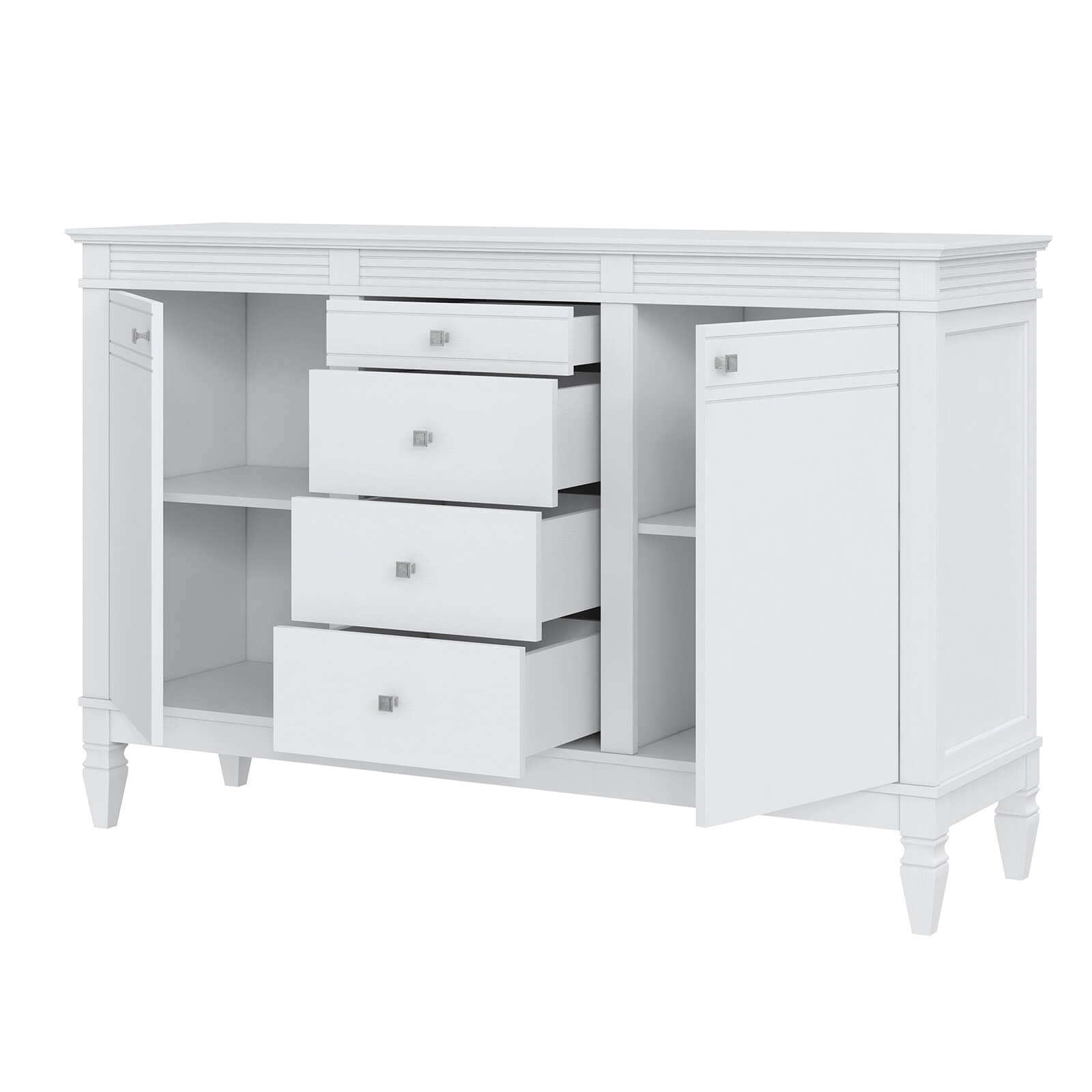 Комод оснащен двумя распашными дверками с полками внутри и четырьмя ящиками.