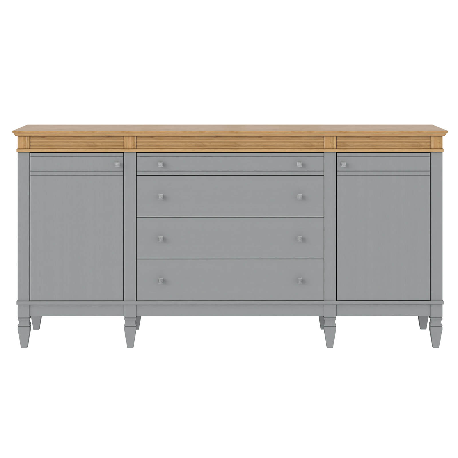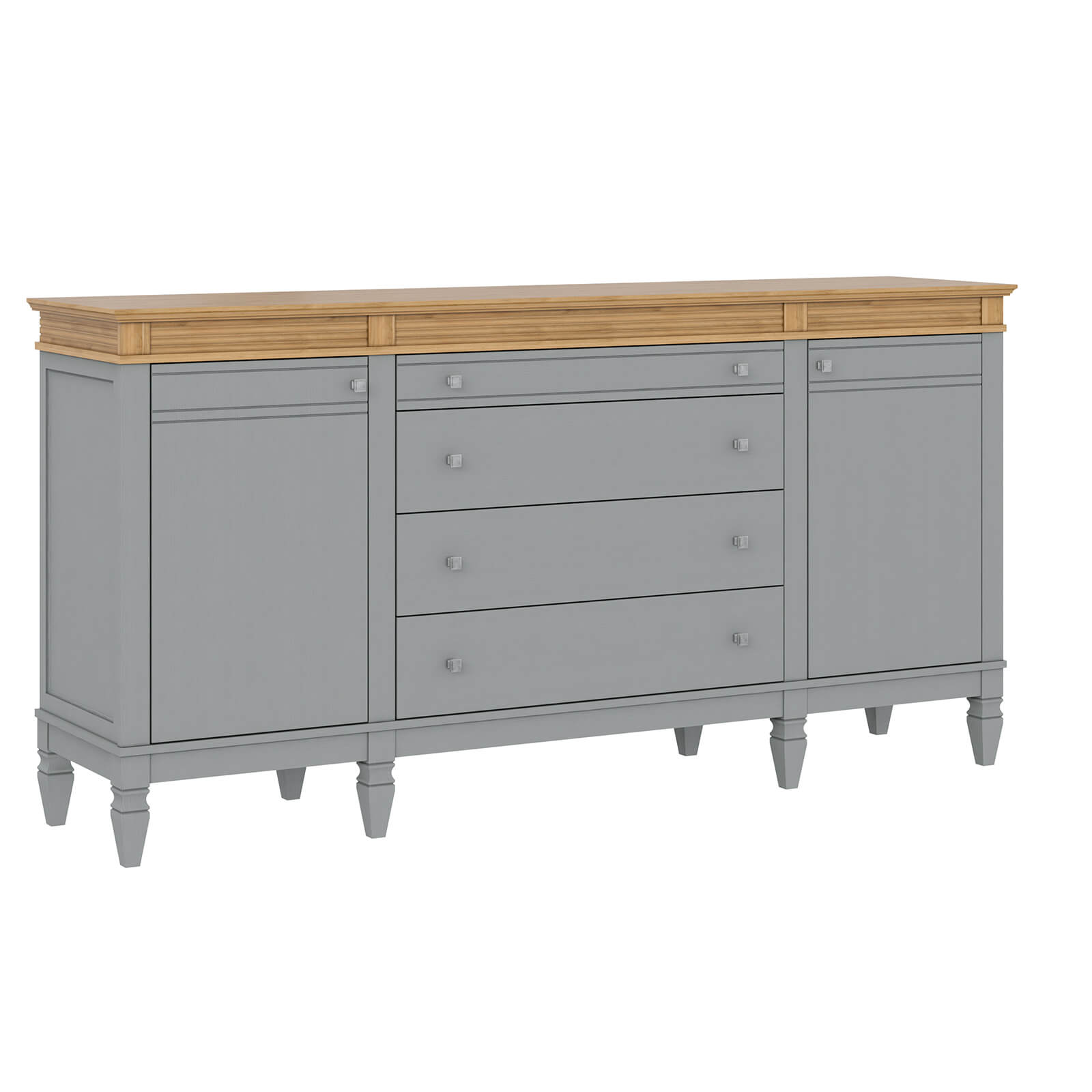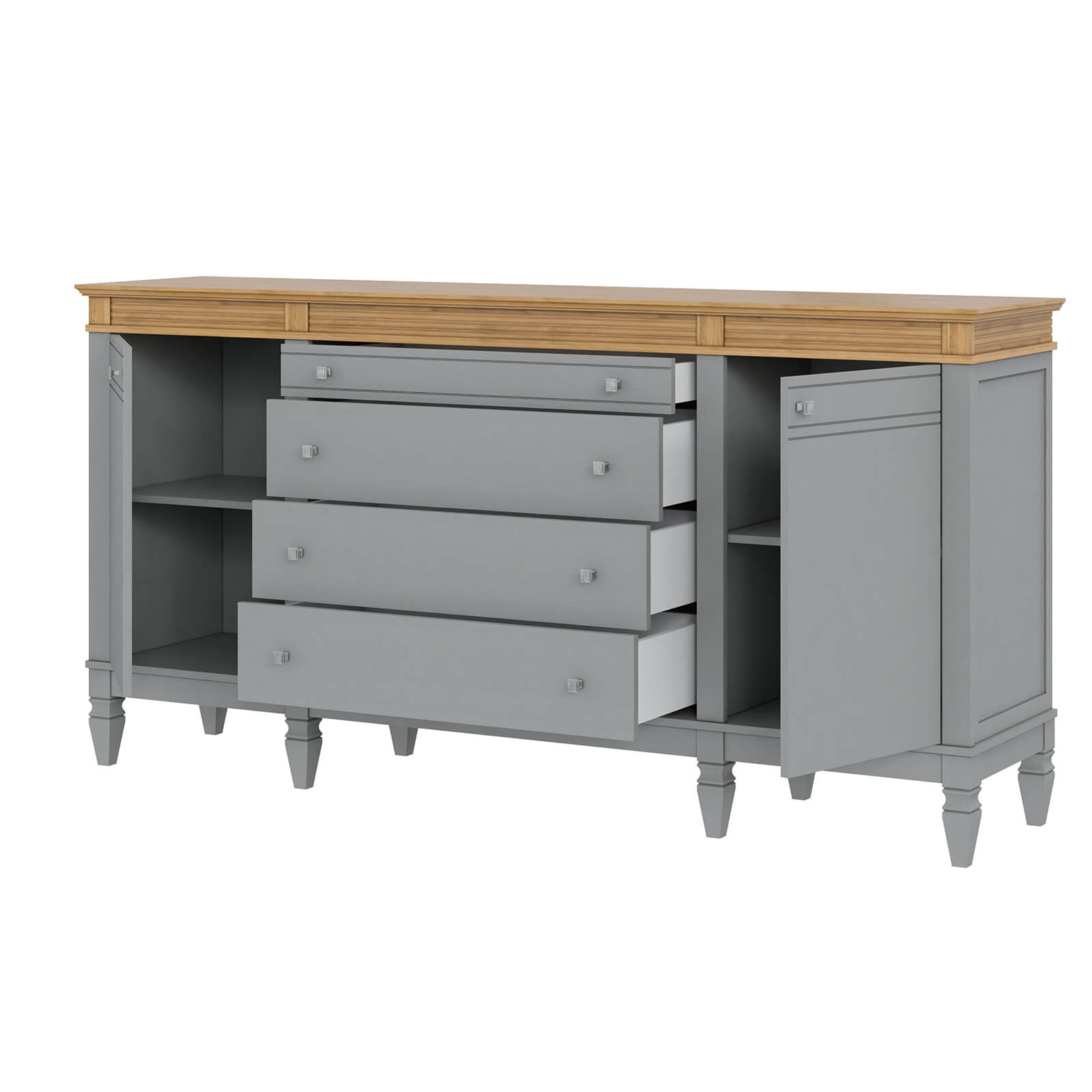 Комод оснащен двумя распашными дверками с полками внутри и четырьмя широкими ящиками.