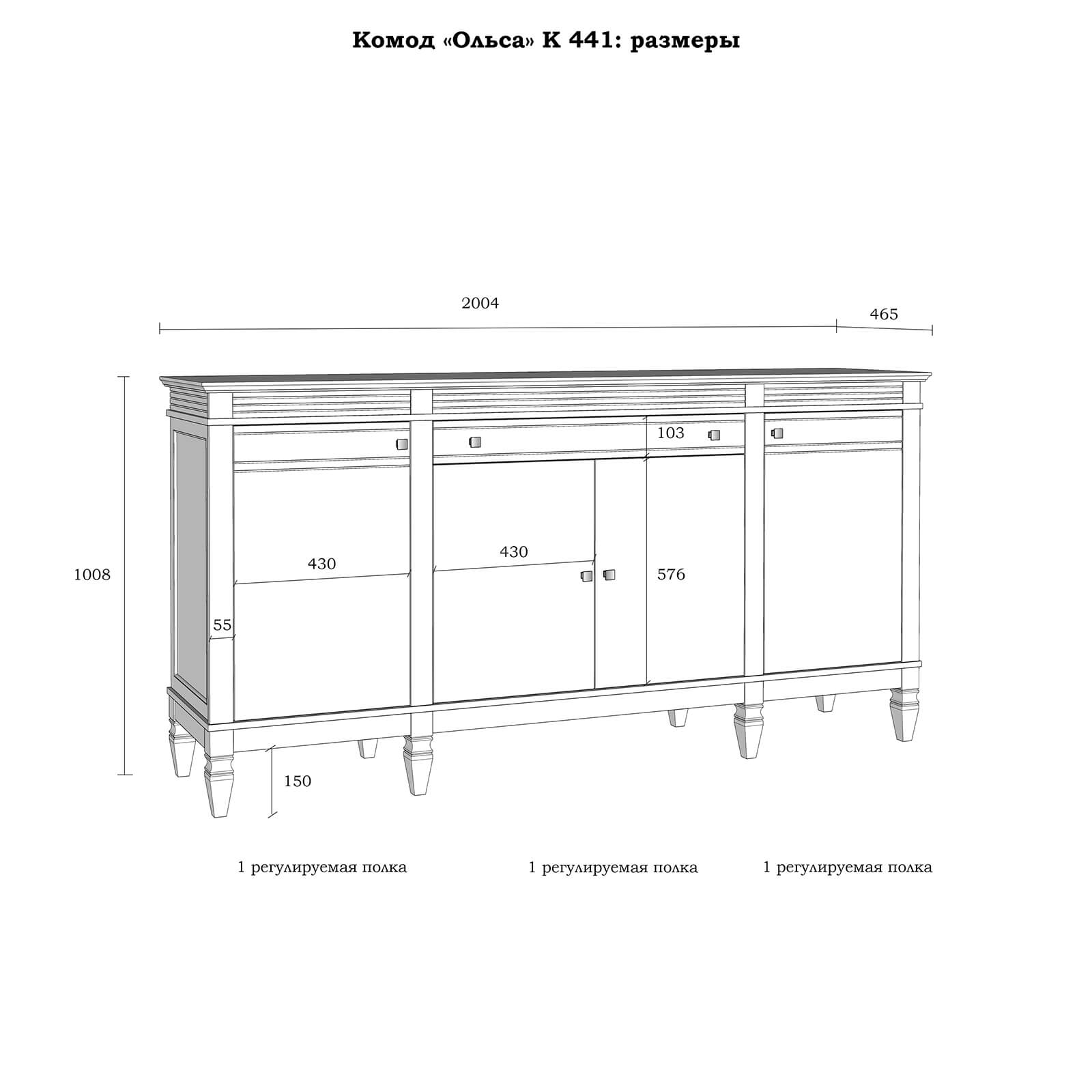 Комод Ольса 441. Комод оснащен четырьмя распашными дверками с полками внутри и одним широким ящиком. Фурнитура на дверях и ящике с доводчиками. Высокие ножки обеспечивают оптимальный доступ при уборке. Особенности Размеры 2000 x 1010 x 465 мм; Из массива сосны; Цветовая отделка: «белый лак», «белый лак/антик 24», «серый-7042/антик 24»; 4 распашные двери; 1 ящик; Фурнитура Направляющие - BLUM (Германия), скрытого монтажа со встроенным демпфером (доводчиком плавного закрывания); Петли - HAFELE (Германия); Ручки - Giusti (Италия) стиль классика, имеют форму квадрата, материал металл, цвет серебро состаренное; Особенности покрытия Поверхности изделия обработаны лаками и красками, которые выгодно подчеркивают естественную красоту натуральной древесины. Таким образом обеспечивается защита от излишней влаги, появления плесени и грибков.