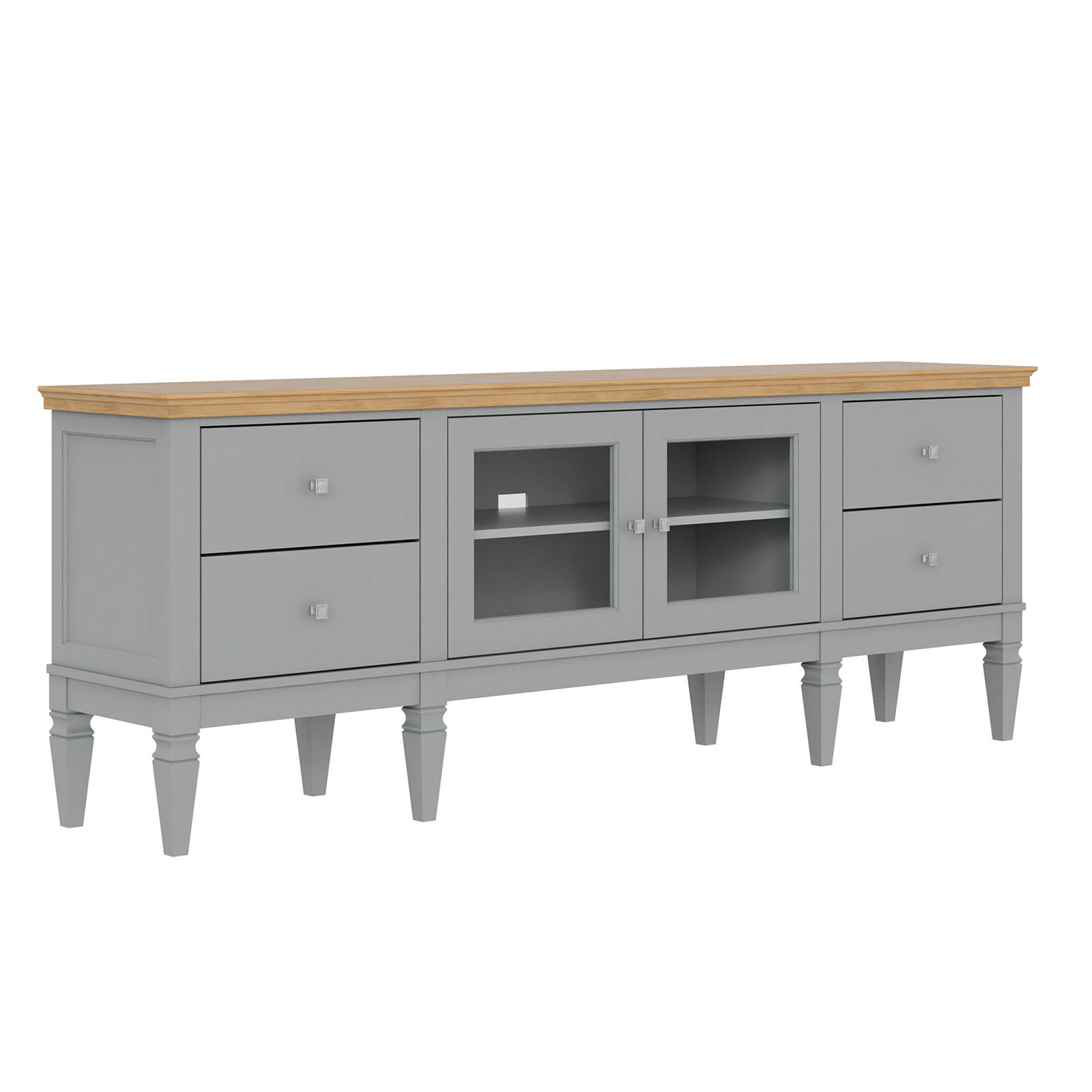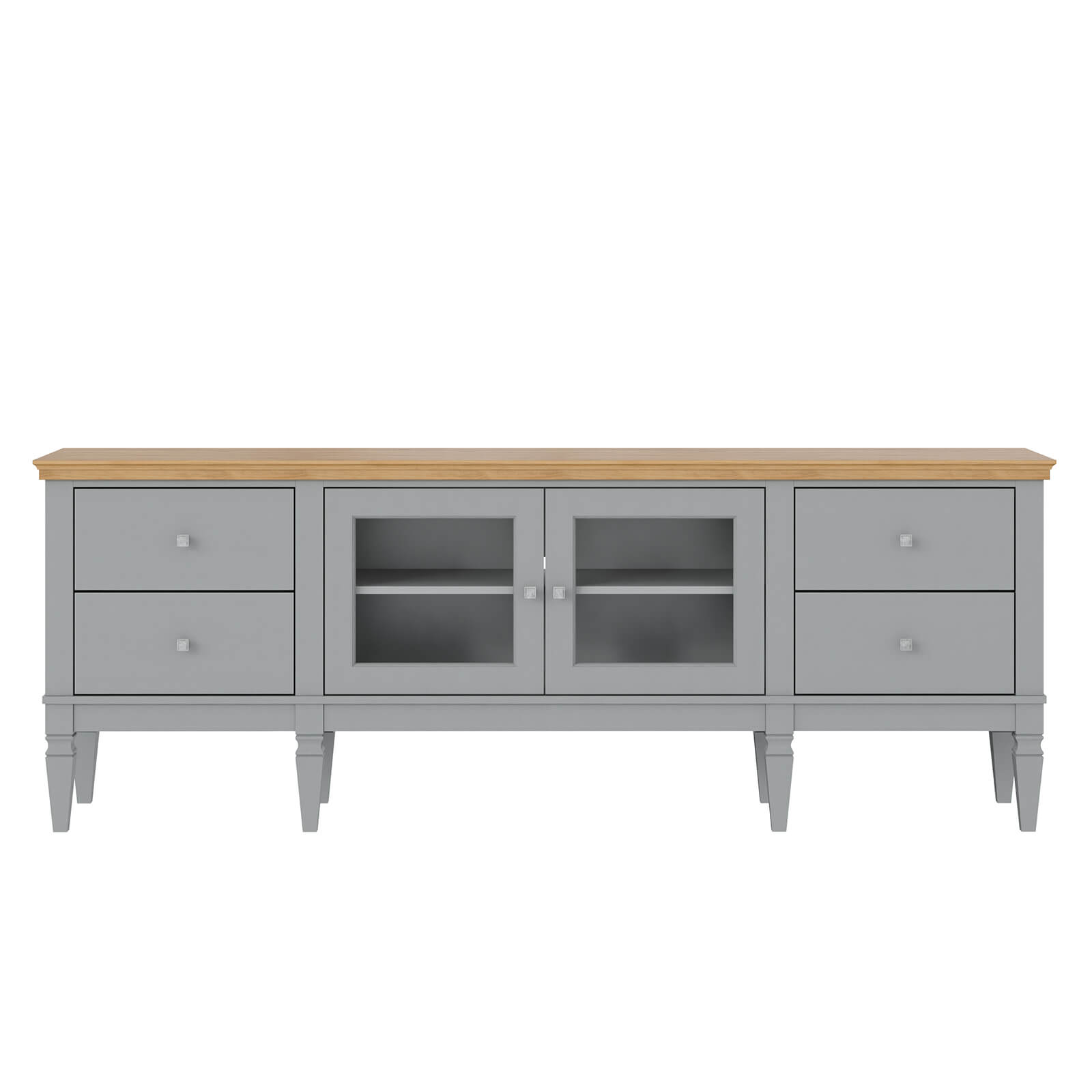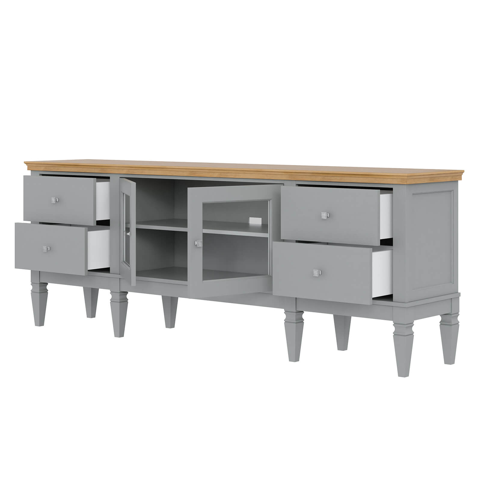 Тумба ТВ состоит из четырех выдвижных ящиков и одной полки за двумя стеклянными дверками.